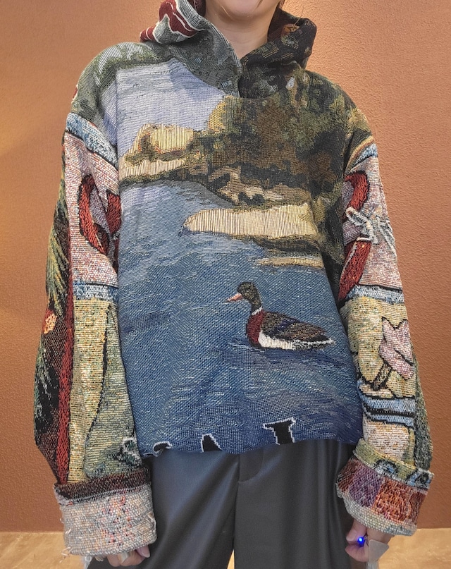 ヴィンテージのブランケットを使用したフード付きリメイクプルオーバートップス。素材はコットンのようです。裾にゴムが通っておりぎゅっと絞ることによりシルエットに変化をつけられます。男女兼用です。ざっくりとした素材の風合いが大人のカジュアルにぴったりです。 コンディション: ★★★★☆ 着用サイズ感: XL 平置き実寸: 肩幅 60cm 身幅 68cm 着丈 66cm 袖丈 64cm 着用スタッフ身長: 161cm