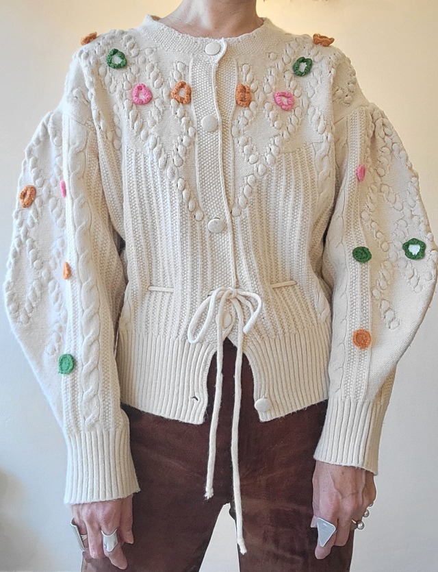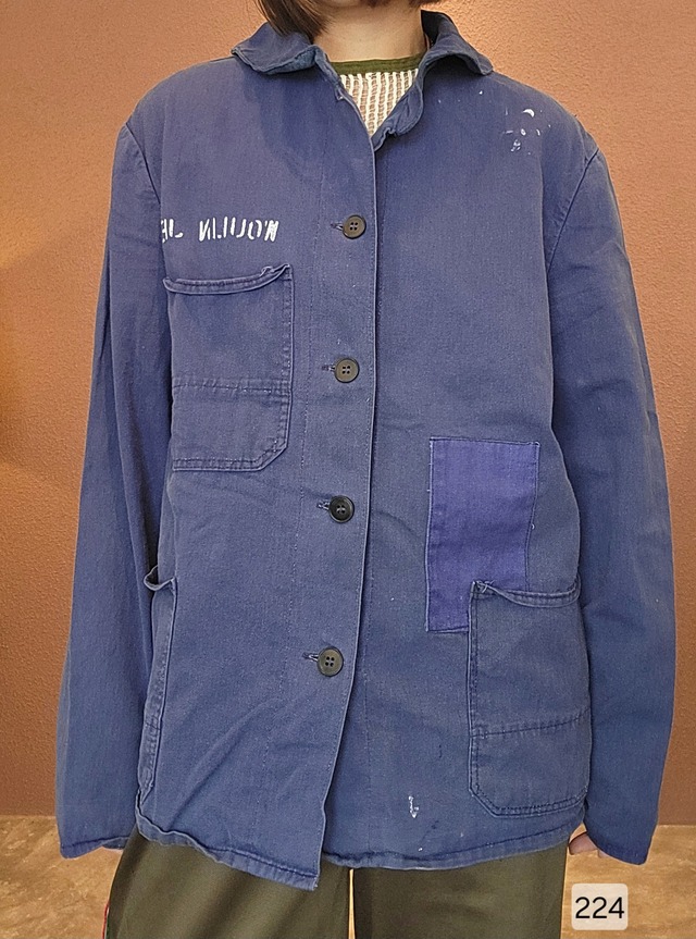 used ユーロワークジャケットの襟を丸襟に、後付けでステンシルを施したプチリメイクジャケット。素材はコットンでシーズン長く着られます。古着のくったり感とフェード具合が良い雰囲気。さっと羽織ってこなれ感の出るアイテムです。カジュアルはもちろん、フェミニンなワンピースやマキシスカートに外しで合わせるのも素敵です。 コンディション: ★★★☆☆ 着用サイズ感: M〜L相当 平置き実寸: 肩幅 50cm 身幅 63cm 着丈 68cm 袖丈 56cm 着用スタッフ身長: 161cm