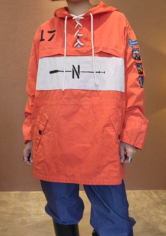 usedのレースアップトップスにステンシルを施したリメイクトップス。素材はやや厚手のしっかりしたコットンで張り感があります。袖口は内側がゴム仕様になっています。男女兼用です。アウトドアテイストを取り入れたカジュアルなスタイリングにぴったりです。 コンディション: ★★★★☆ 着用サイズ感: XL相当 平置き実寸: 肩幅 60cm 身幅 63cm 袖丈 62cm 着丈 84cm 着用スタッフ身長: 161cm