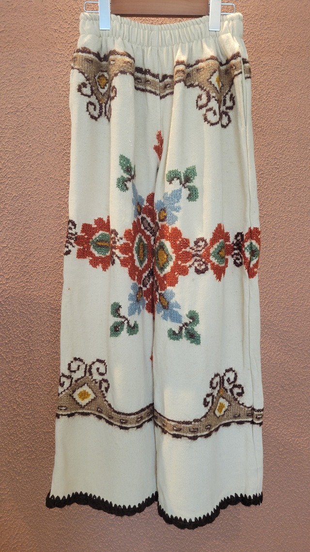 ヴィンテージのブランケットを使用したリメイクイージーパンツ。素材はコットンのようです。ウエストゴム、左右ポケット付き。ひまわりやチェッカーフラッグ等の柄にざっくりとした素材の風合いが大人のカジュアルにぴったりです。•糸つれが数カ所見られます。画像でご確認ください。 コンディション: ★★★☆☆ 着用サイズ感: M相当 平置き実寸: ウエスト(ゴム) 31〜49cm ヒップ 54cm 股上 30cm 股下 64cm わたり 30cm 裾幅 26cm 総丈 94cm 着用スタッフ身長: 161cm
