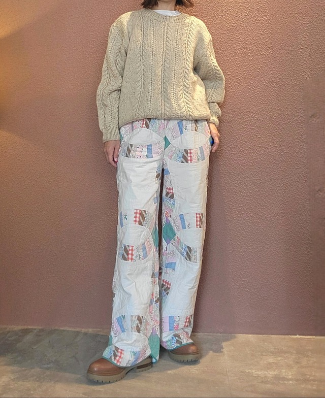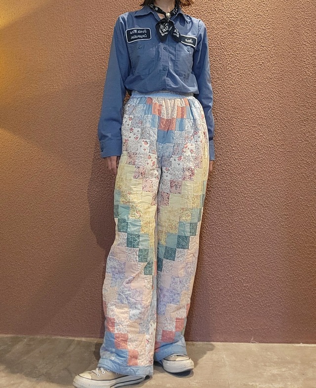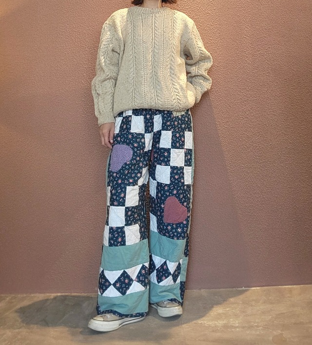 ヴィンテージのパッチワークキルト生地を使用したリメイクイージーパンツ。素材は2枚合わせの中綿入りコットン、ウエストゴム仕様、ポケット無しです。小花柄にハートのモチーフのキルトがオールドアメリカンな雰囲気。着脱しやすく軽量で温かい、普段使いにぴったりの1本です。 コンディション: ★★★★☆ 着用サイズ感: S〜M相当 平置き実寸: ウエスト 27〜47cm ヒップ 55cm 股上 33cm 股下 70cm わたり幅 34cm 裾幅 27cm 総丈 98cm 着用スタッフ: 身長161cm