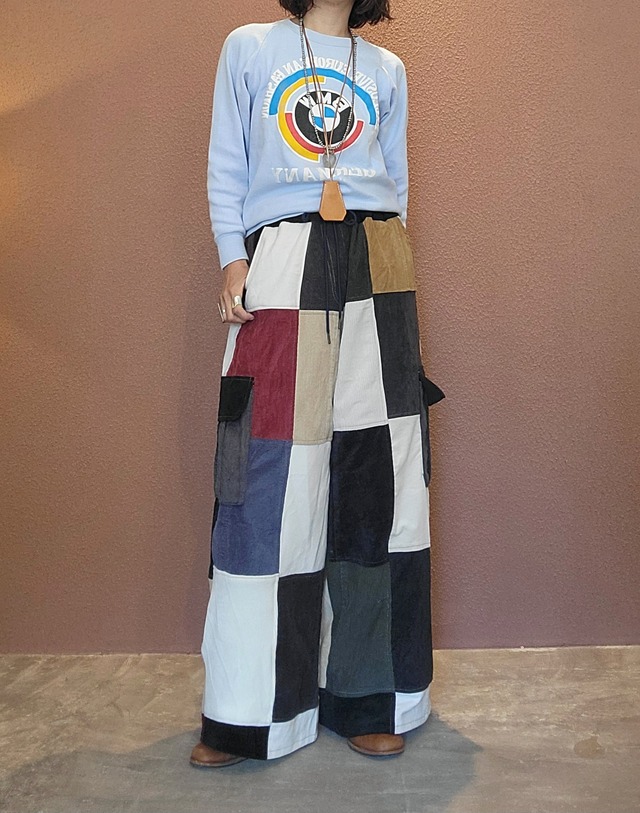 コーデュロイのリメイクパッチワークパンツ。コーデュロイやベロア素材の布片をいくつも繋ぎ合わせたリメイクパンツです。ウエストはゴムとドローコードによりサイズの調整が可能です。大きめサイズの極太シルエットで男性はもちろん、女性がウエストをぎゅっと絞りオーバーサイズでの着用も可能です。テクスチャの異なる素材の組み合わせが唯一無二の1本となっています。 コンディション: ★★★★☆ 着用サイズ感: L〜XL 平置き実寸: ウエスト 25〜52cm ヒップ 64cm わたり 37cm 股上 40cm 股下 60cm 総丈 98cm 着用スタッフ身長: 161cm