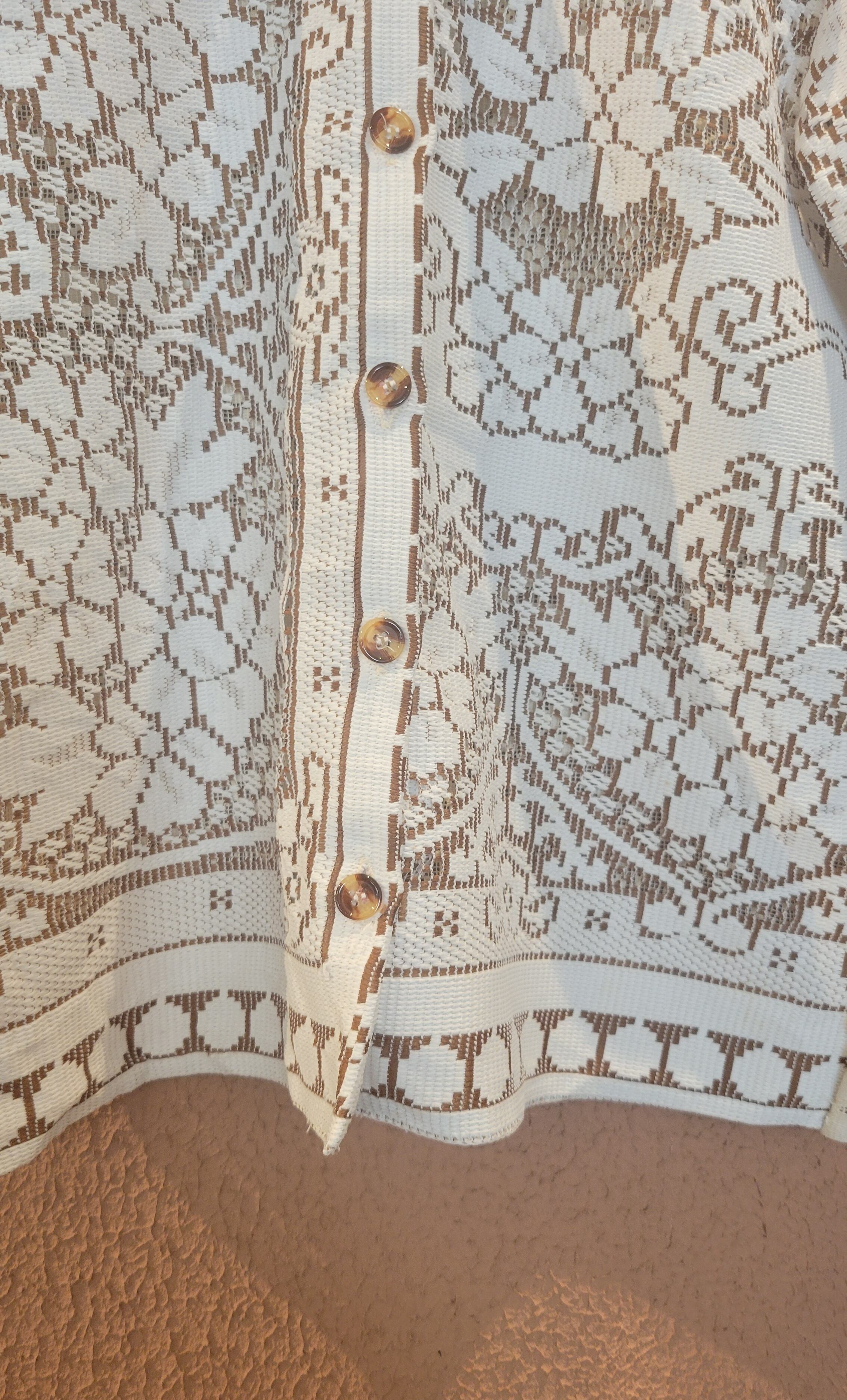 ヴィンテージレースを使用したリメイクシャツ。素材表記はありませんがコットンとポリエステルの混紡のようです。軽くて柔らかい素材感です。前身ごろ、袖、後ろ身ごろで異なるレースが使用され、インナーに暗めのカラーを合わせるとレースの美しい柄が浮き上がります。夏は涼しく着られ、カジュアルにもきれいめにも幅広いスタイリングが楽しめます。*首後ろあたりに小さなレースのダメージとシミがあります。画像でご確認ください。