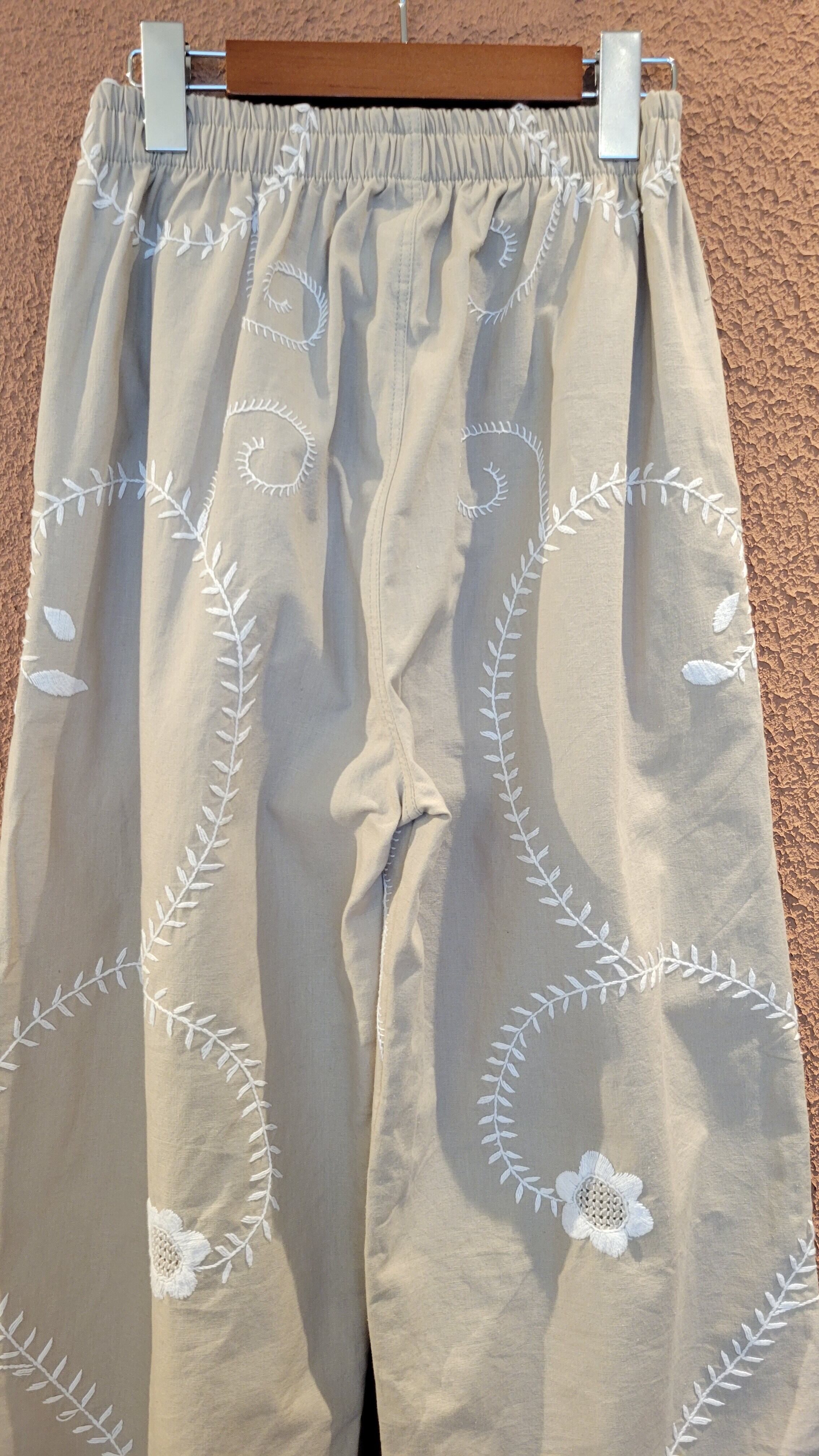 ヴィンテージの刺繍クロスを使用したリメイクイージーパンツ。素材表記はありませんがコットンのようです。やや張り感のあるコットンです。ウエストゴム、左右シームポケット付き。ストレスフリーな履き心地で日常使いにぴったりです。