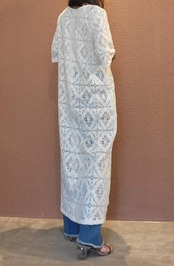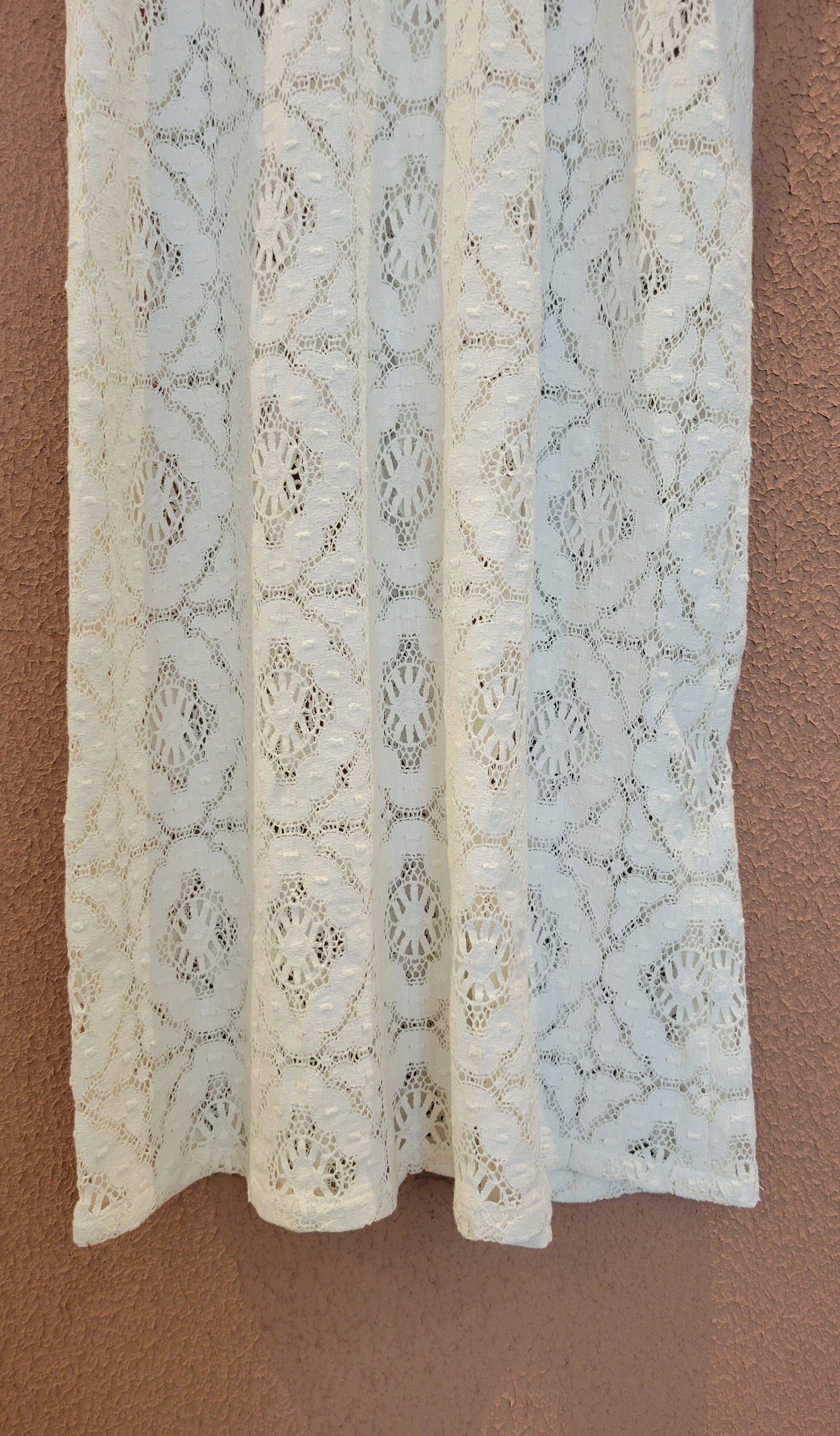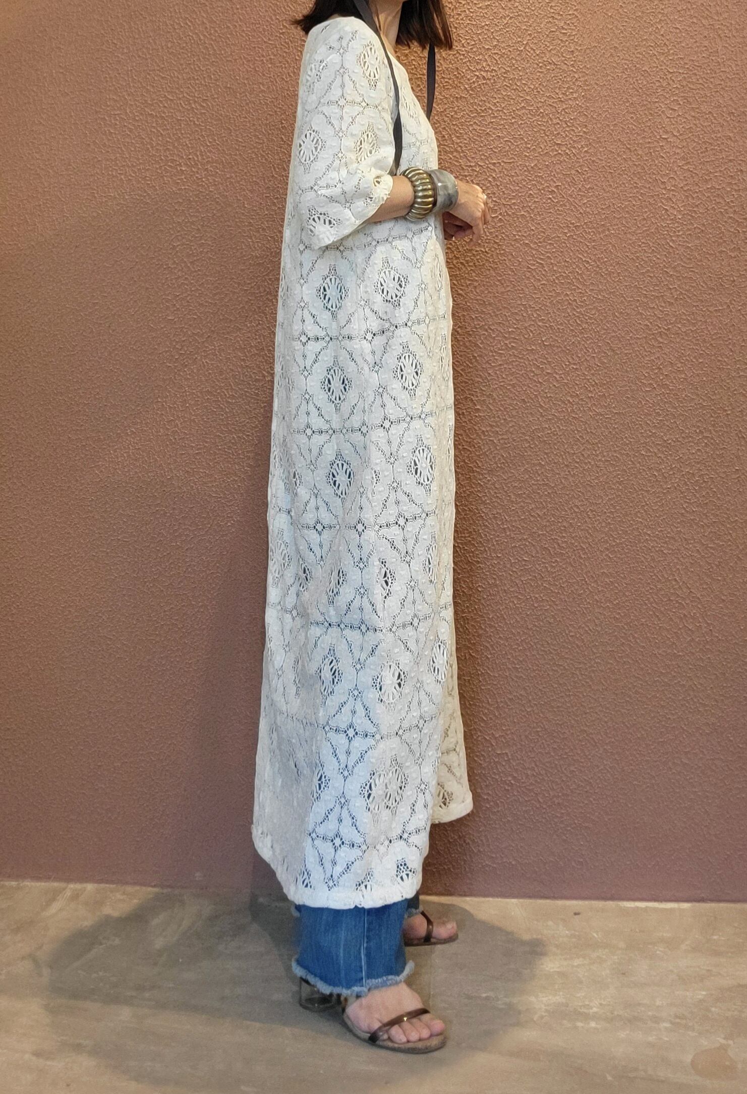 ヴィンテージレース生地を使用したリメイクワンピース。素材表記はありませんがコットンのようです。ファスナーは付いておらず頭から被って着用する仕様です。締め付け感無く楽な着心地ながらもきちんと感の出るワンピースです。カジュアルにも綺麗めにも、幅広いスタイリングをお楽しみいただけます。