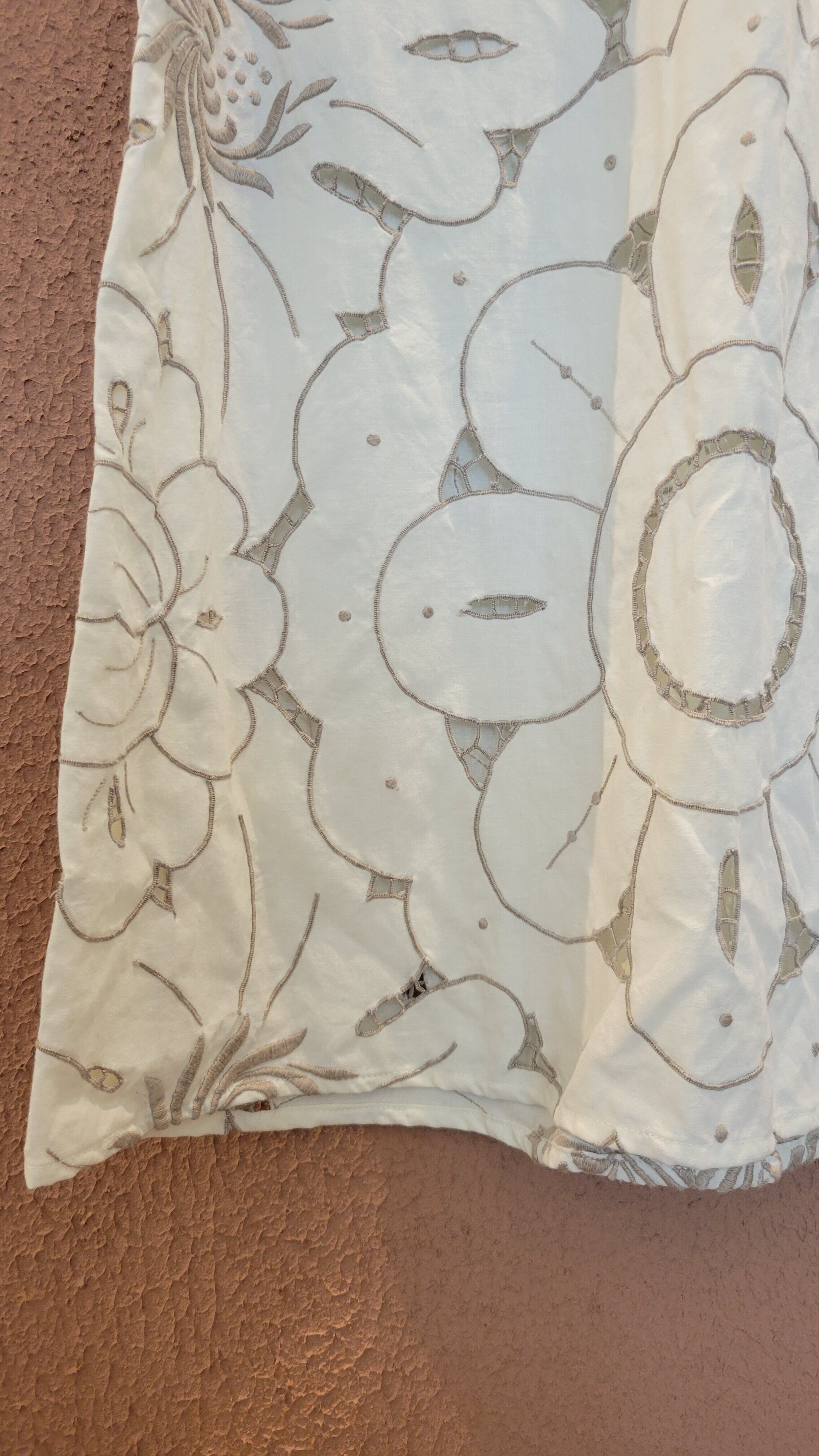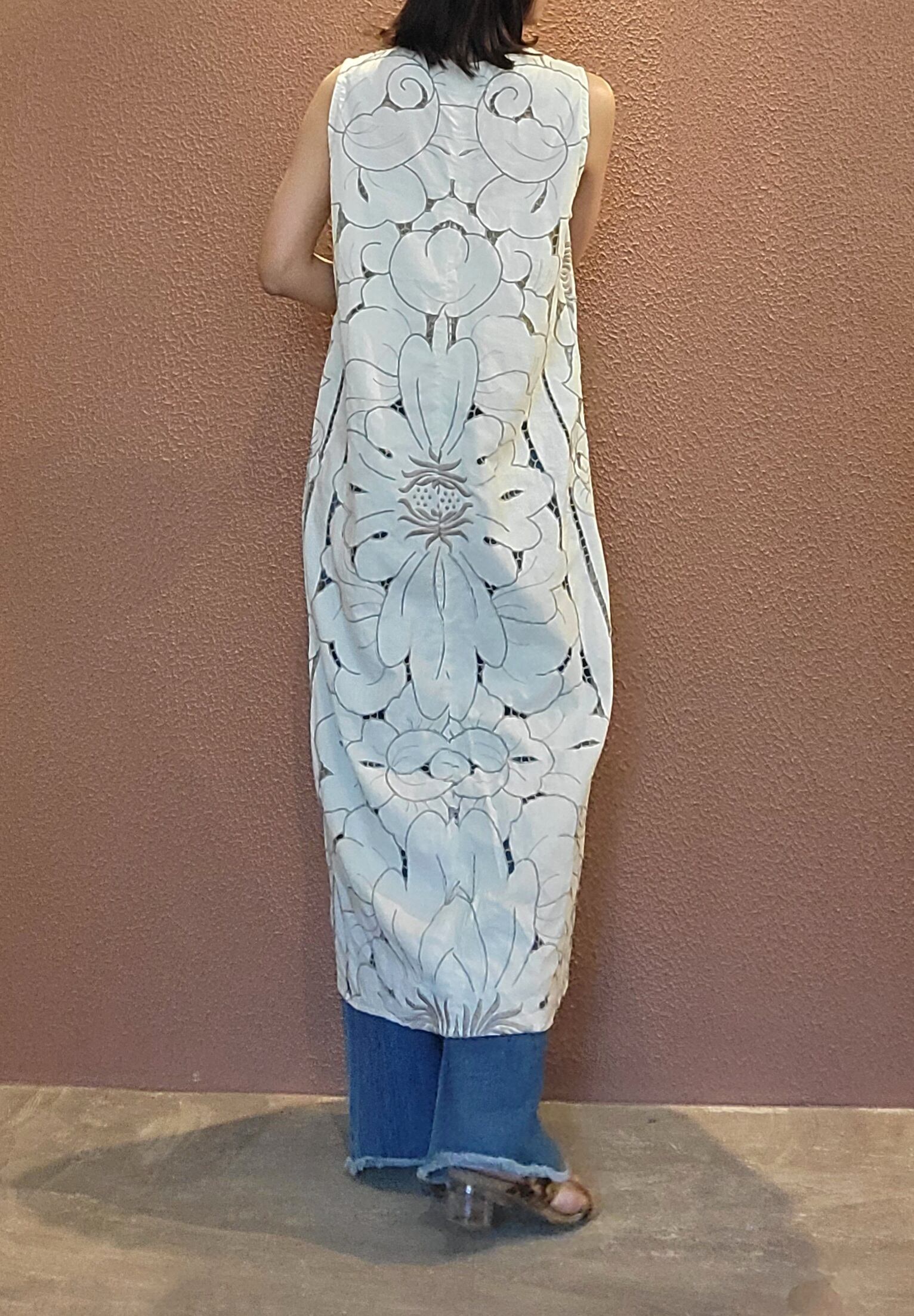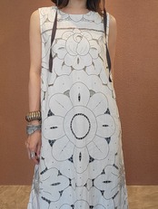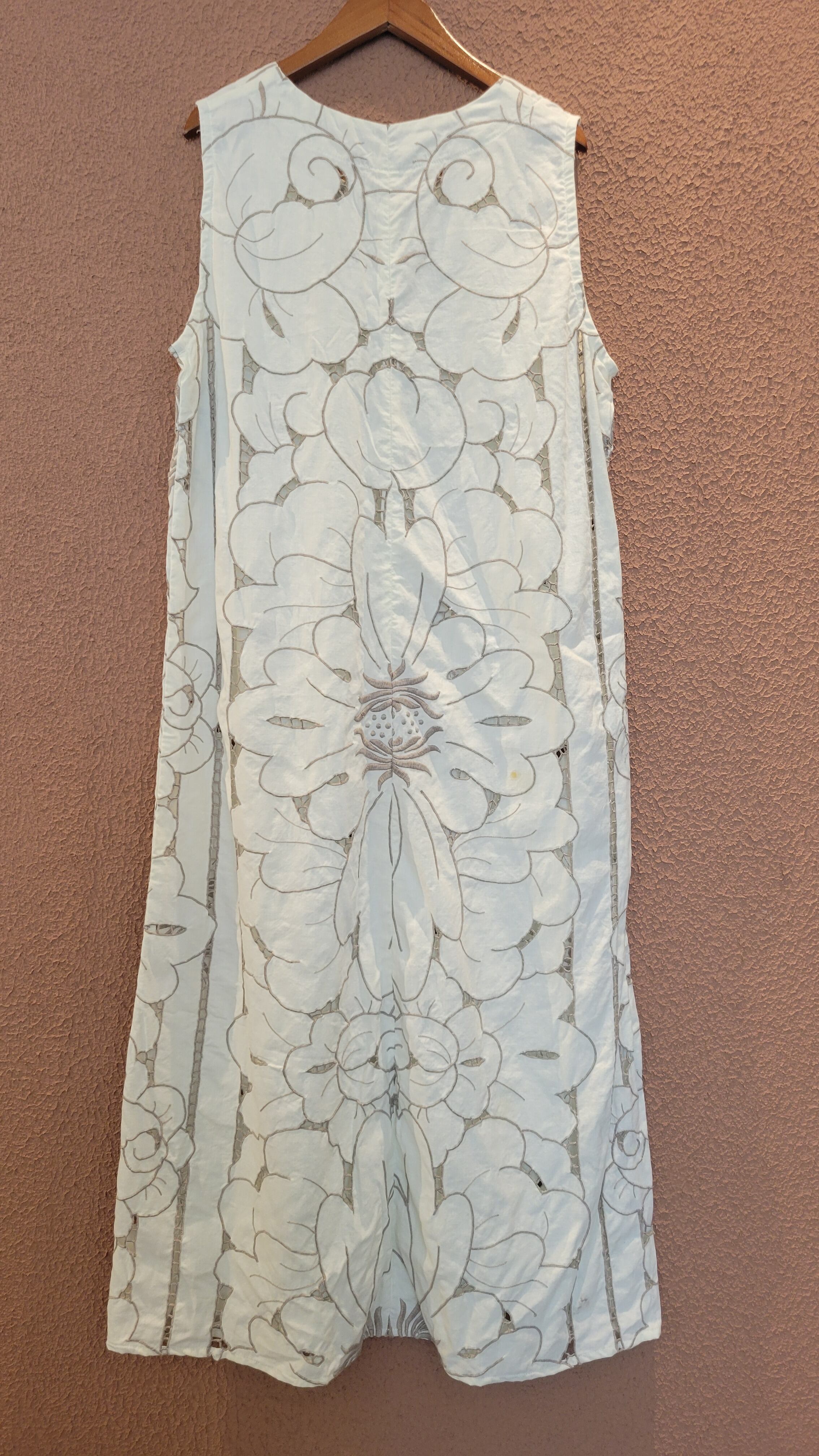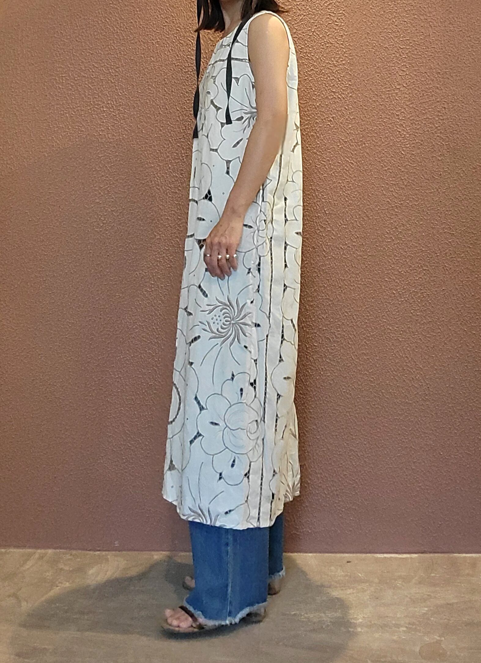 ヴィンテージのカットワークレース生地を使用したリメイクワンピース。素材表記はありませんがコットンのようです。やや張り感があります。ファスナーは付いておらず頭から被って着用する仕様です。締め付け感無く楽な着心地ながらもきちんと感の出るワンピース。カジュアルにも綺麗めにも、幅広いスタイリングをお楽しみいただけます。