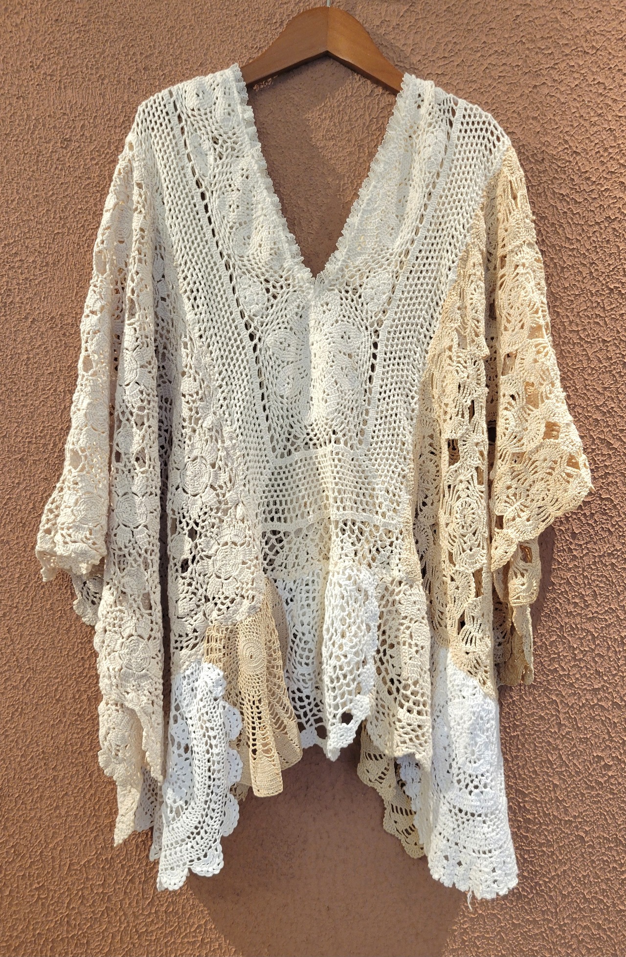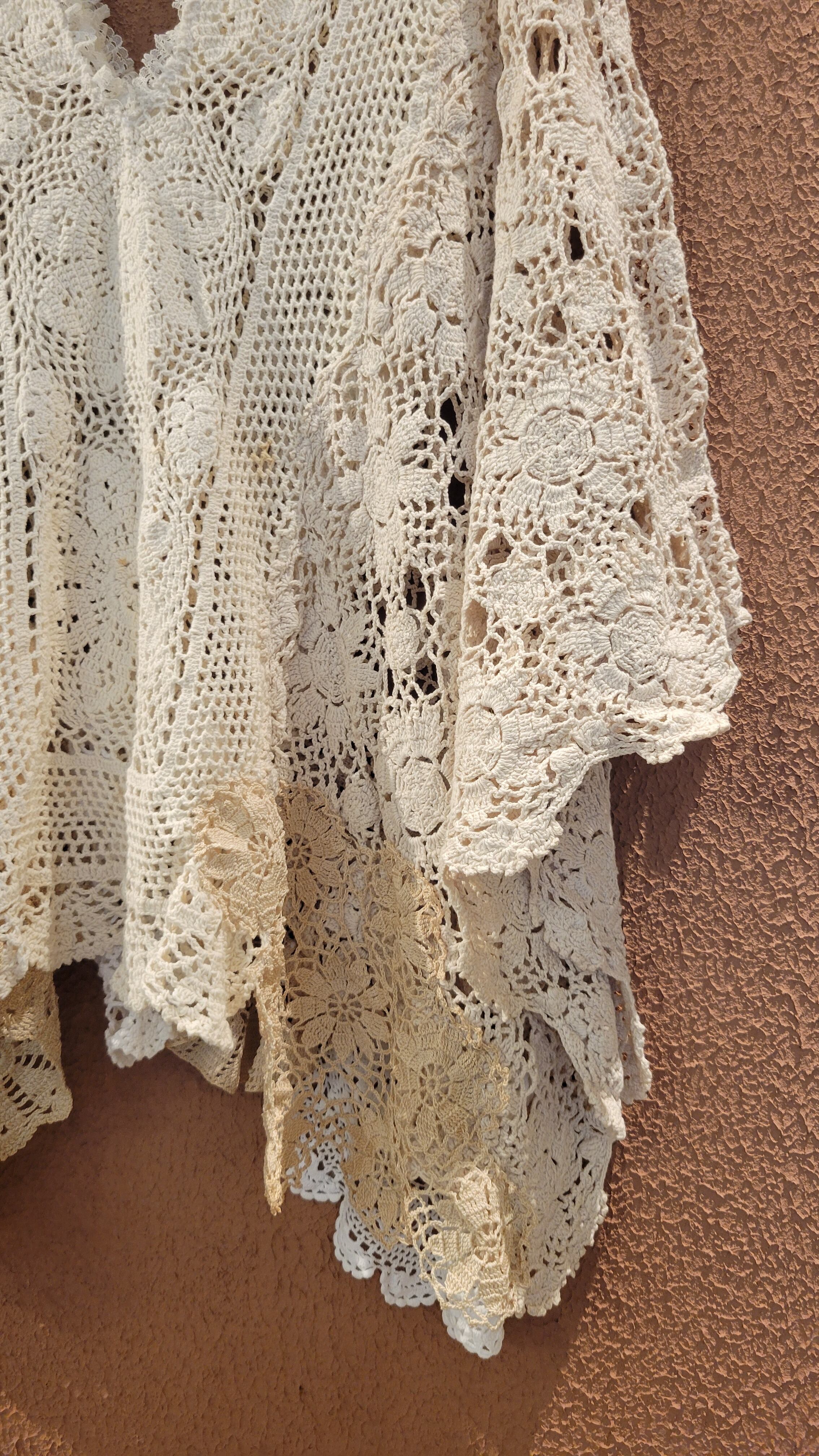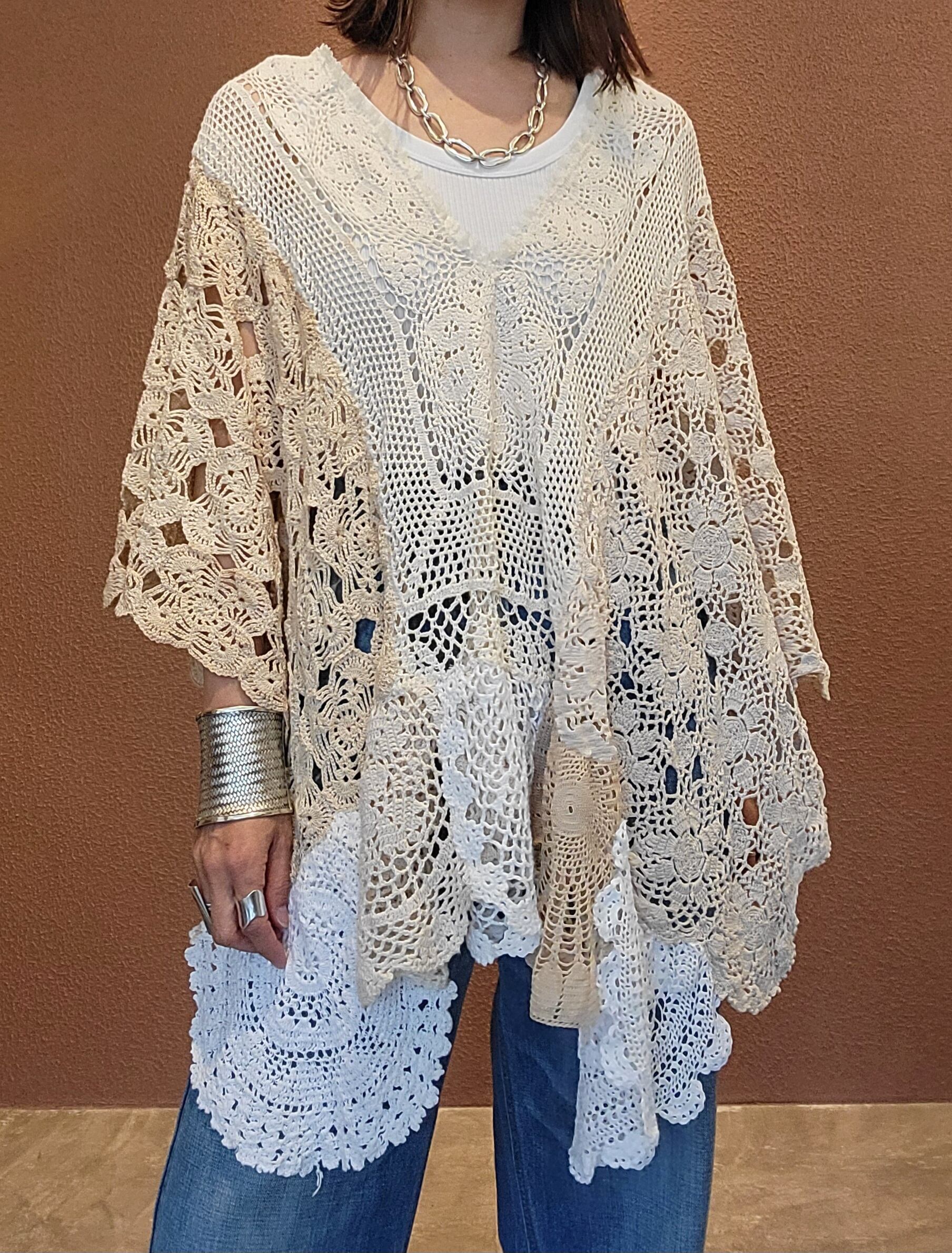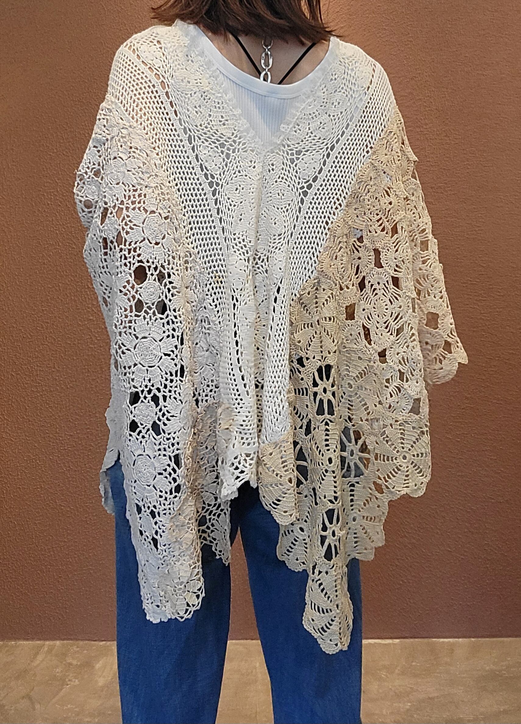 ヴィンテージのクロシェドイリーを何枚も繋げたリメイクポンチョ。素材表記はありませんがコットンのようです。サイドオープン、頭から被って着用します。Vネックで程よいリラックス感。中に着るアイテムでカジュアルにもきれいめにもスタイリングできるお役立ちアイテムです。