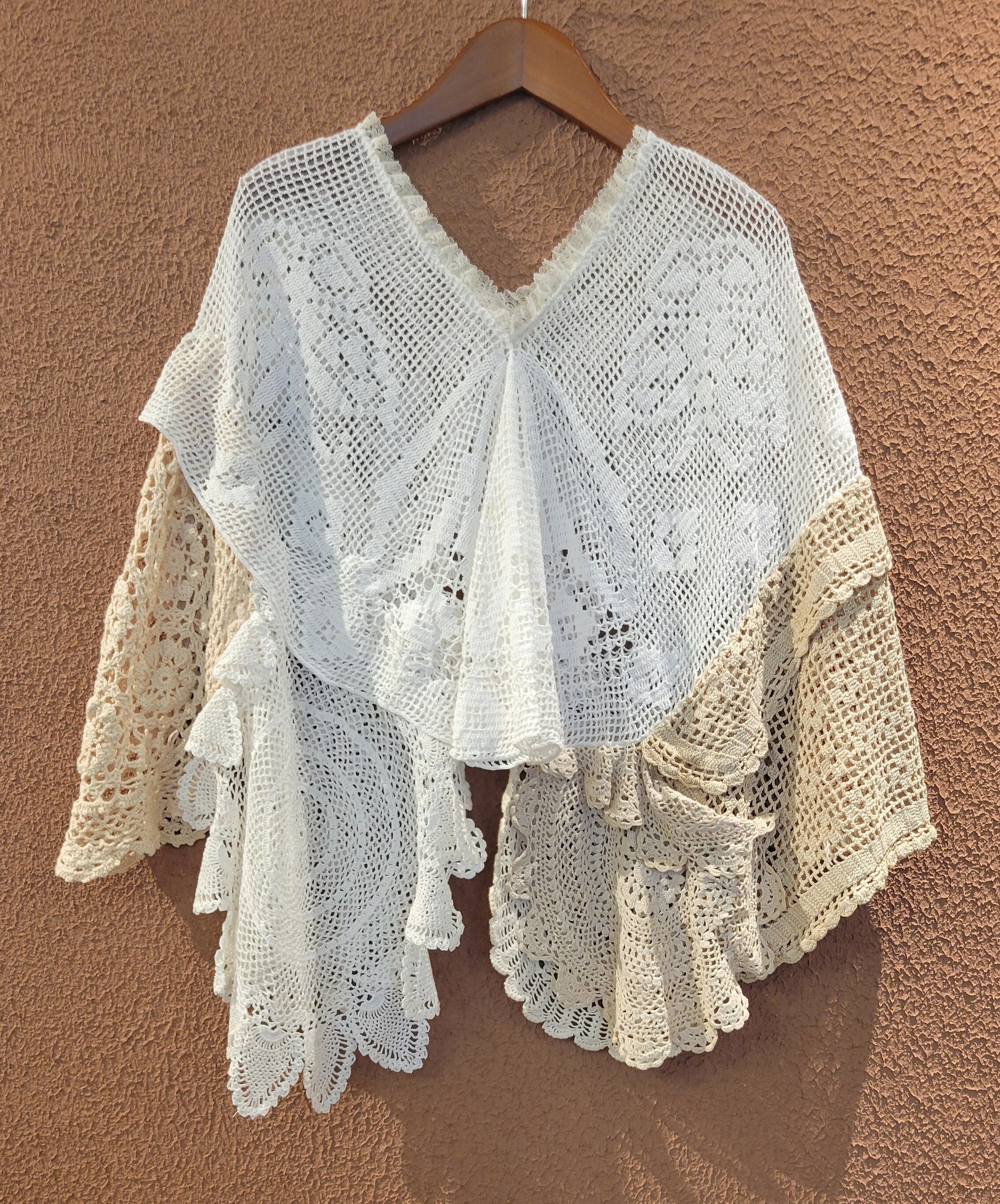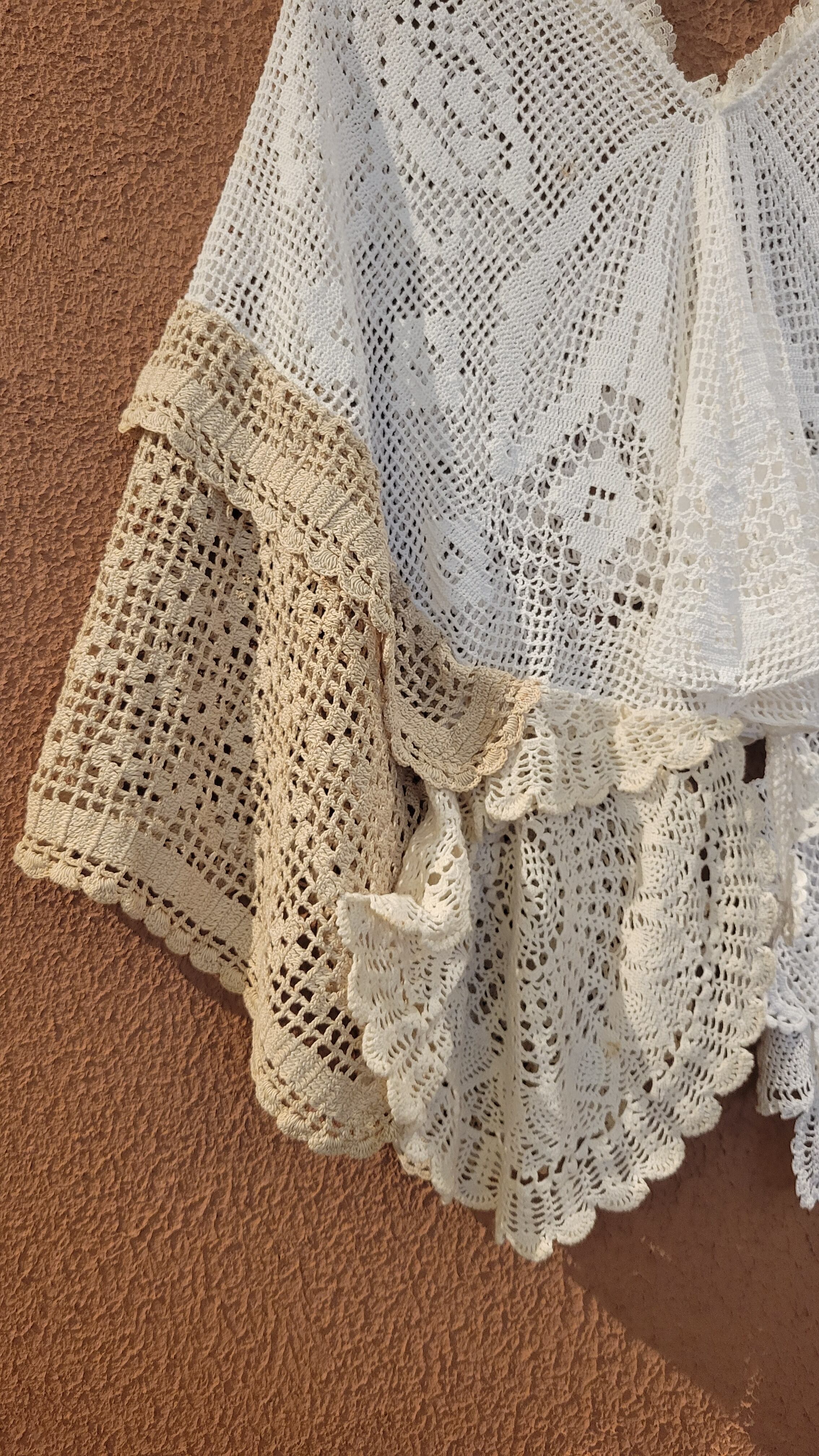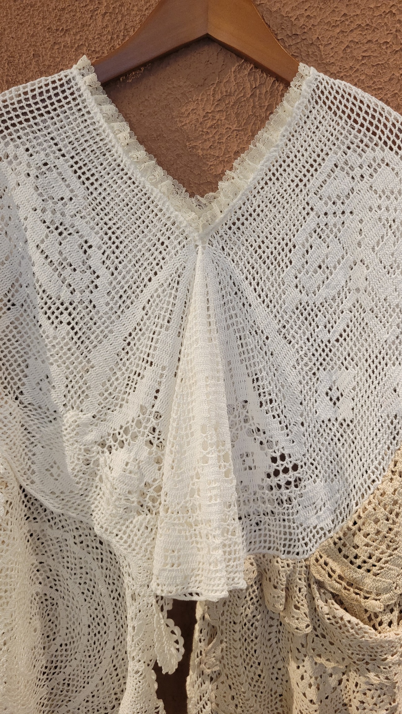 ヴィンテージのクロシェドイリーを何枚も繋げたリメイクポンチョ。素材表記はありませんがコットンのようです。サイドオープン、頭から被って着用します。Vネックで程よいリラックス感。中に着るアイテムでカジュアルにもきれいめにもスタイリングできるお役立ちアイテムです。