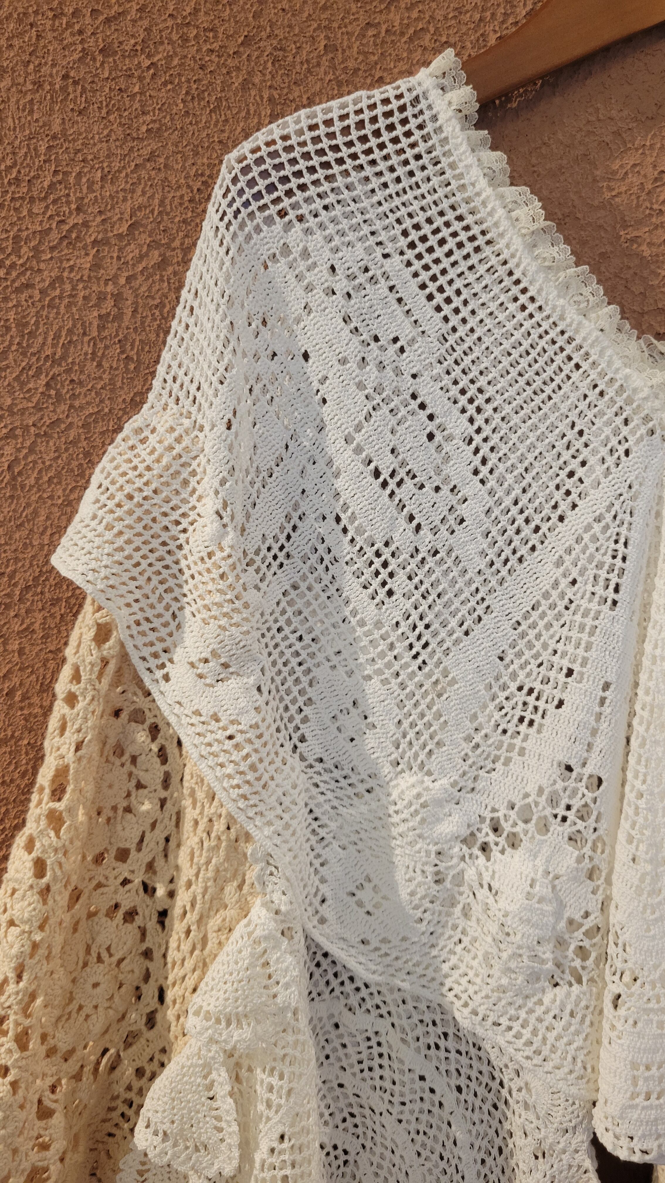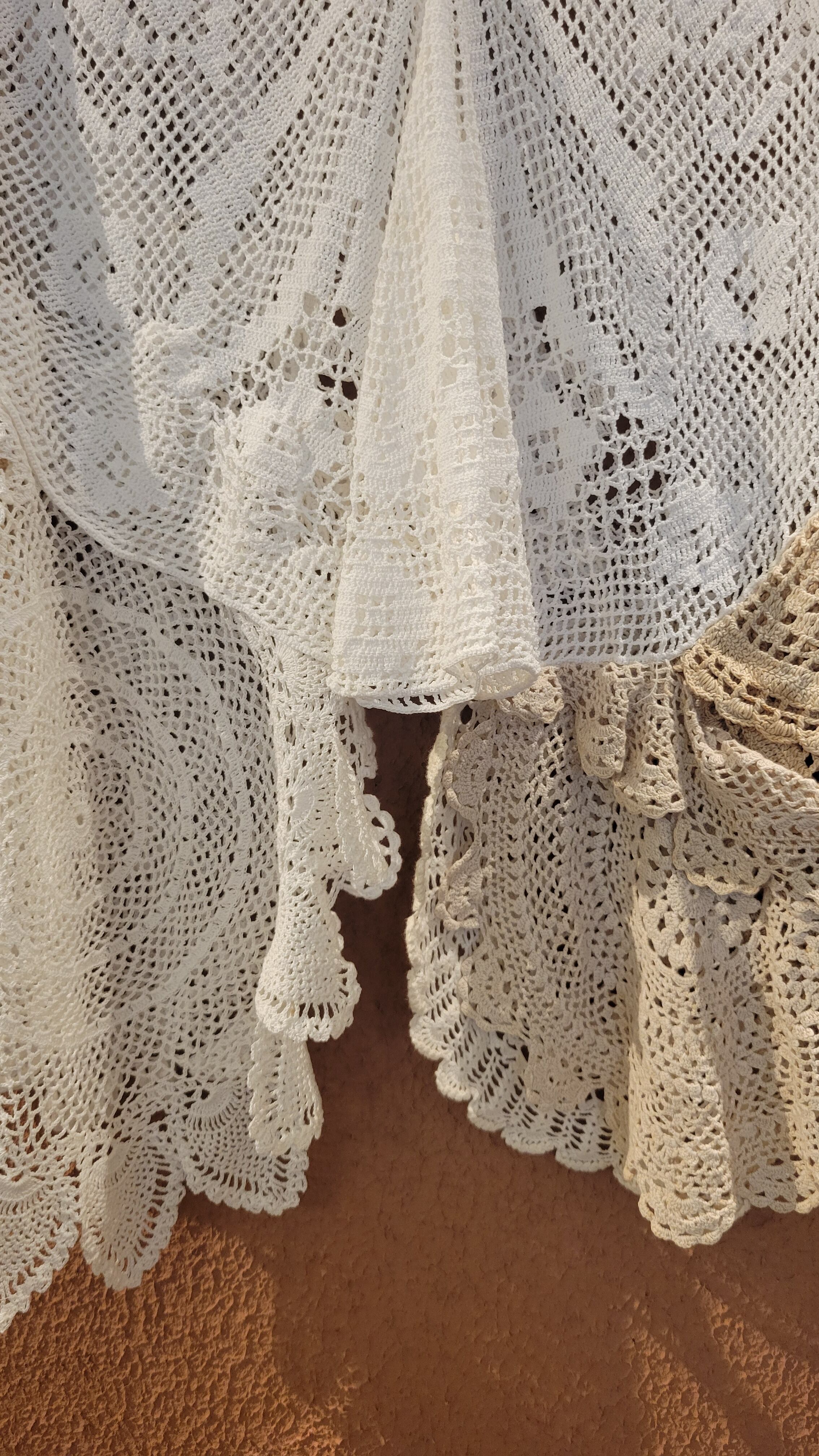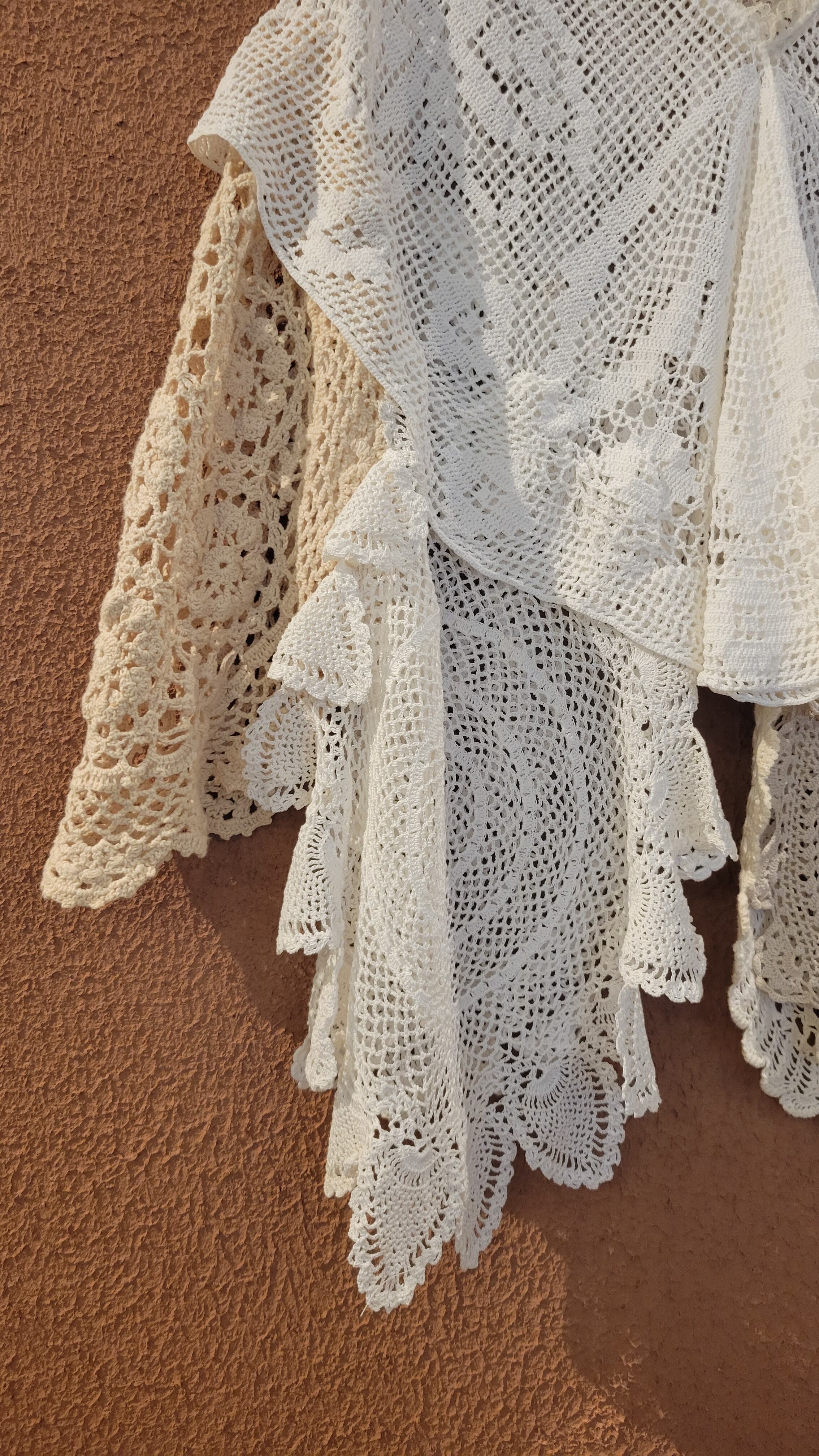 ヴィンテージのクロシェドイリーを何枚も繋げたリメイクポンチョ。素材表記はありませんがコットンのようです。サイドオープン、頭から被って着用します。Vネックで程よいリラックス感。中に着るアイテムでカジュアルにもきれいめにもスタイリングできるお役立ちアイテムです。