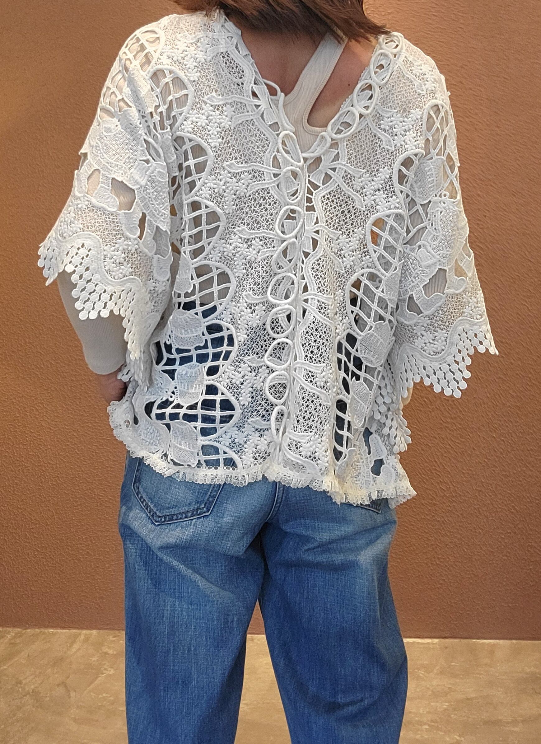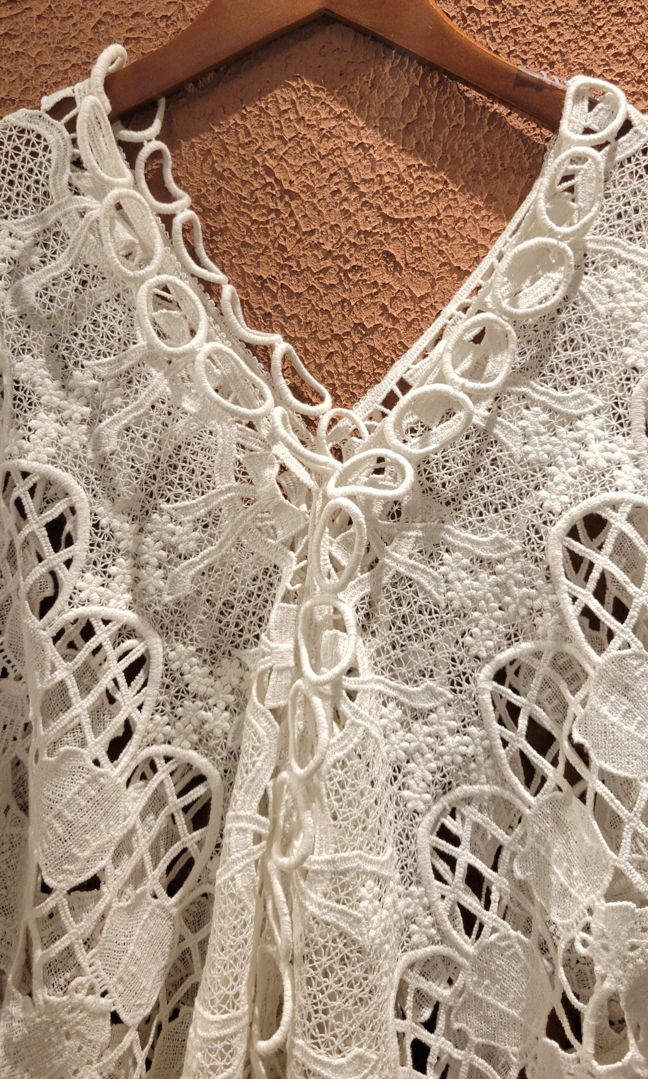 ヴィンテージのレース生地を使用したリメイクトップス。ポンチョのように見えますが脇下で縫い止めされており腕を通せる仕様になります。素材表記はありませんがコットンのようです。Vネックで程よいリラックス感。中に着るアイテムでカジュアルにもきれいめにもスタイリングできます。