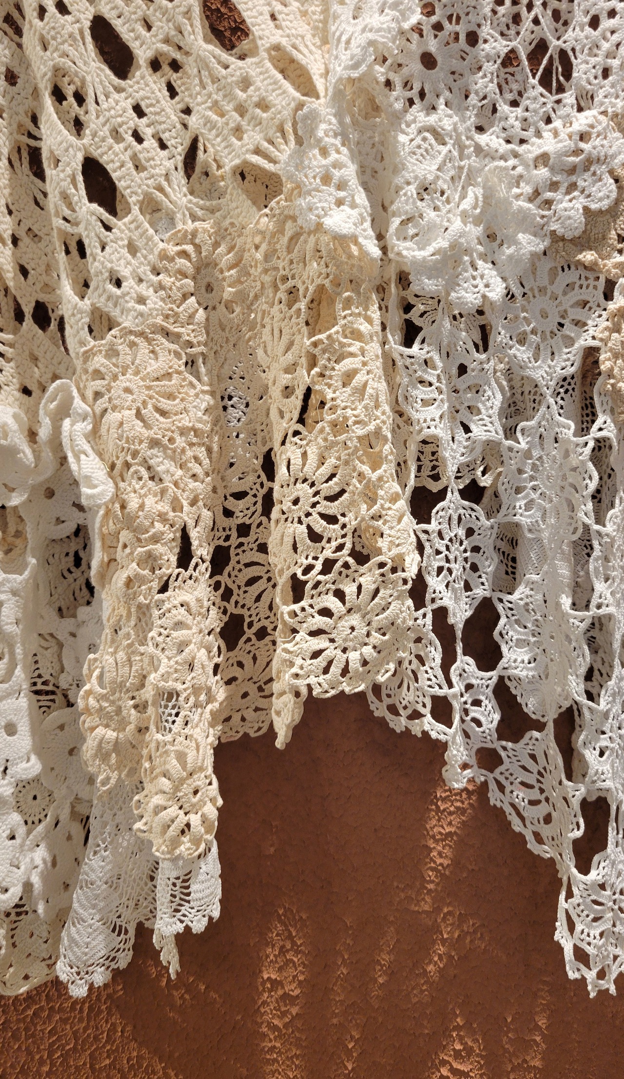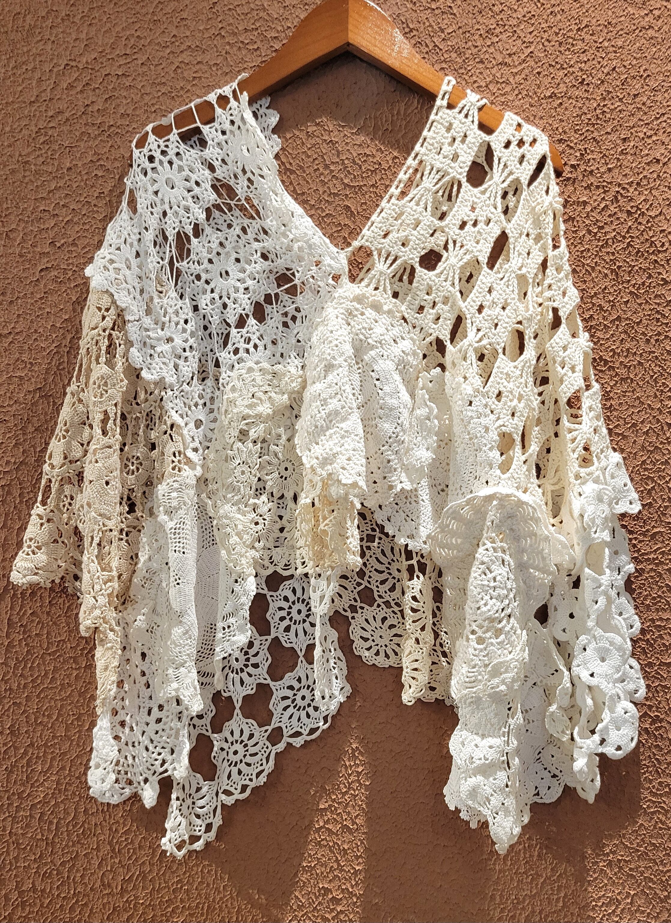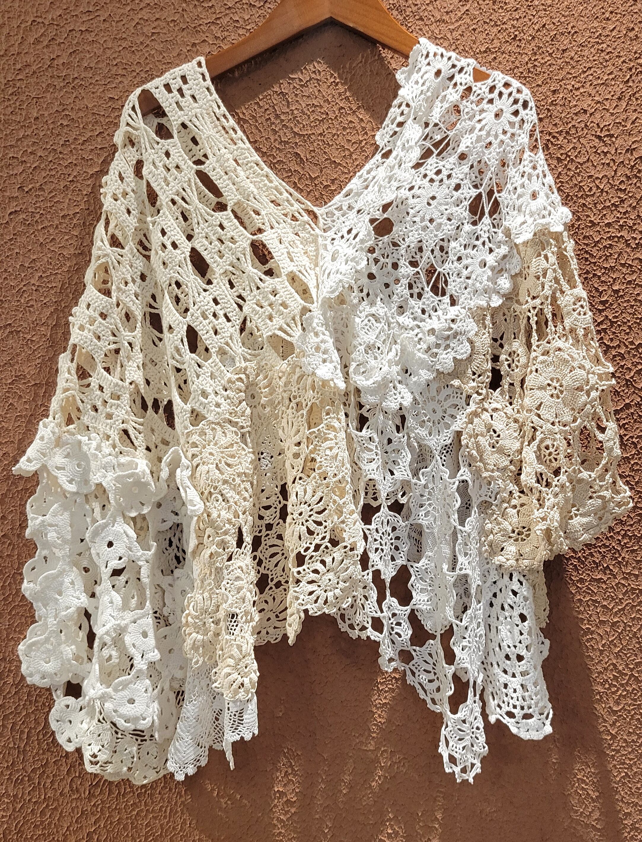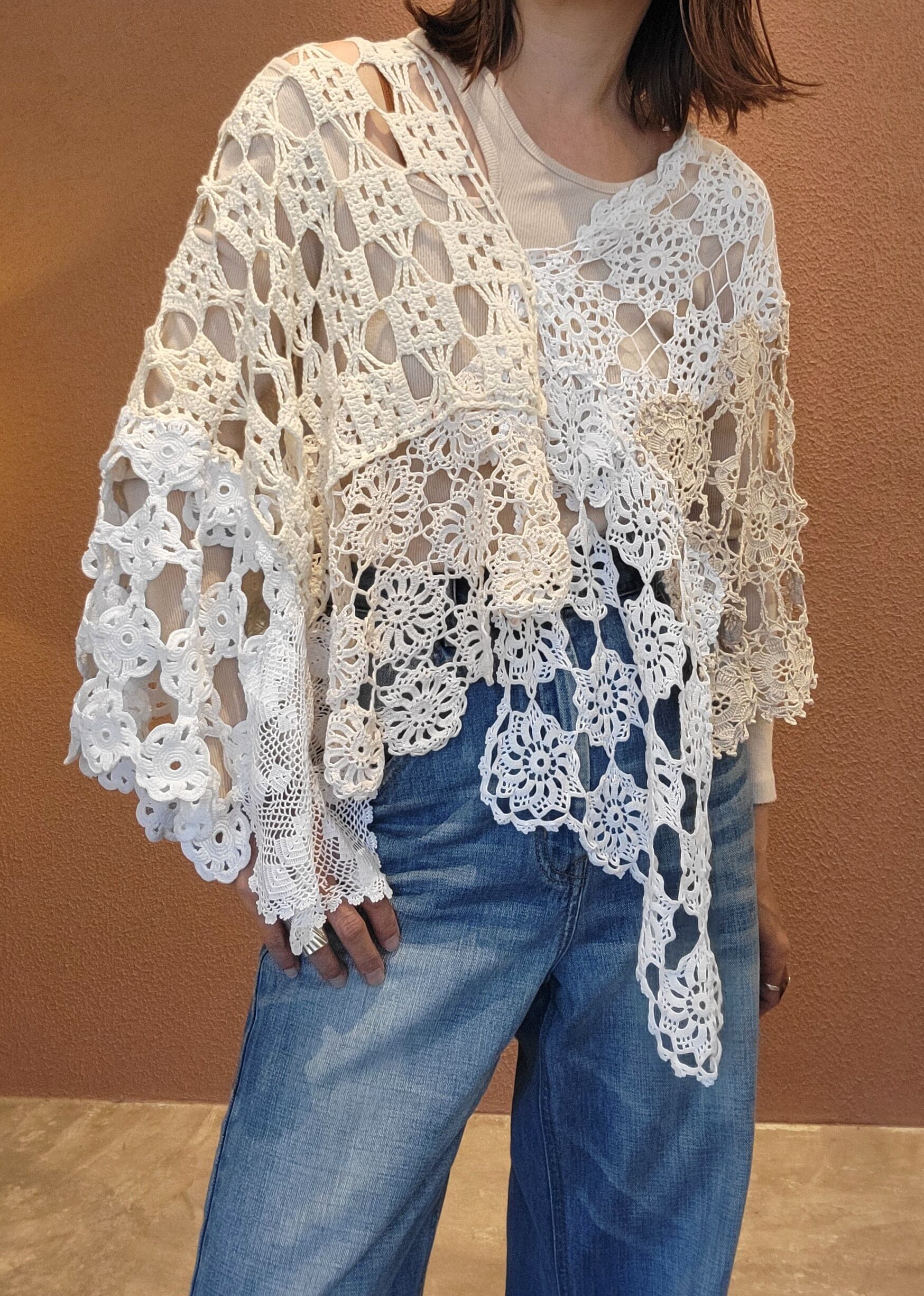ヴィンテージのクロシェ生地を何枚も繋げたリメイクポンチョ。素材表記はありませんがコットンのようです。サイドオープン、頭から被って着用します。Vネックで程よいリラックス感。中に着るアイテムでカジュアルにもきれいめにもスタイリングできるお役立ちアイテムです。