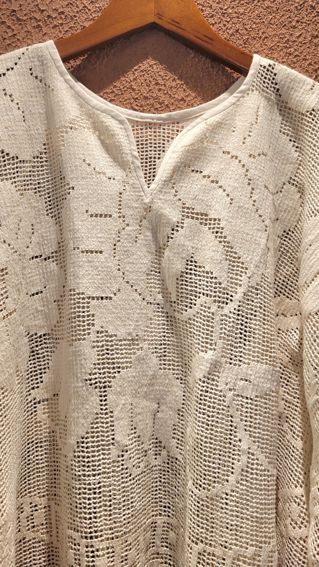 ヴィンテージレースを使用したリメイクトップス。素材表記はありませんがコットンのようです。袖口ゴムでふんわりボリュームのあるデザイン。華やかなレースの柄が美しい、カジュアルにもエレガントにもスタイリングできるトップスです。