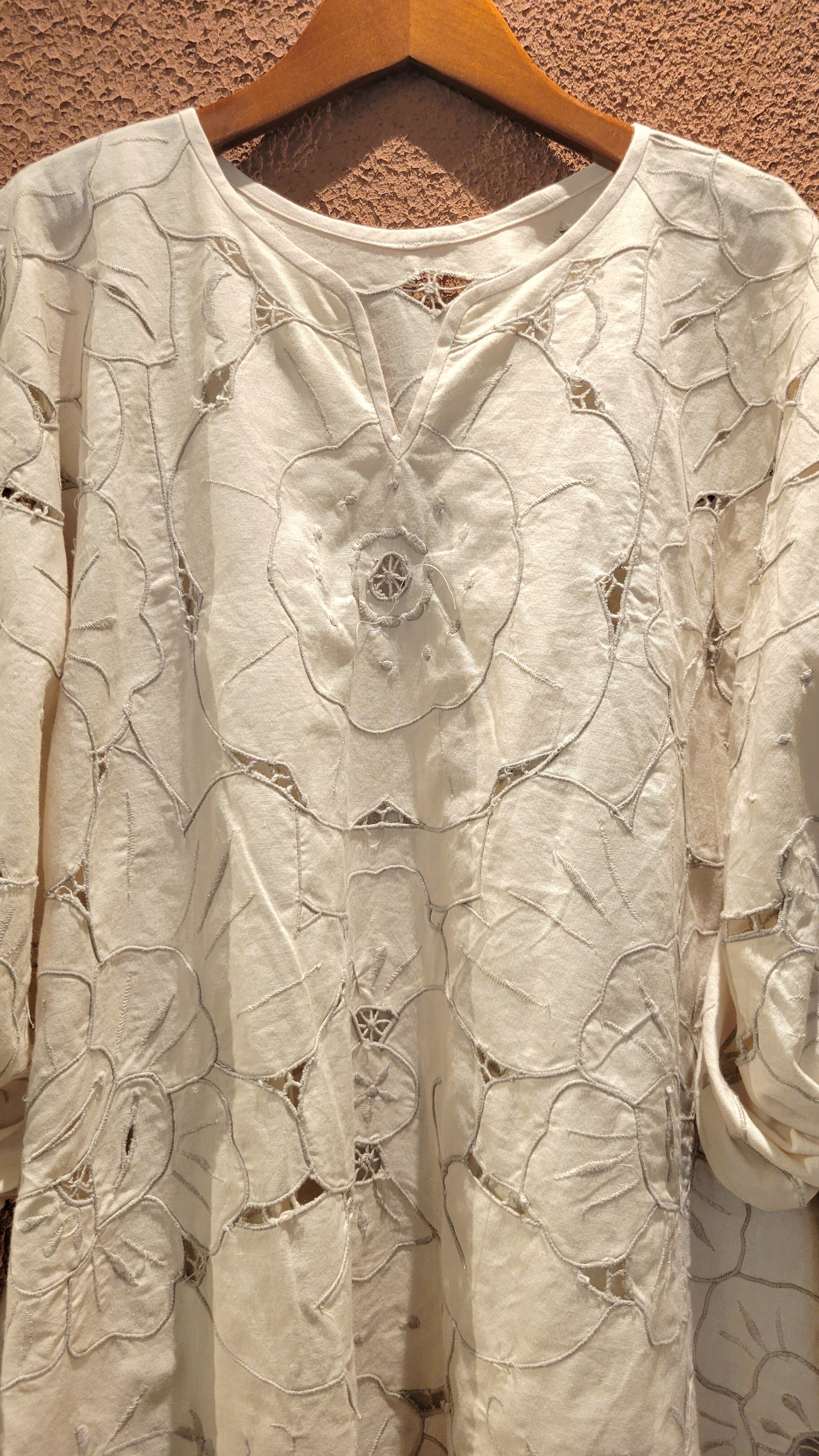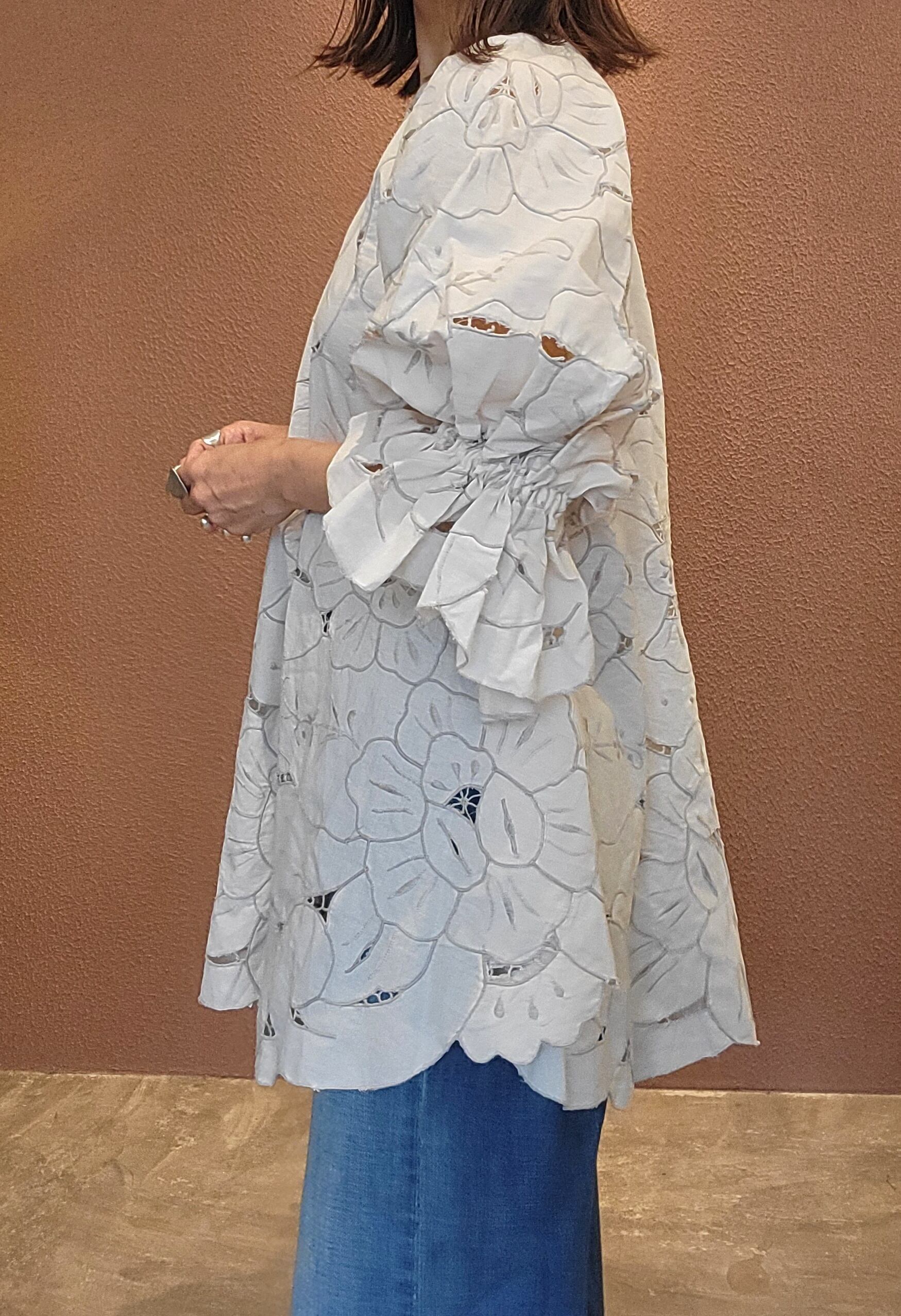 ヴィンテージのバテンレースを使用したリメイクトップス。素材表記はありませんがコットンのようです。張り感があります。袖口ゴムでふんわりボリュームのあるデザイン。大柄なレース模様が華やかな、カジュアルにもエレガントにもスタイリングできるトップスです。