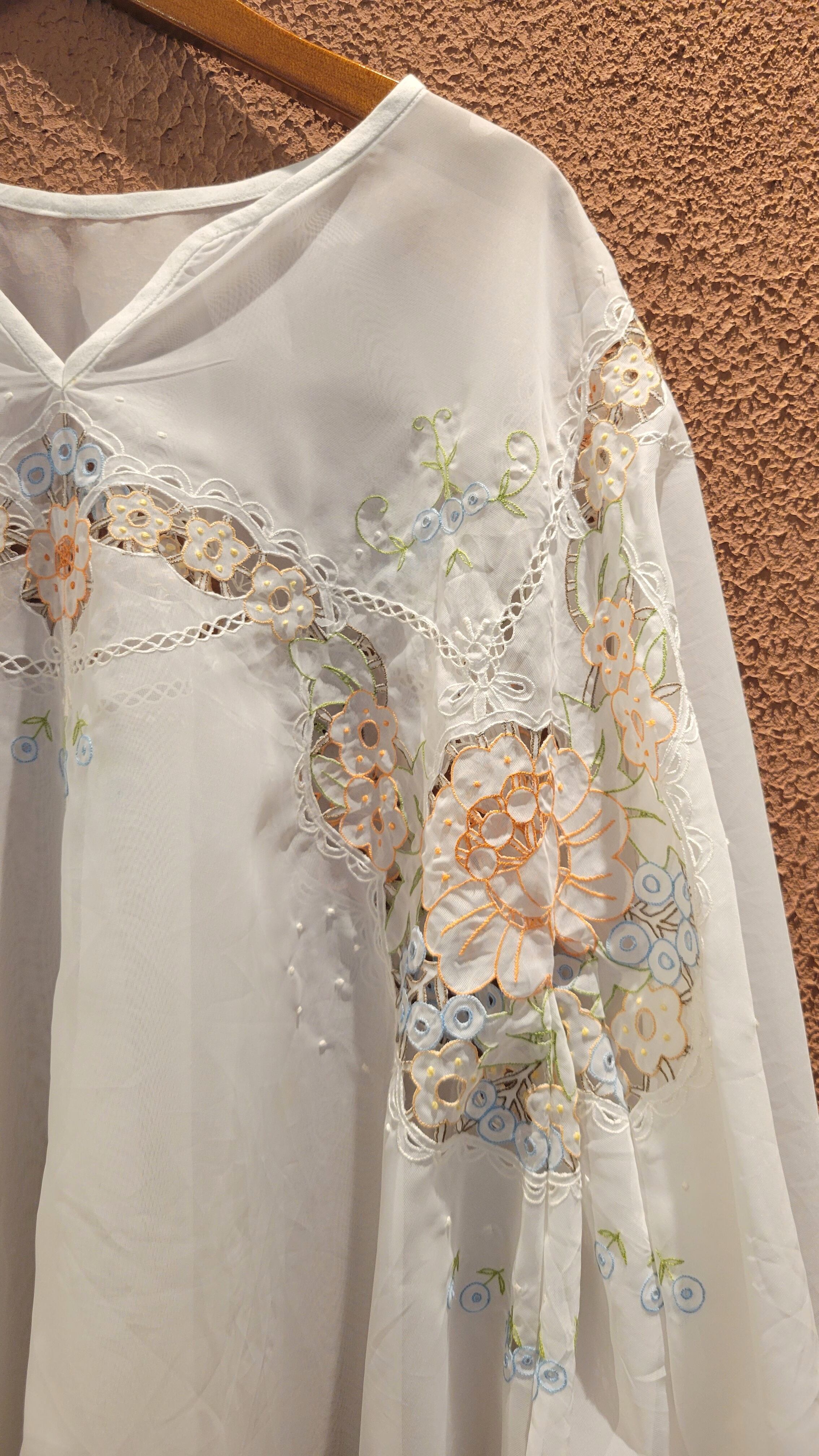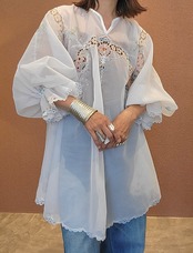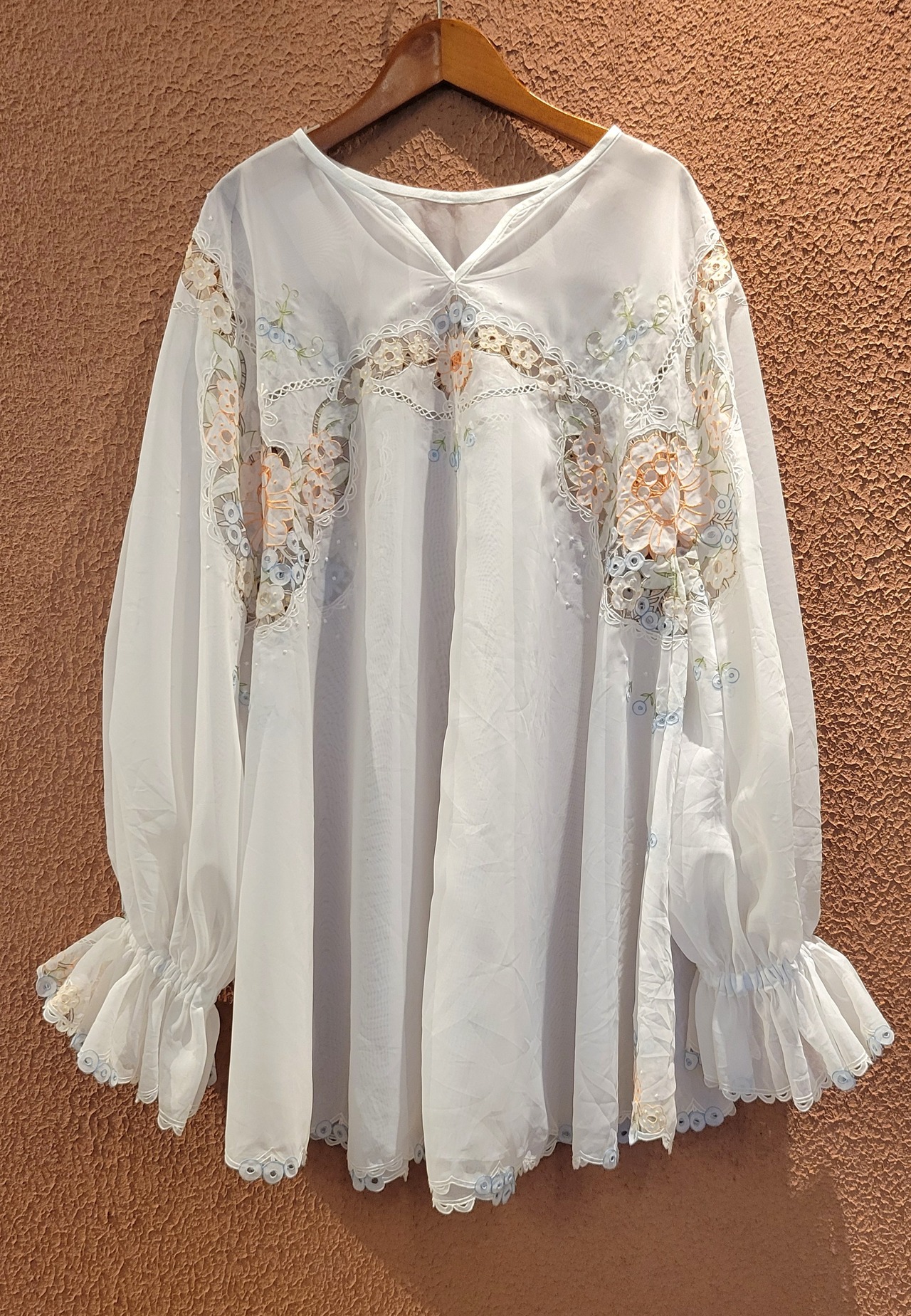ヴィンテージのカットワーク刺繍レース生地を使用したリメイクトップス。素材表記はありませんがポリエステルのようです。透け感があります。袖口ゴムでふんわりボリュームのあるデザイン。優しいカラーの刺繍が繊細で美しい、カジュアルにもエレガントにもスタイリングできるトップスです。