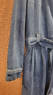 USED デニムジャンプスーツ。珍しい開襟、カシュクール仕様です。やや厚手のデニムで少し重量感がありますが、着用時にストレスに感じるほどではありません。ウエストベルト付き。パンツ部分はウエストタック入りでヒップ周りはゆったり。すっきりきれいめに着られるジャンプスーツです。