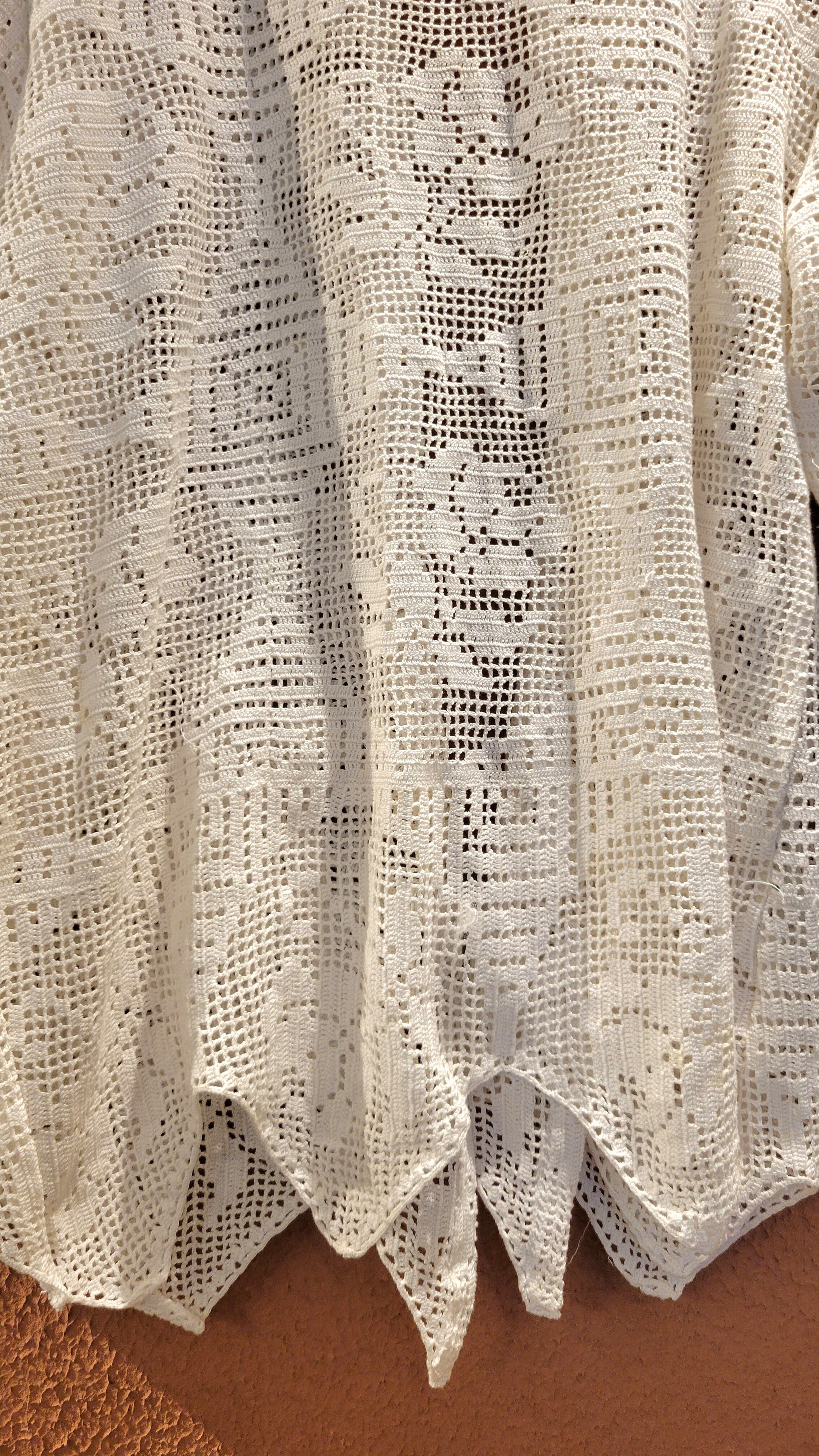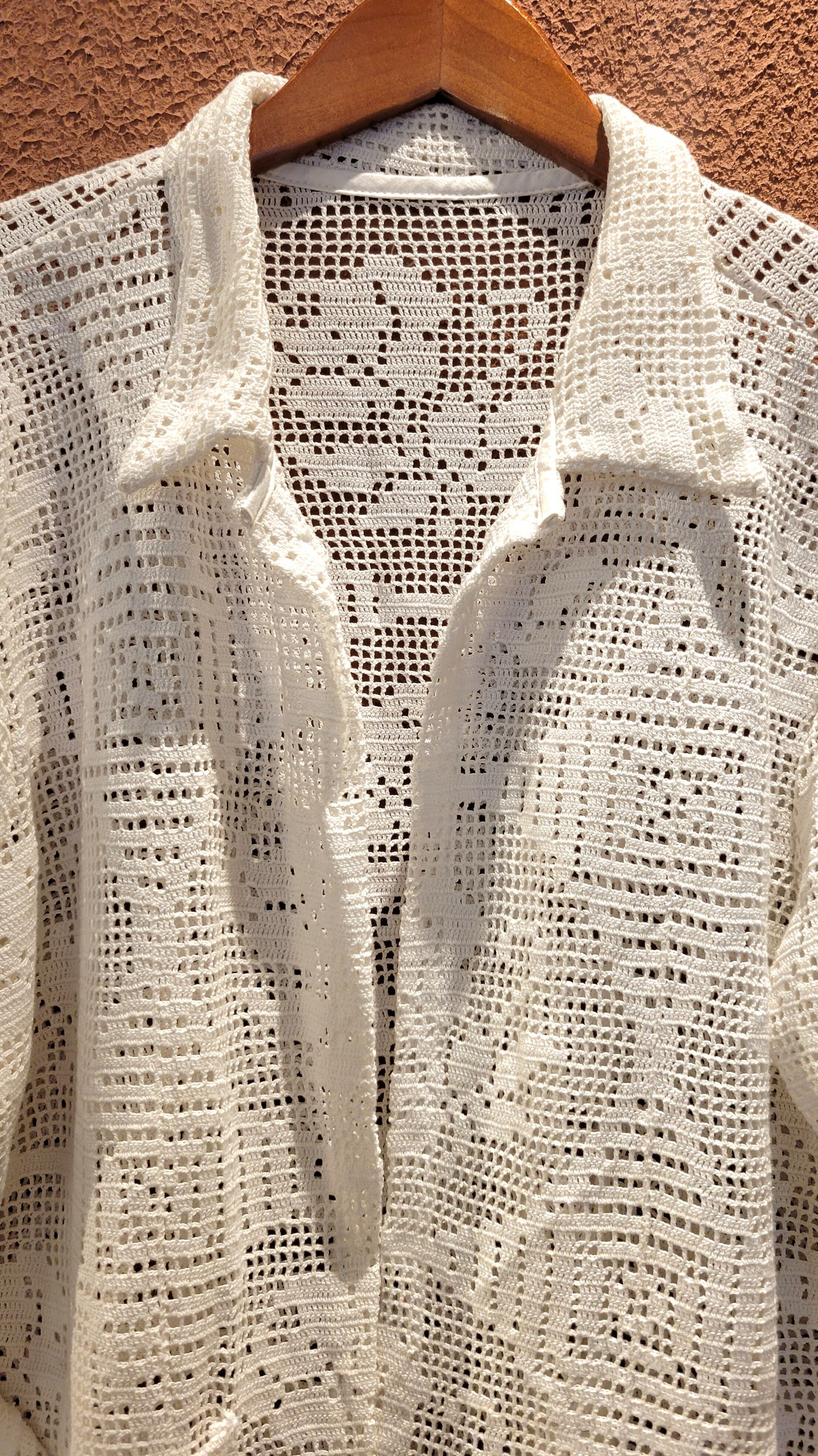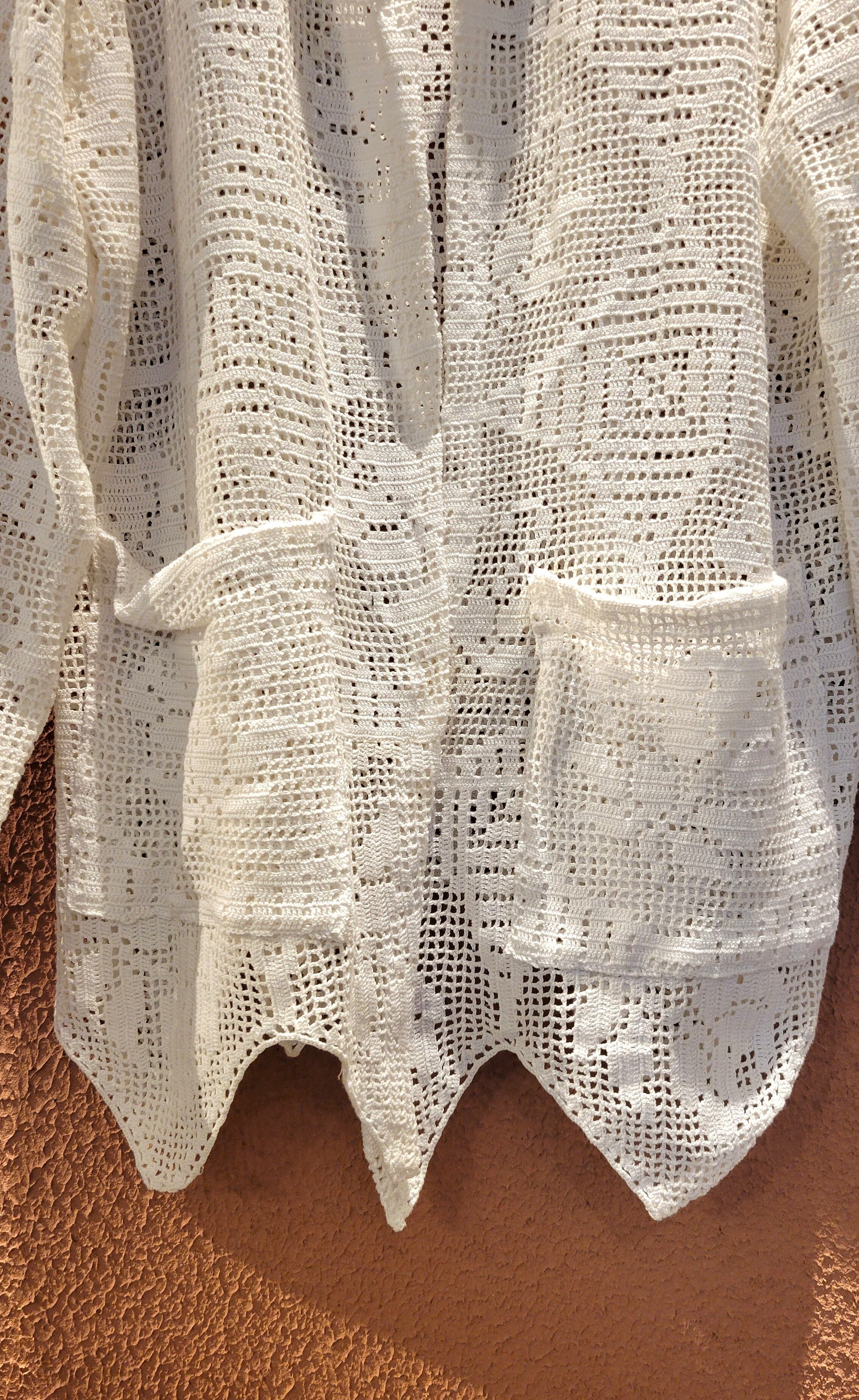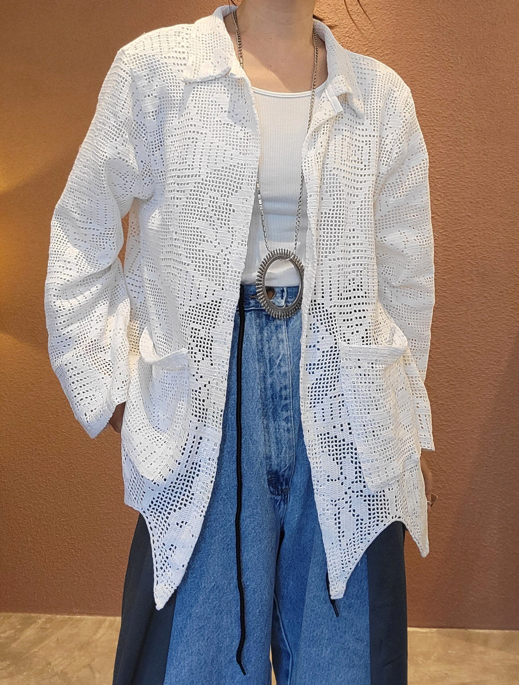 ヴィンテージのクロシェ生地を使用したリメイクオープンジャケット。素材表記はありませんがコットンのようです。ボタンの無いオープンジャケット。さっと羽織れて涼しく着られるので夏の羽織りにぴったりです。クロシェの編み柄が素敵です。