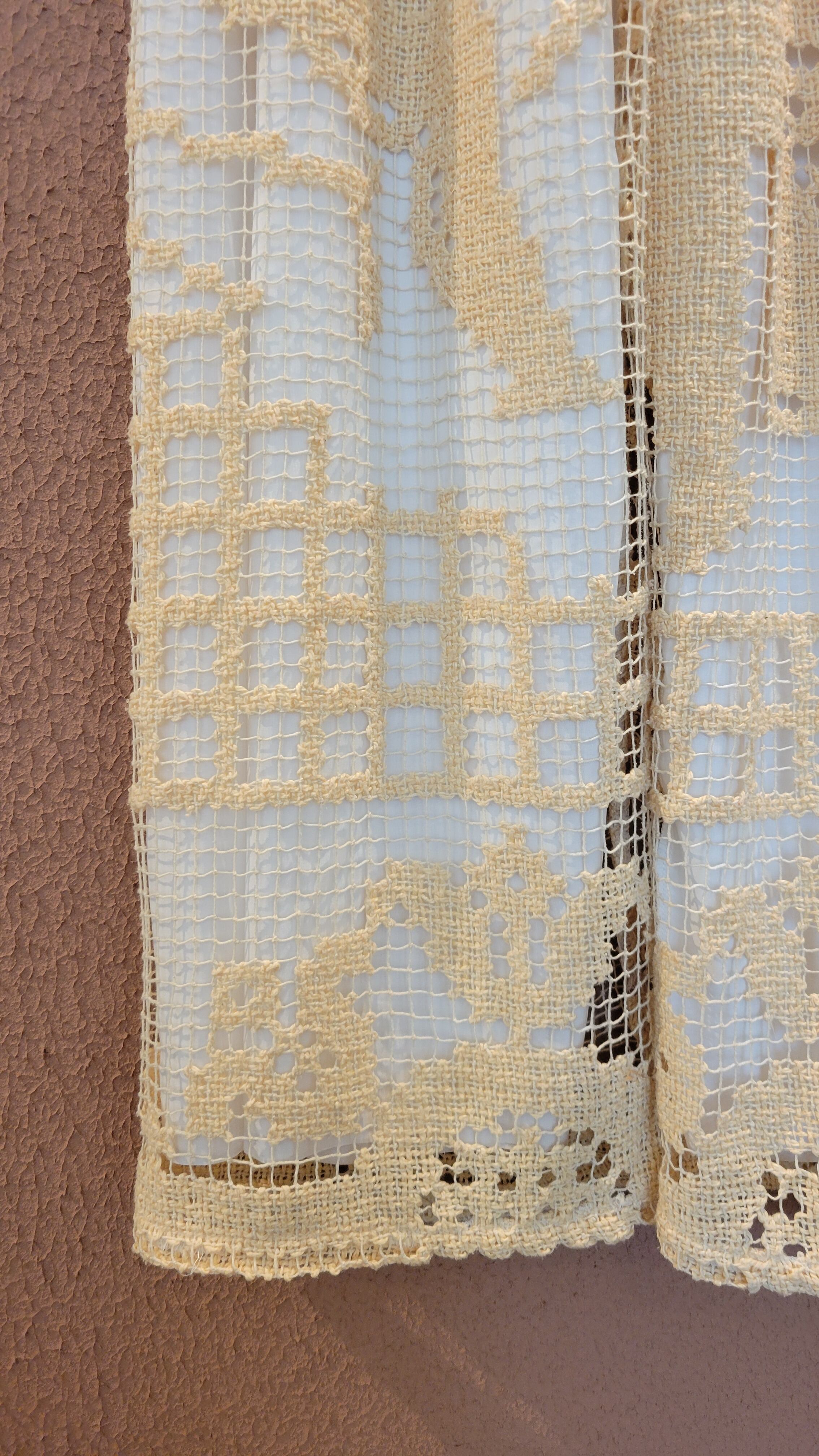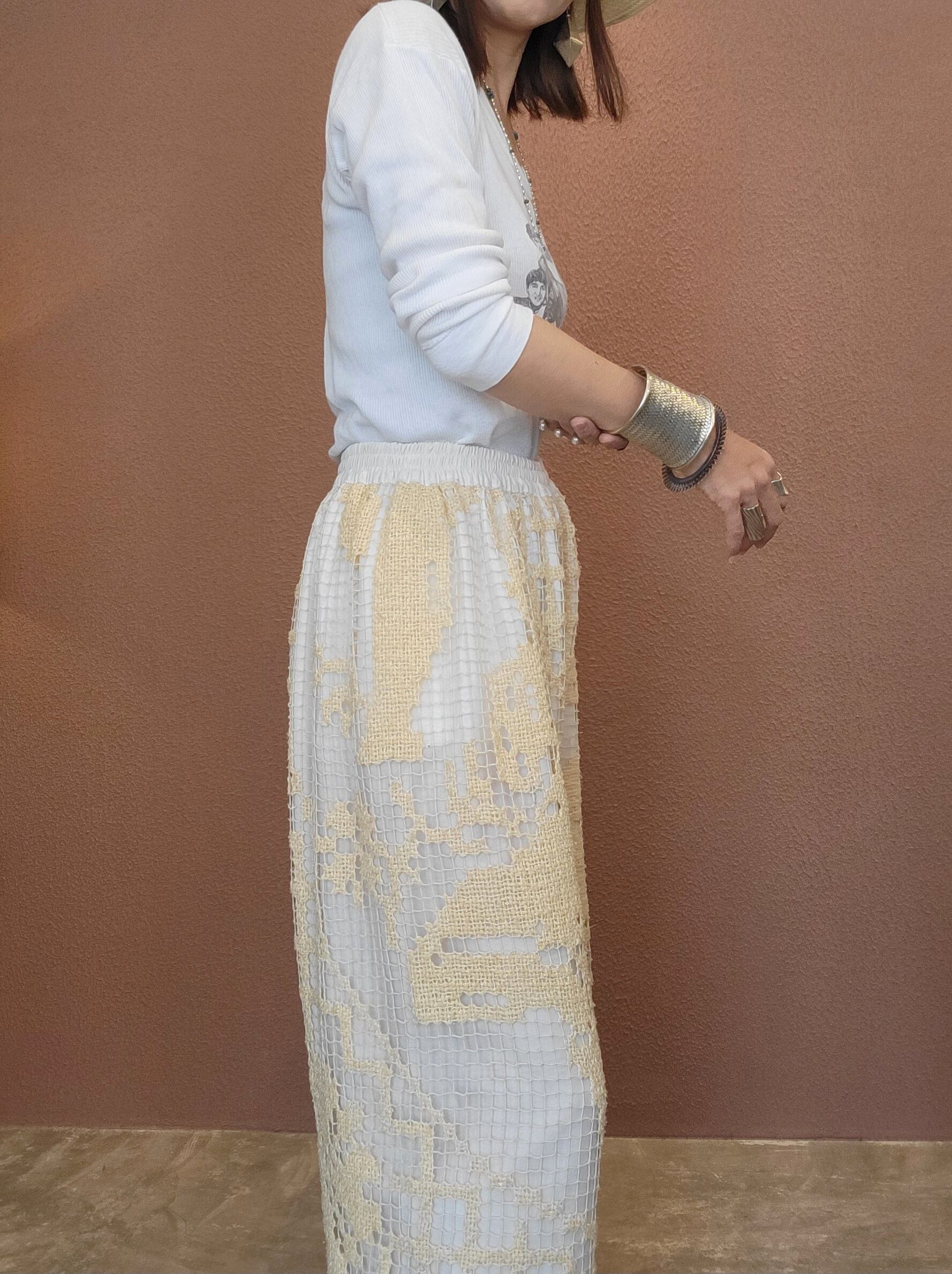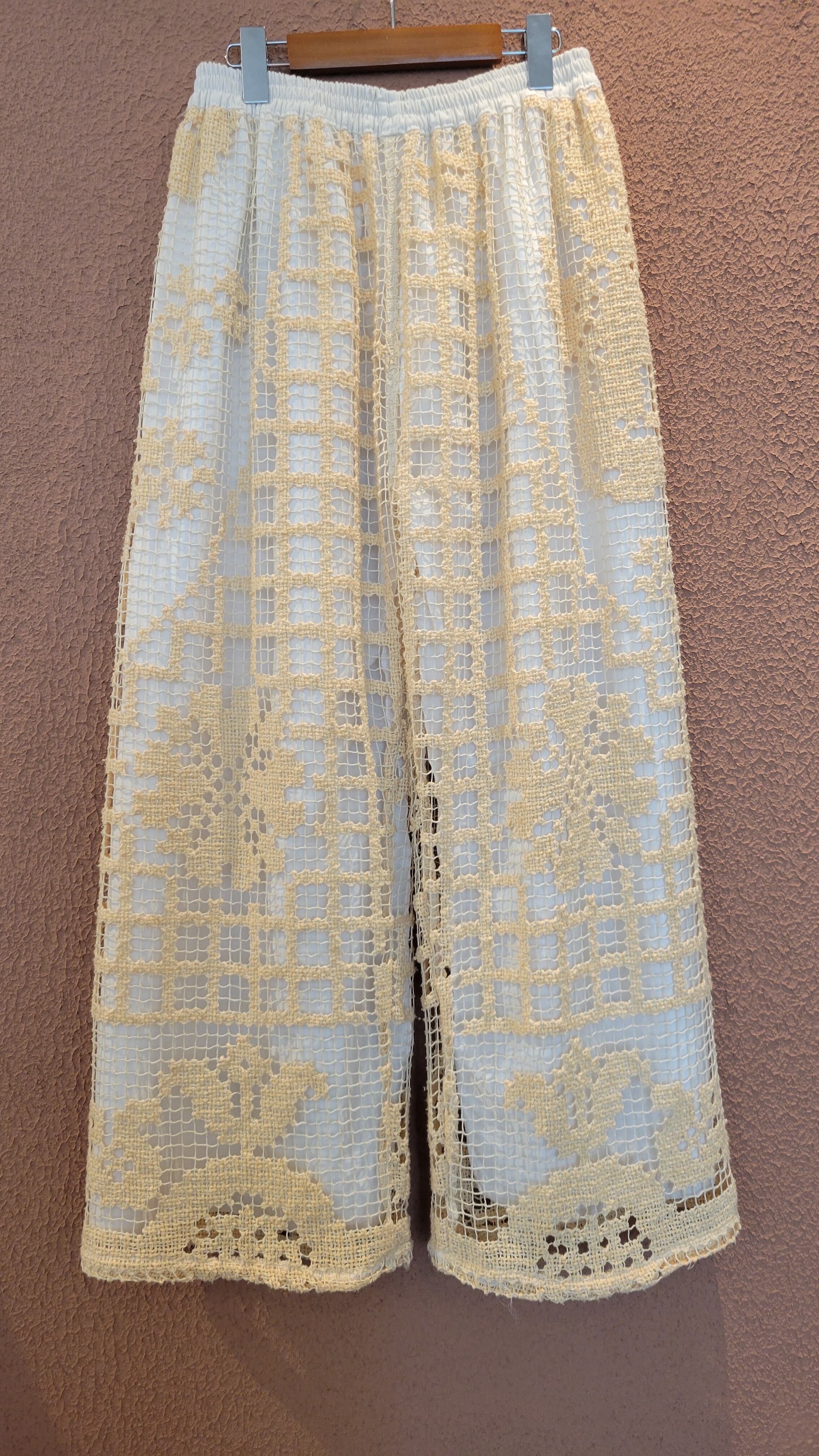 ヴィンテージレースを使用したリメイクパンツ。ウエストゴムのイージーパンツです。素材表記はありませんがコットンのようです。裏地付き。ポケット無し。大柄なレースの編み柄が大人っぽくかっこいい1本です。