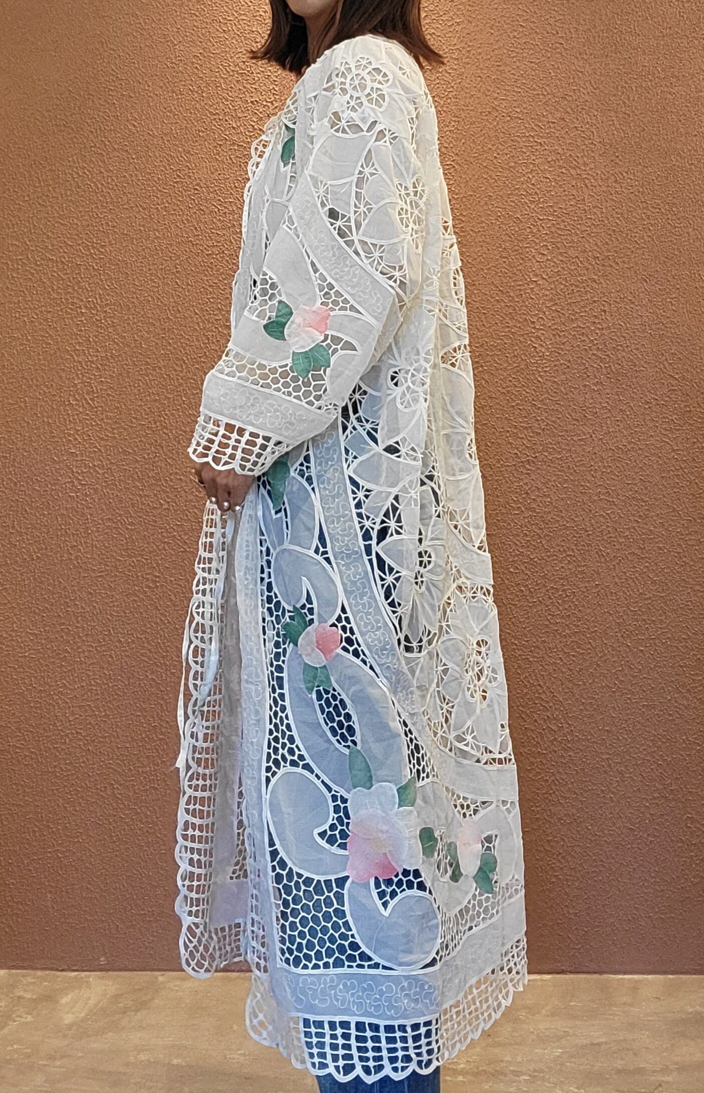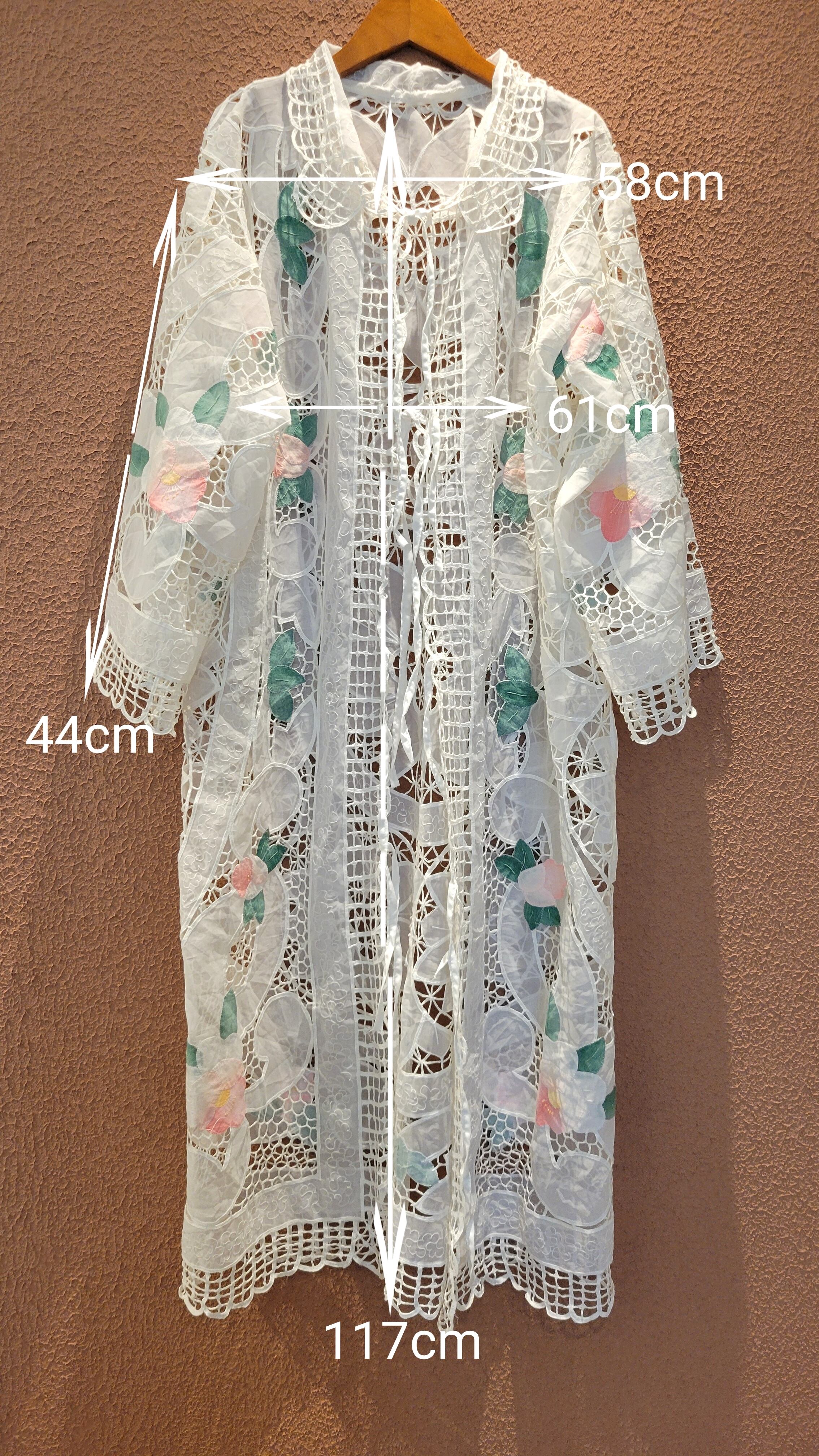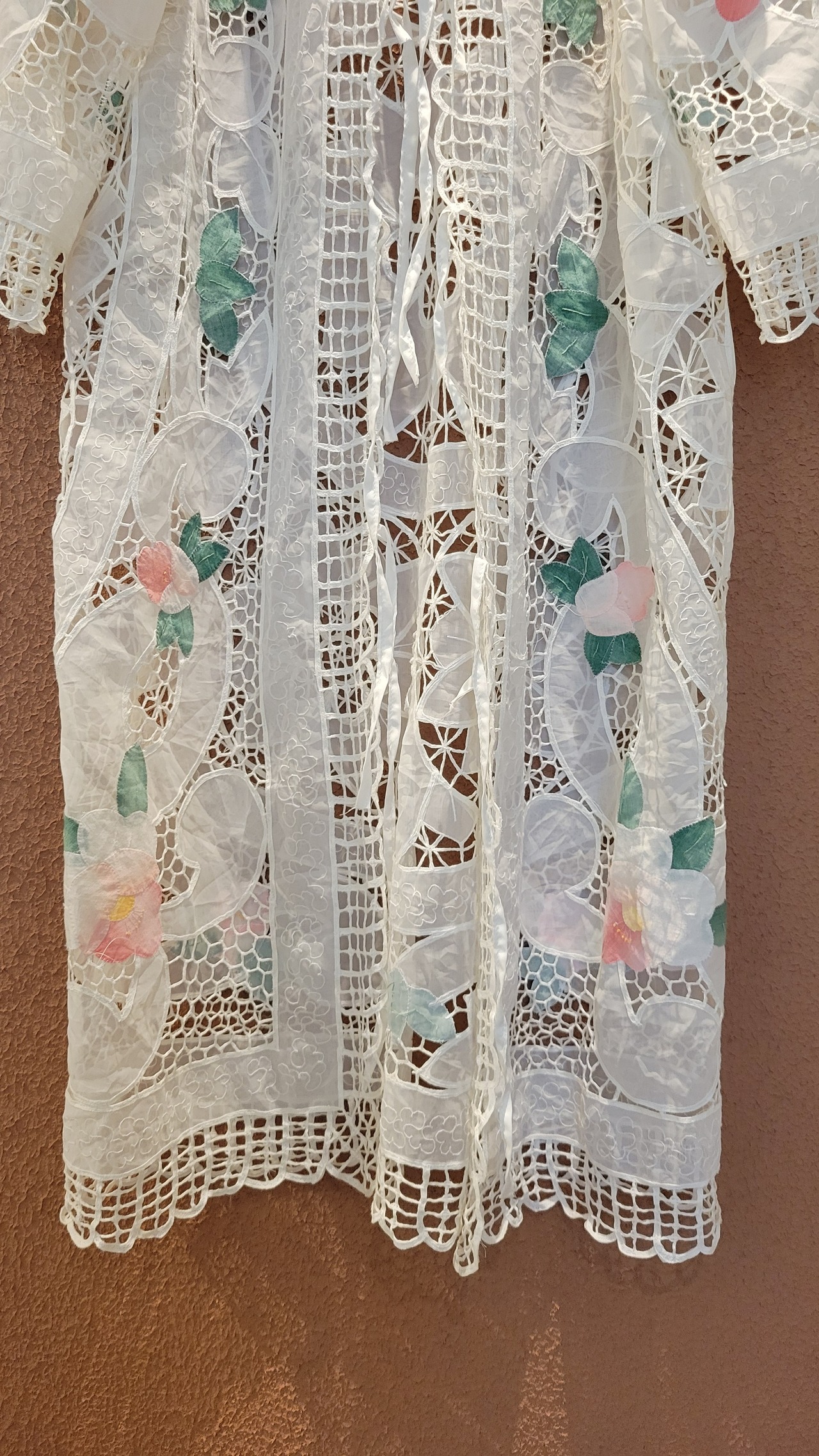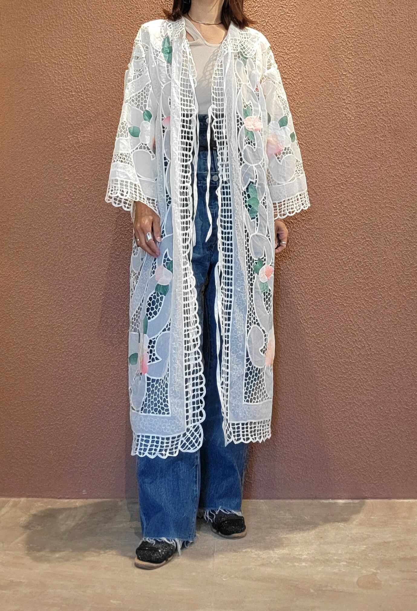 ヴィンテージのカットワークレースを贅沢に使用したリメイクガウン。素材表記はありませんがポリエステルとコットンのようです。透け感があります。フロントリボンは結ぶと甘めに、結ばずに垂らすと抜け感のあるスタイルに。繊細で美しいレースの魅力を存分に堪能できる贅沢な1枚です。