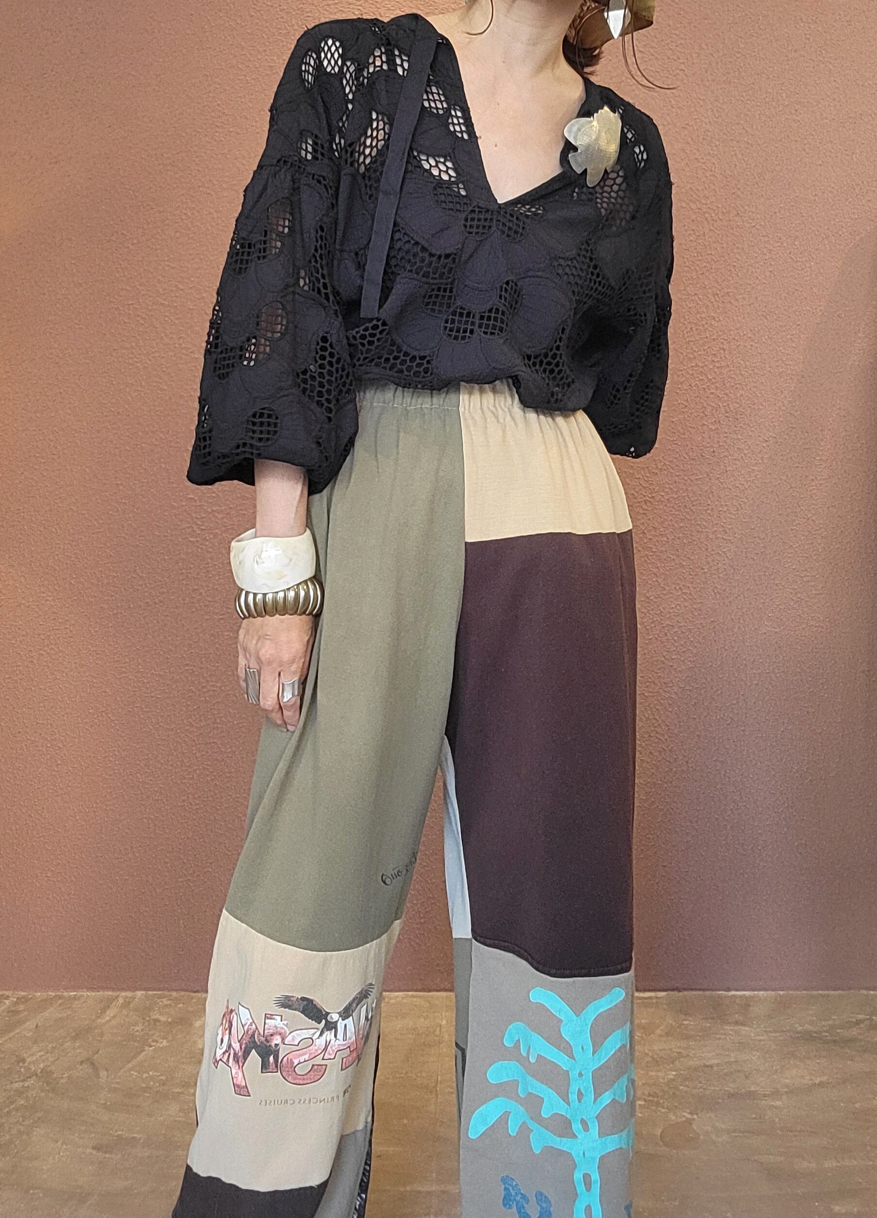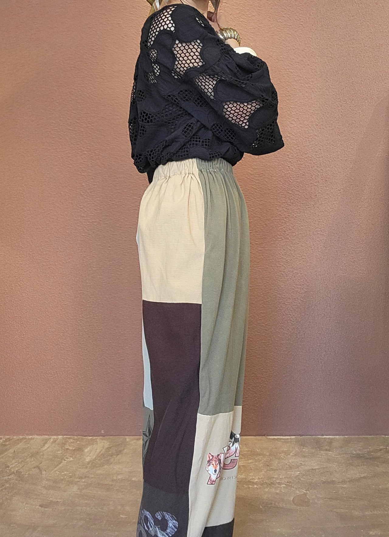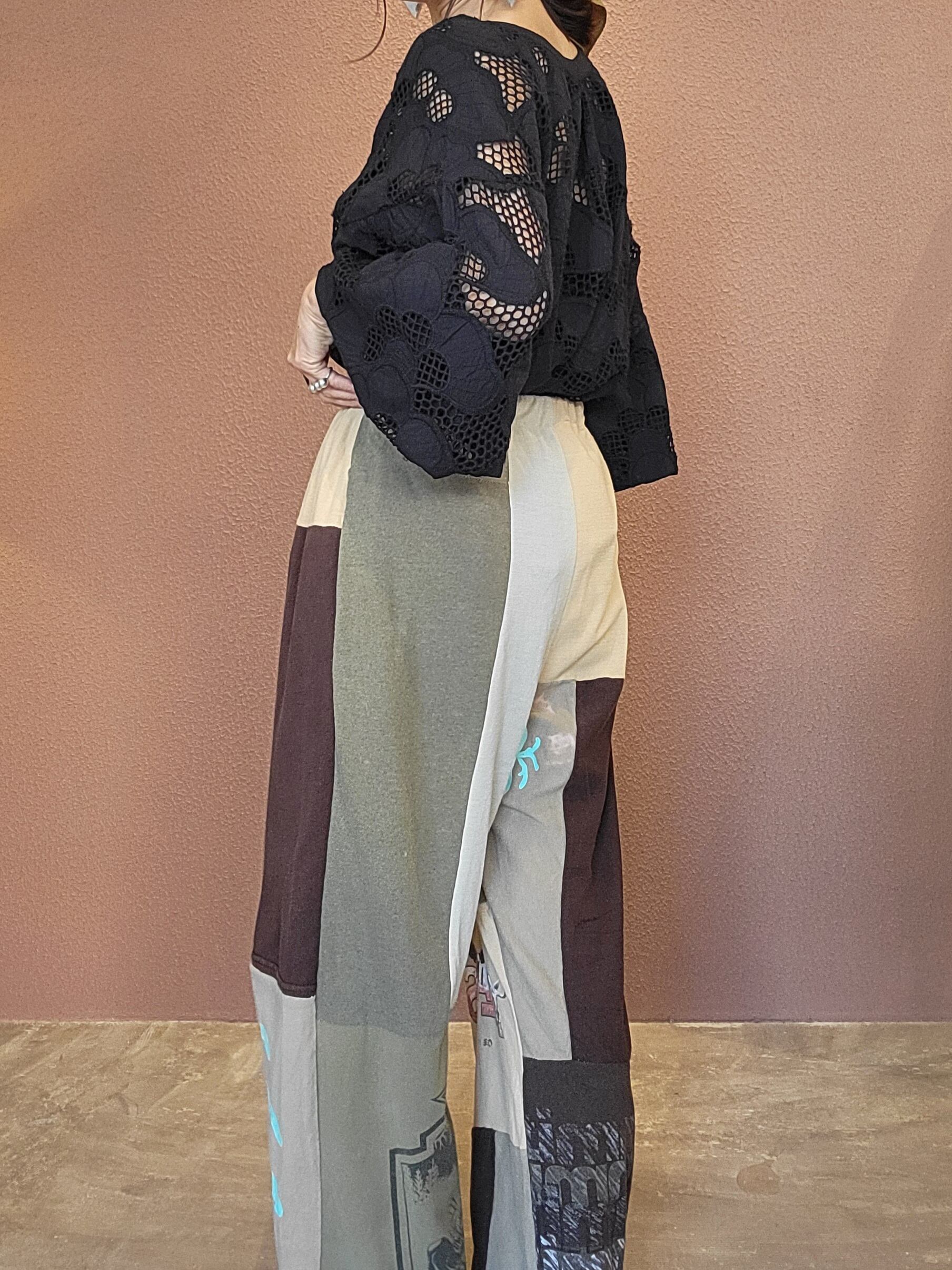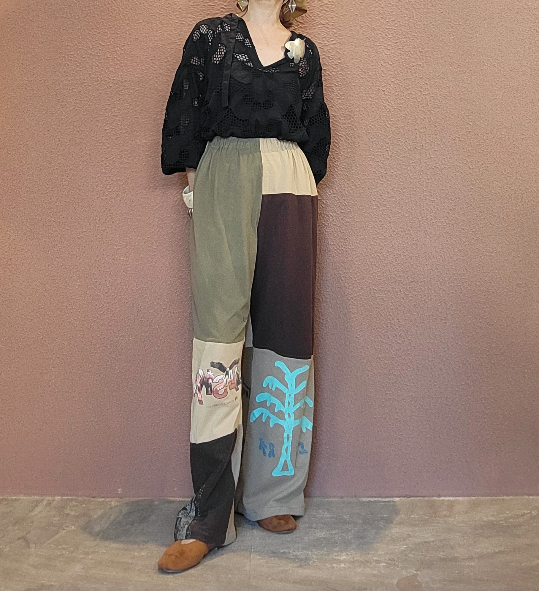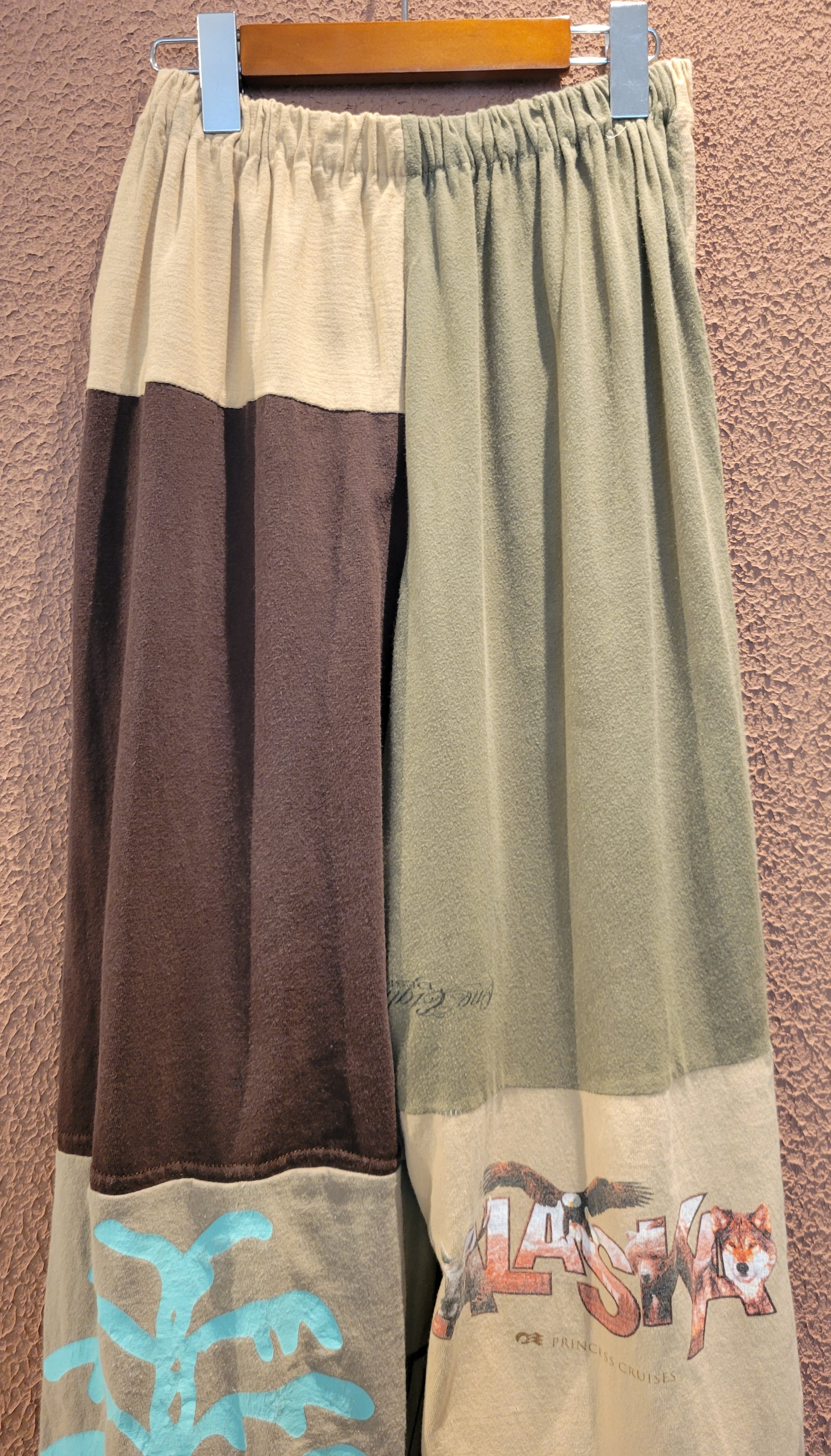 Used Tシャツを使用したリメイクイージーパンツ。素材表記はありませんがコットンです。ウエストゴム、ポケットはありません。ハイウエストからすとんと落ちるワイドシルエットはカジュアルながら大人っぽいスタイリングも叶います。