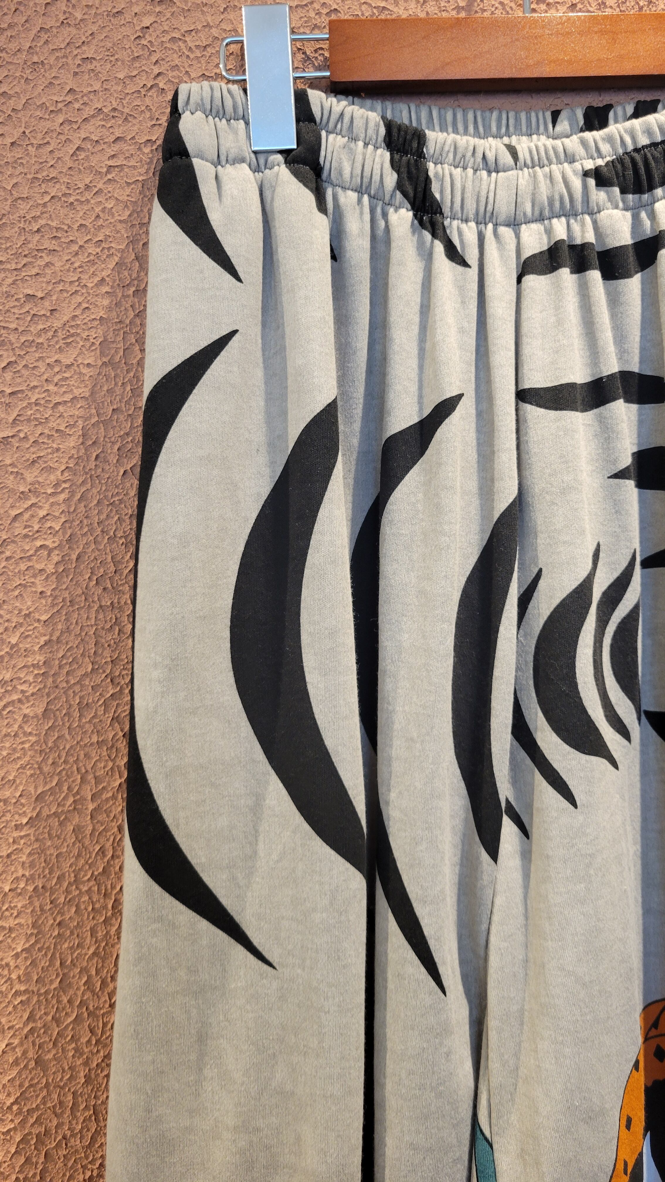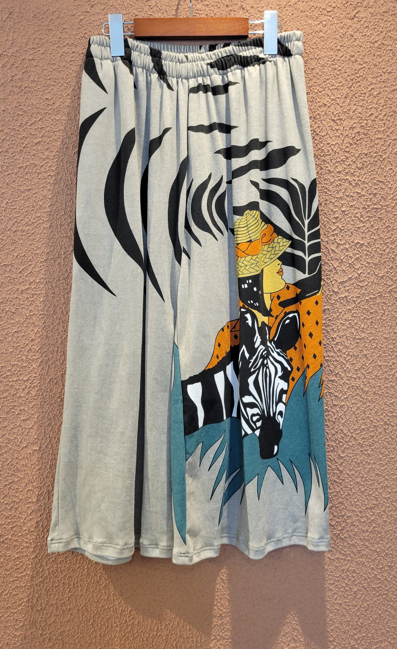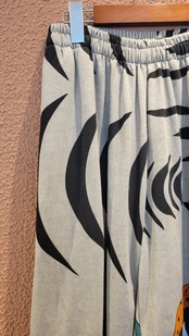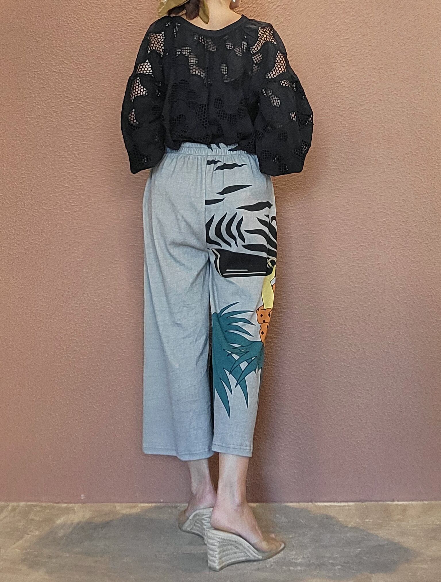 ヴィンテージのワイドイージーパンツ。素材はコットン、Tシャツのような素材です。ウエストゴム、右サイドにのみポケットがあります。短めのクロップト丈に個性的なプリントの珍しいヴィンテージパンツです。
