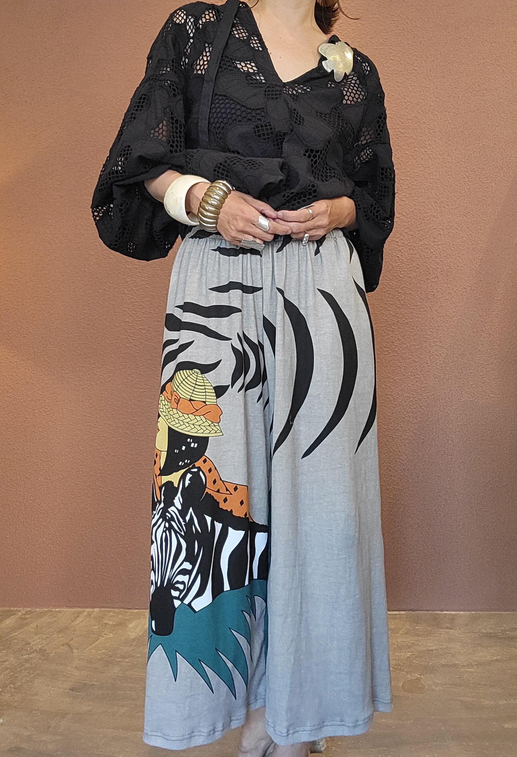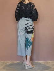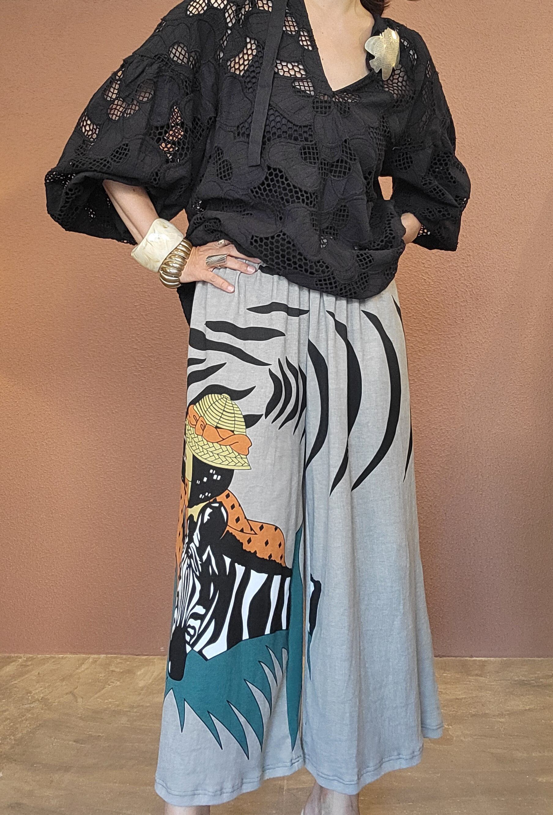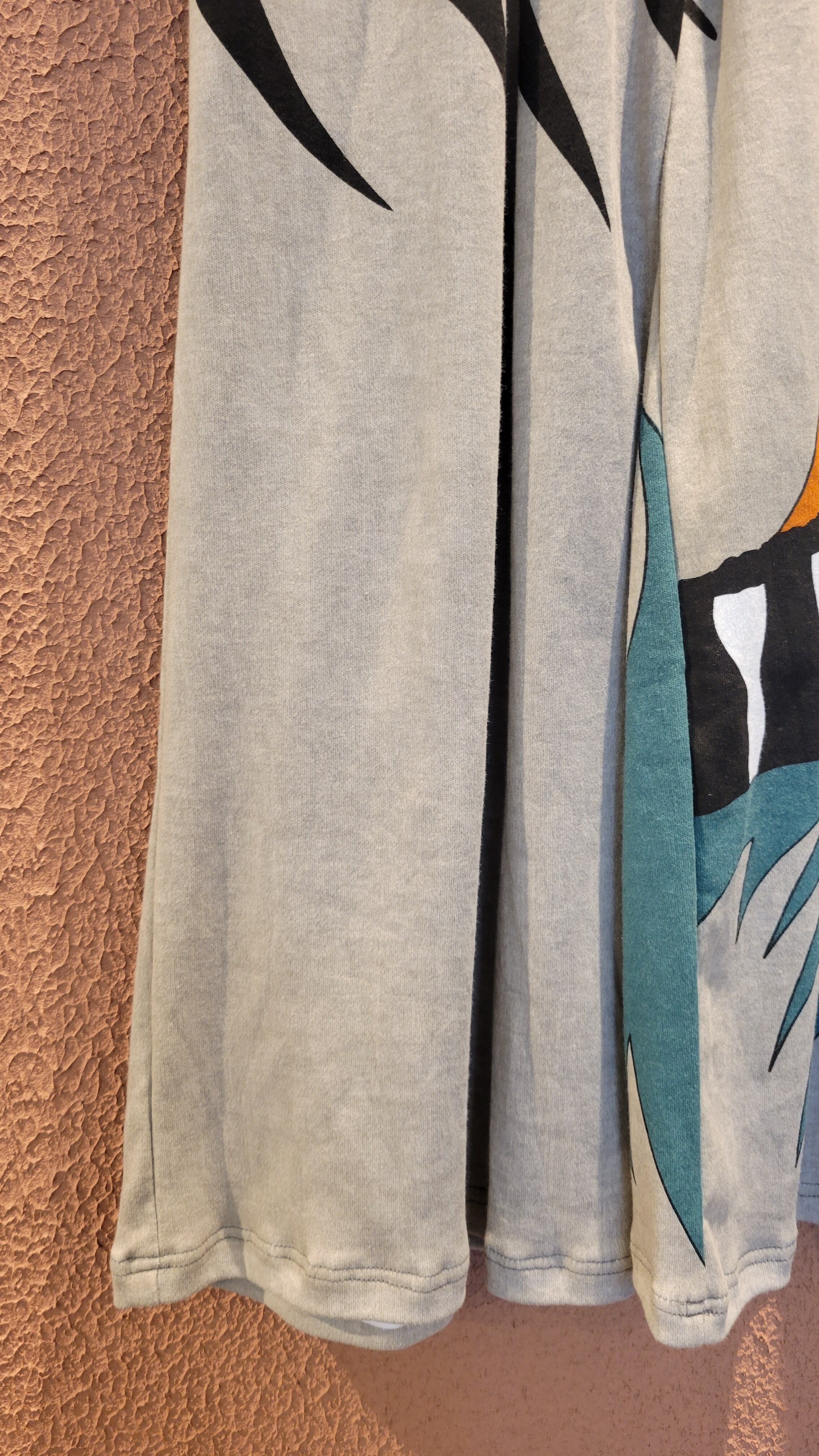 ヴィンテージのワイドイージーパンツ。素材はコットン、Tシャツのような素材です。ウエストゴム、右サイドにのみポケットがあります。短めのクロップト丈に個性的なプリントの珍しいヴィンテージパンツです。