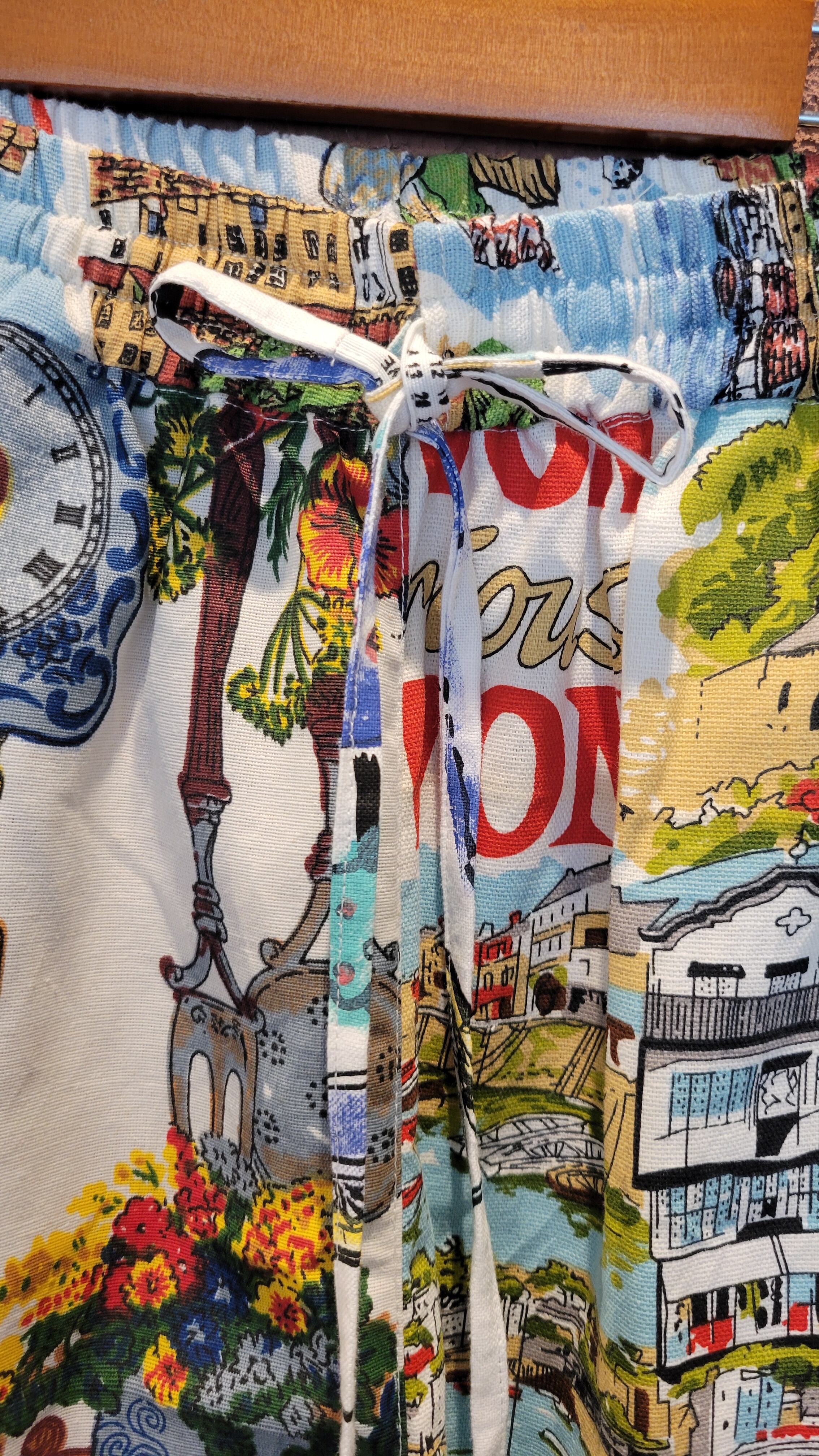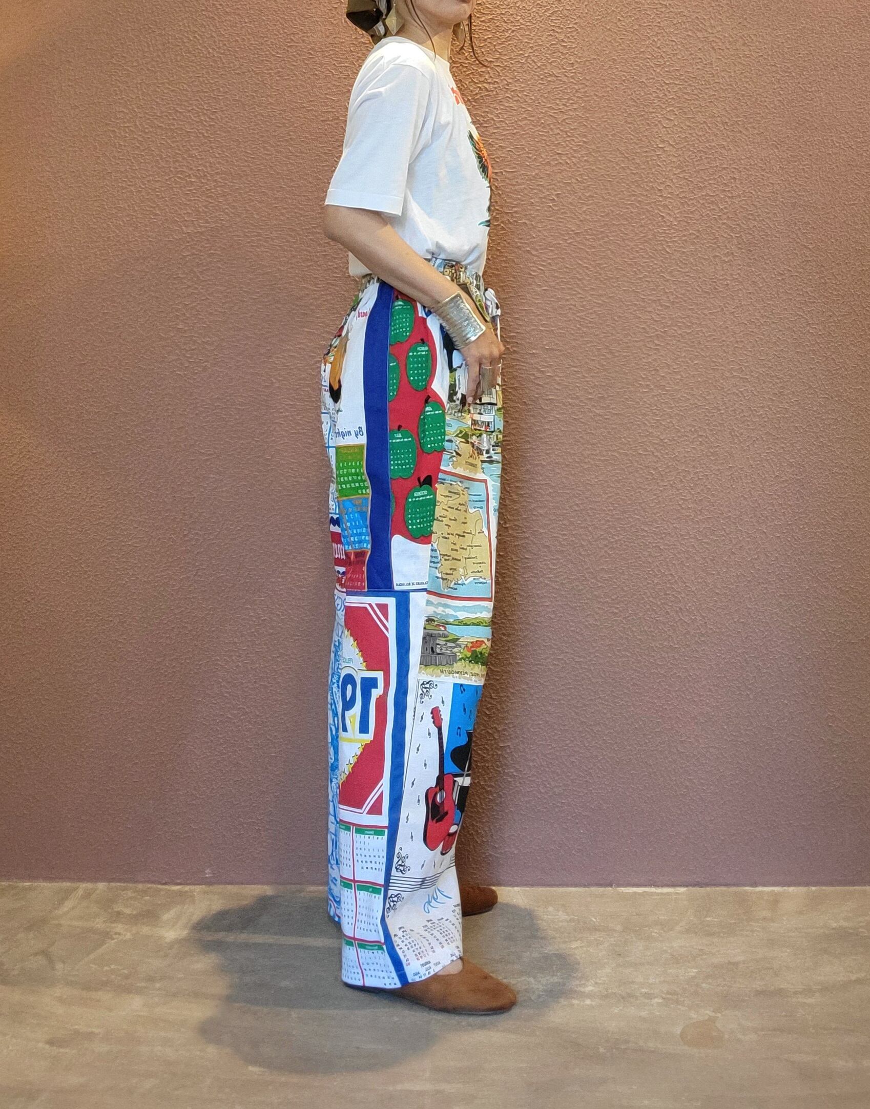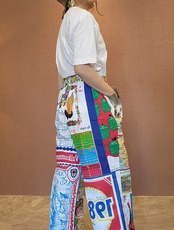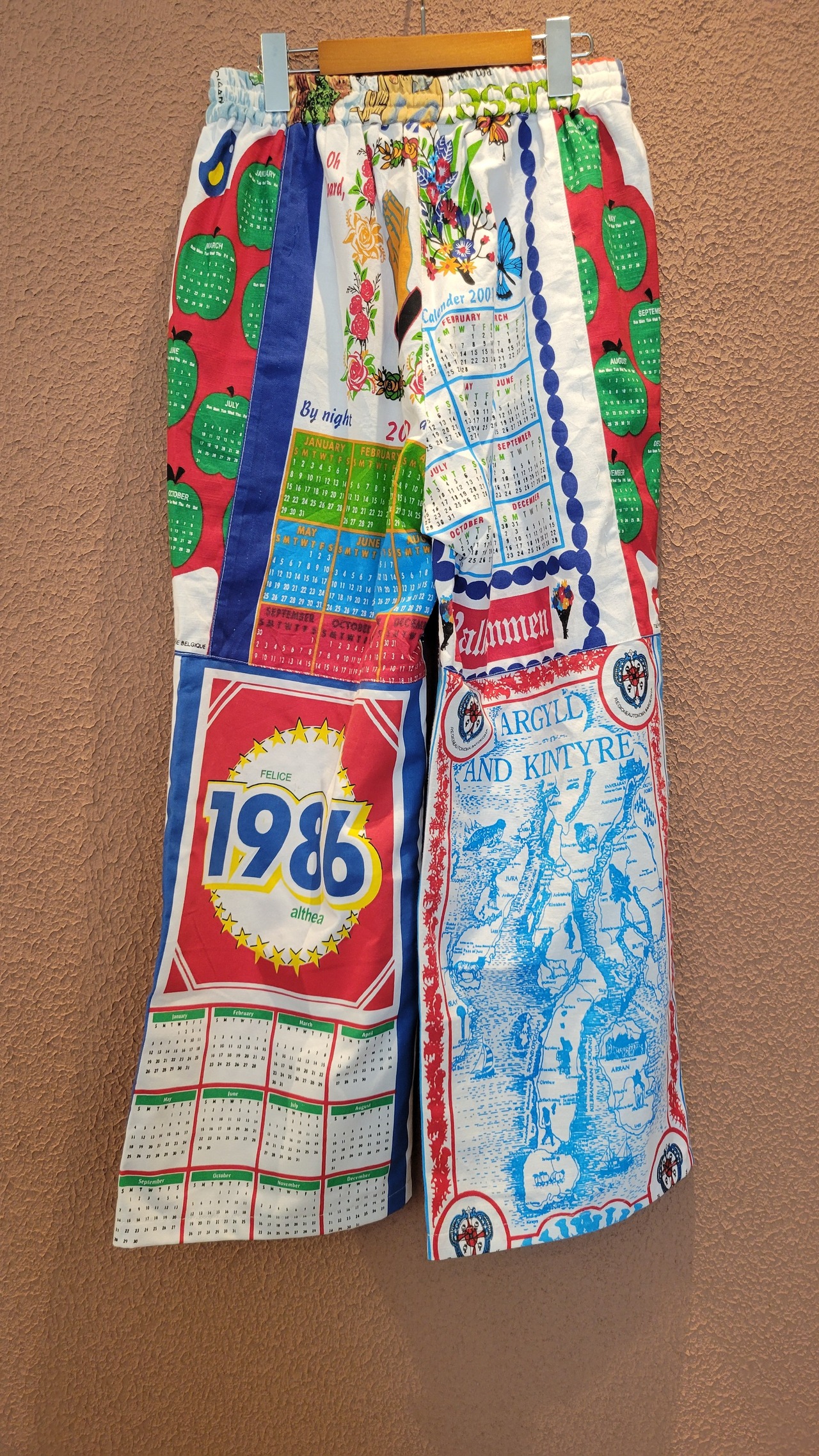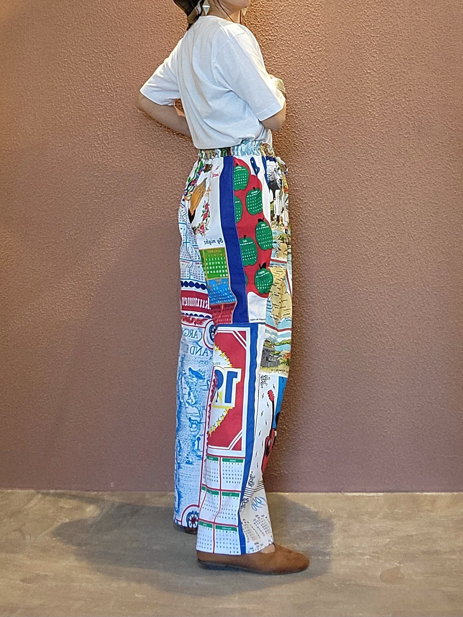 usedやvintageのティータオルを使用したリメイクパンツ。素材表記はありませんがコットンです。ウエストはゴムと紐で調整可能、左右ポケット付きです。軽くてさらりとした肌触り、日常着にぴったりです。