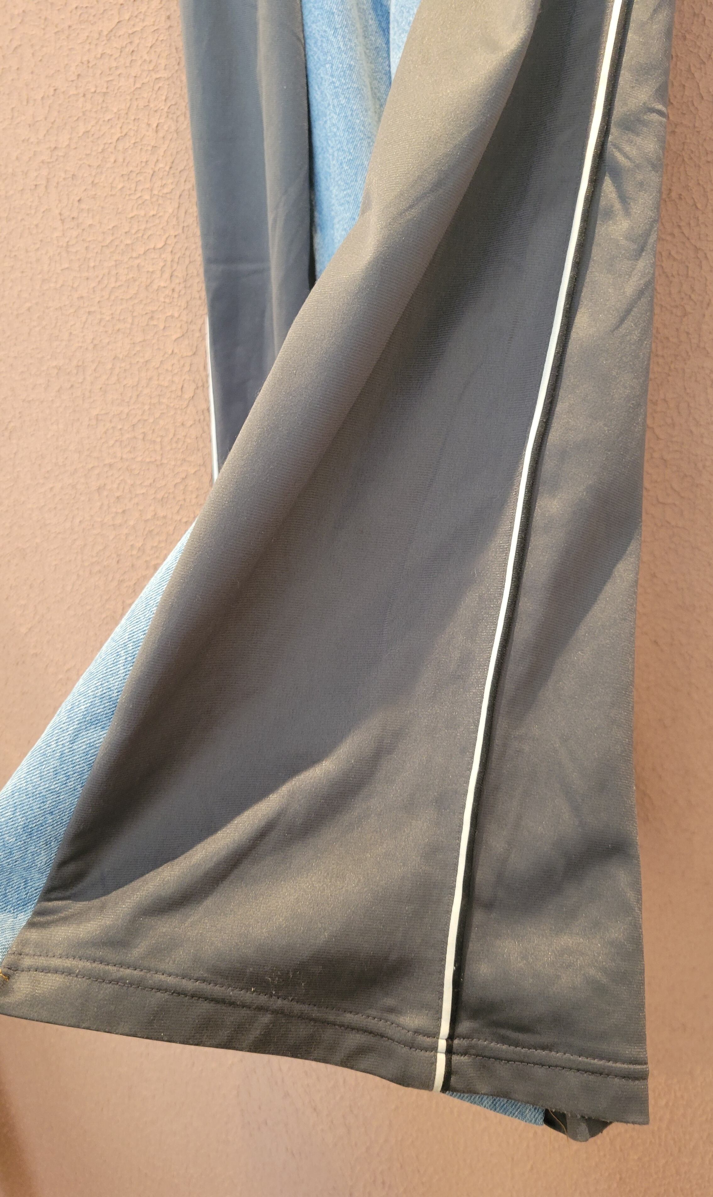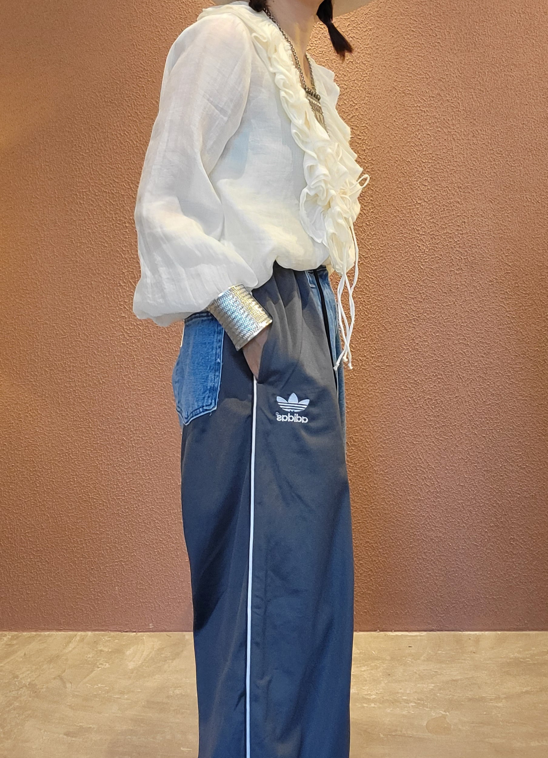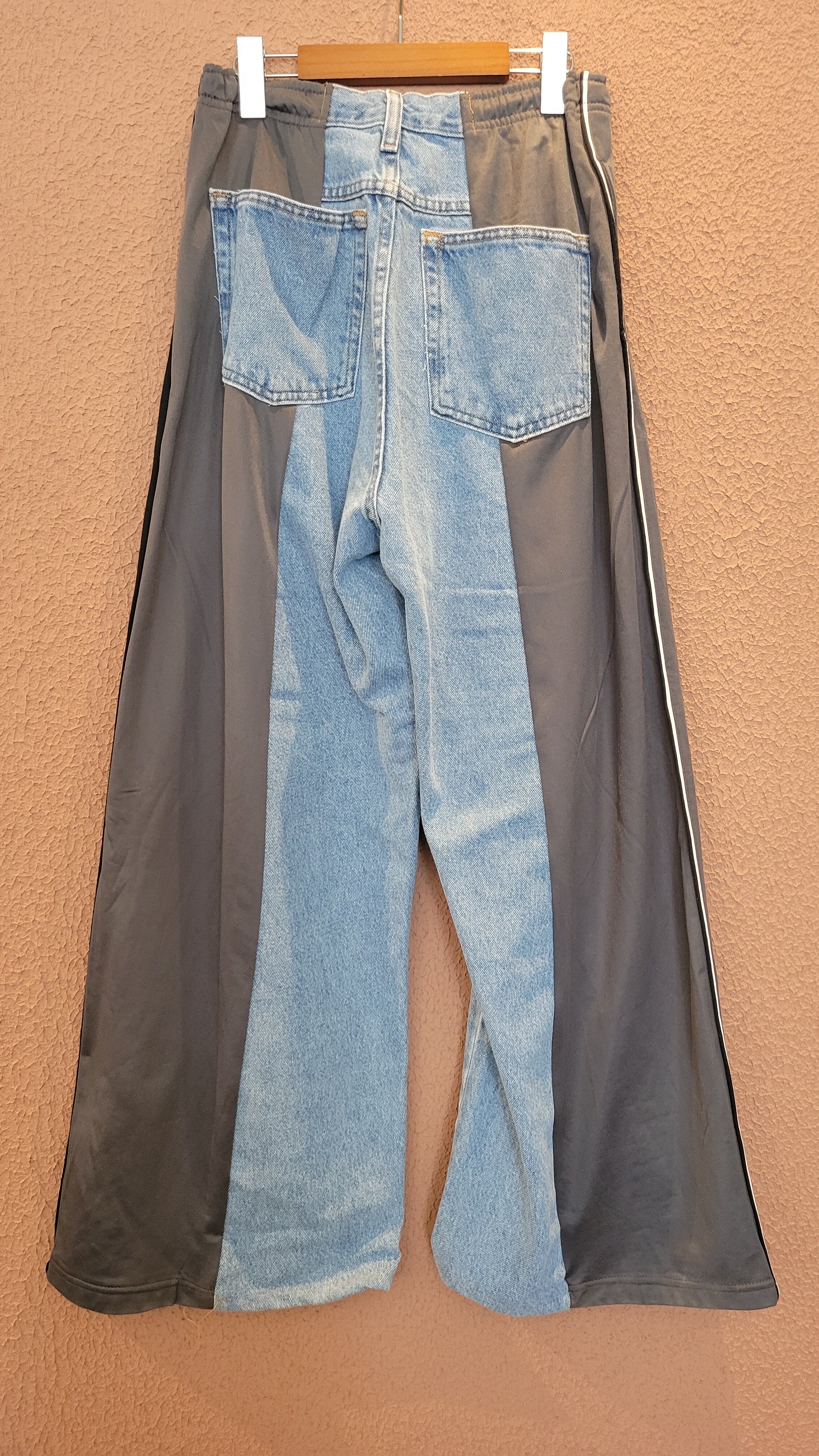 usedデニムとトラックパンツをドッキングしたリメイクパンツ。ウエストはゴム&ドローコードでサイズ調整が可能です。左右ポケット付き。太シルエットで男女兼用で着用できます。