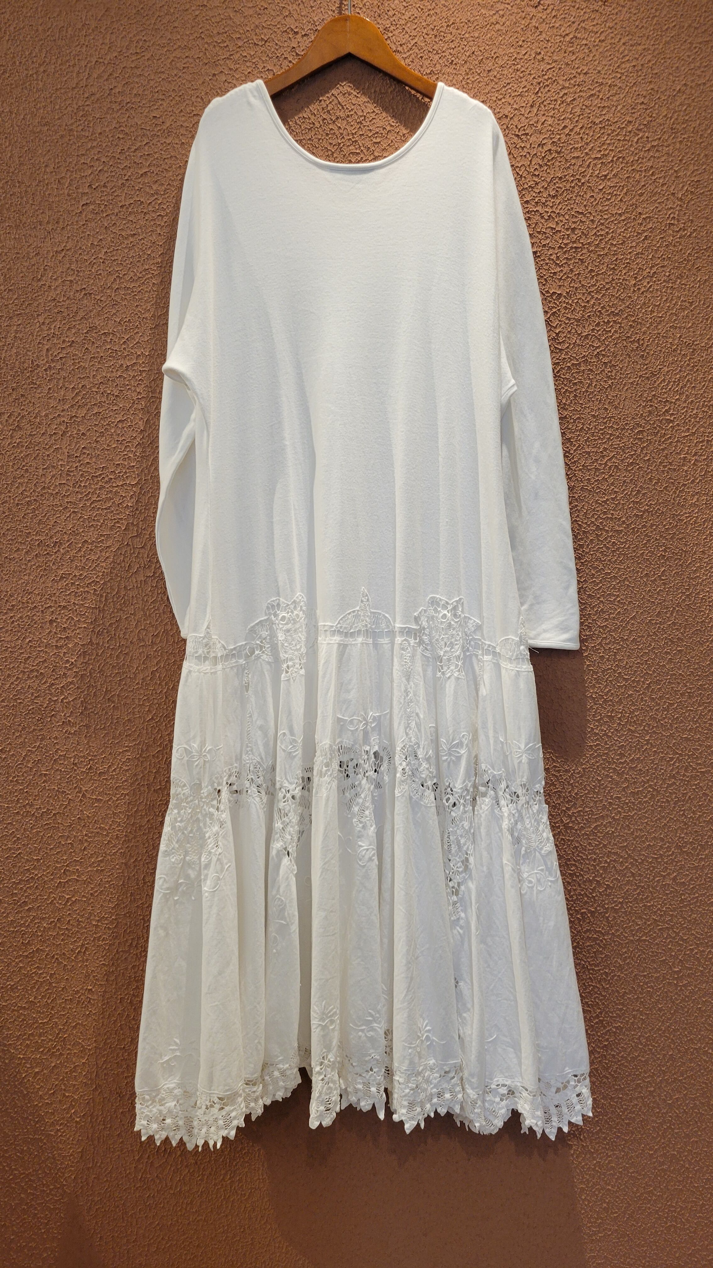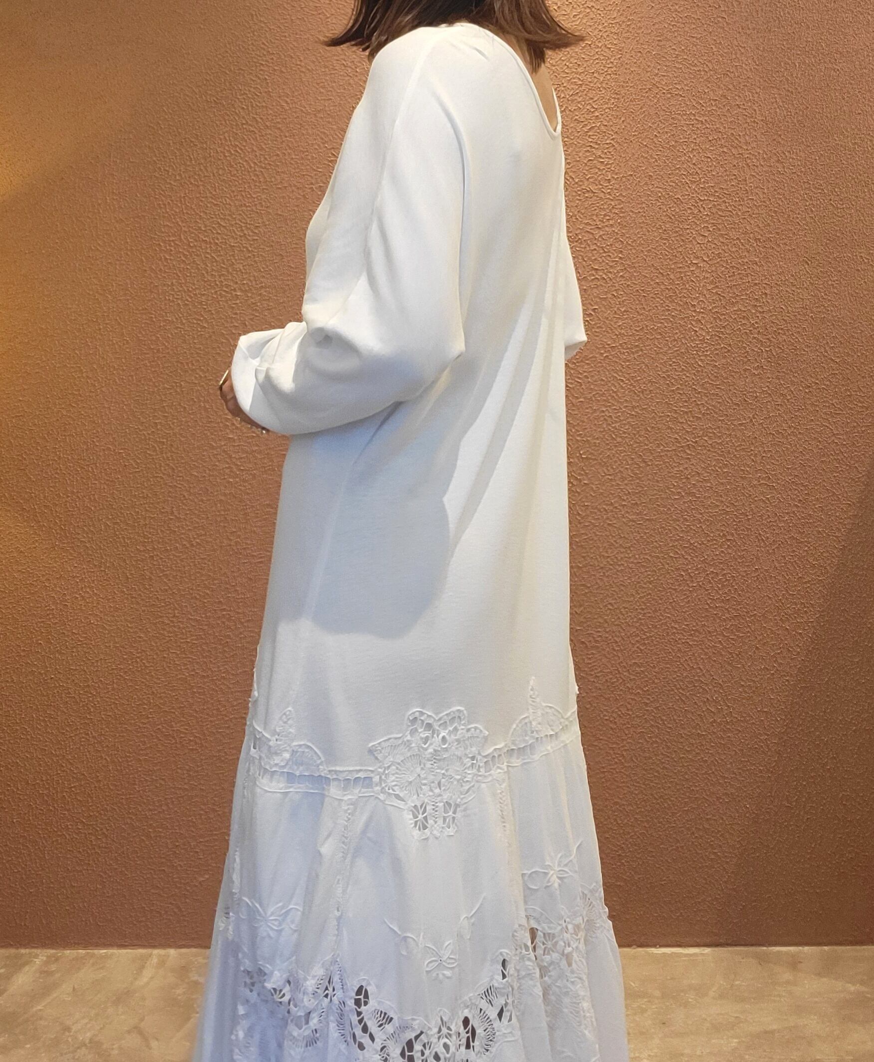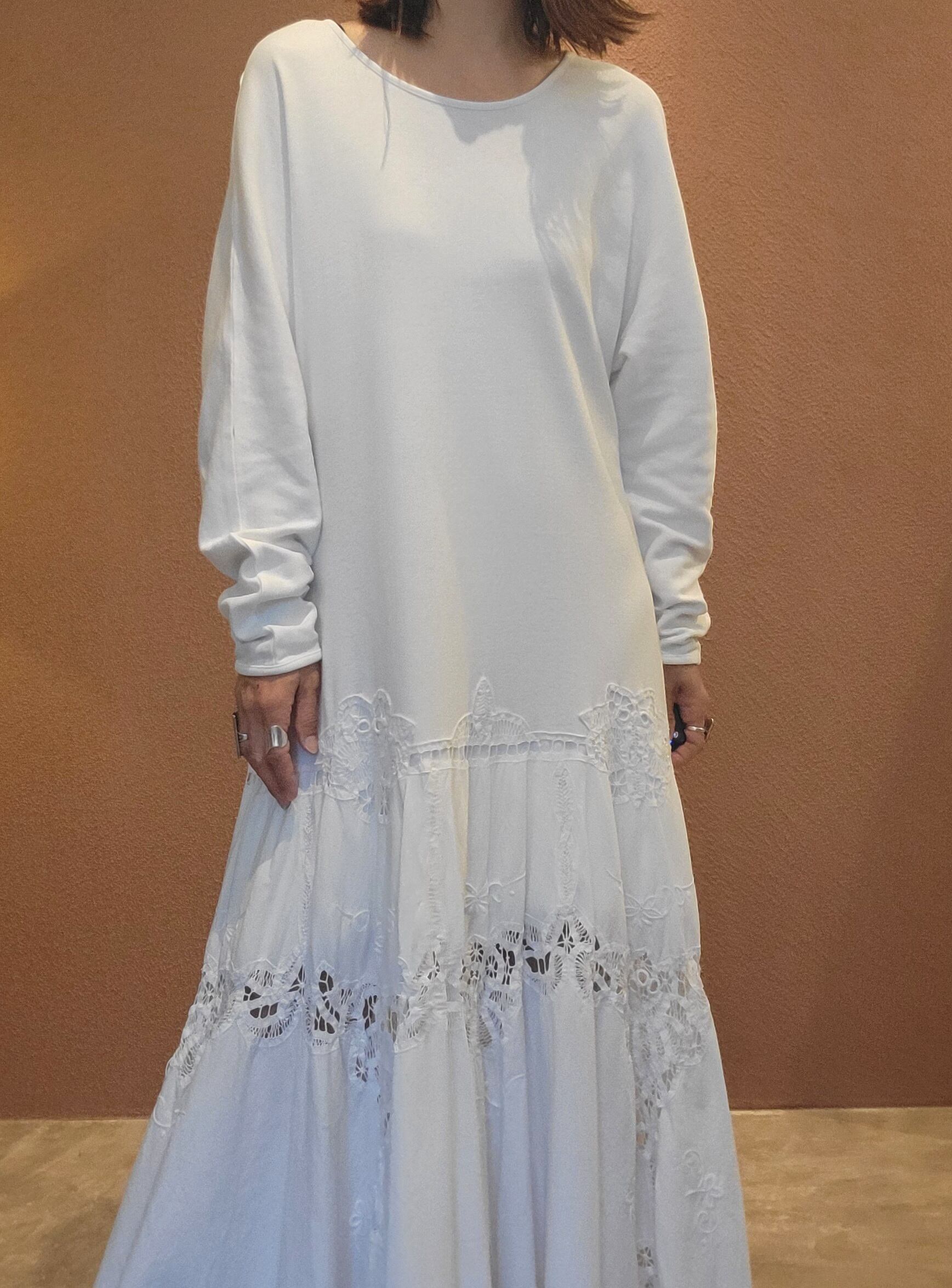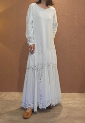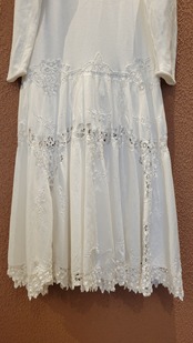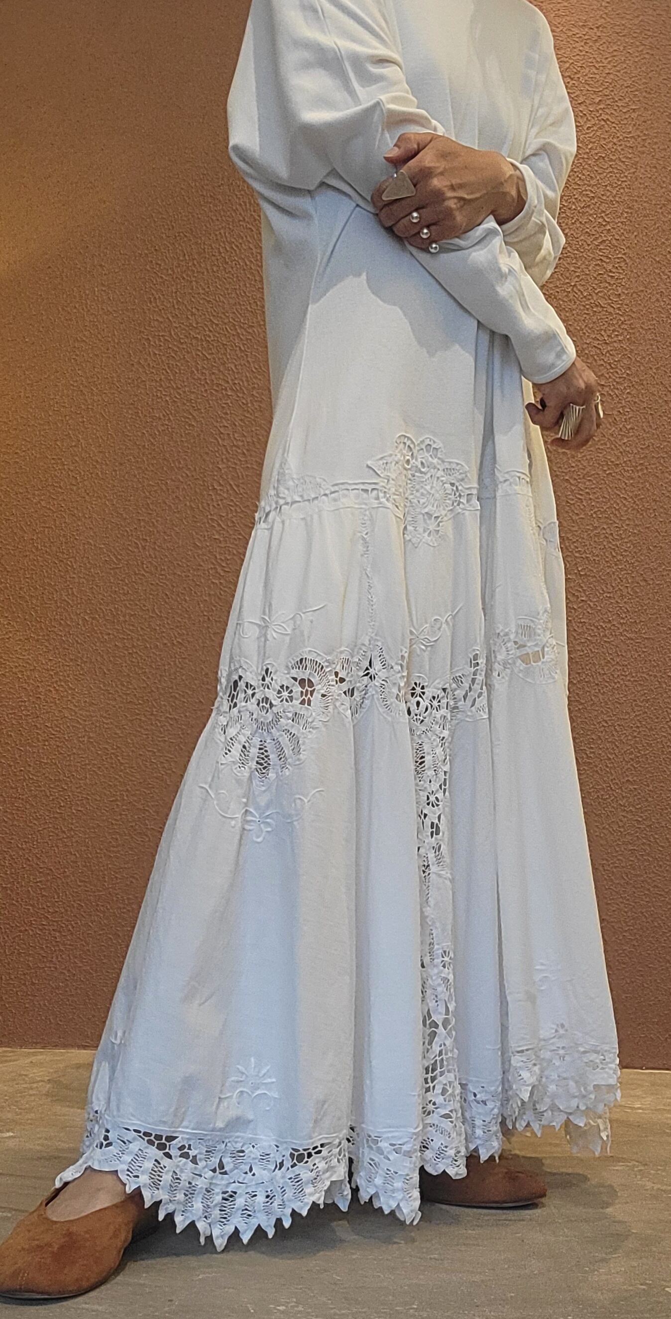 "Carolyne Barton" ヴィンテージマキシワンピース。素材はコットン100%です。トップス部分はやや厚手のTシャツのような素材感で伸縮性があります。裾は美しいバテンレースのフレアたっぷりで豪華な印象。デコルテと背中の開き具合が程よく抜け感をプラス。素材とデザインのバランスがとても良い着心地抜群のワンピースです。*後ろ身ごろウエスト右辺りに5ミリ程度のごく薄いシミがあります。画像でご確認ください。