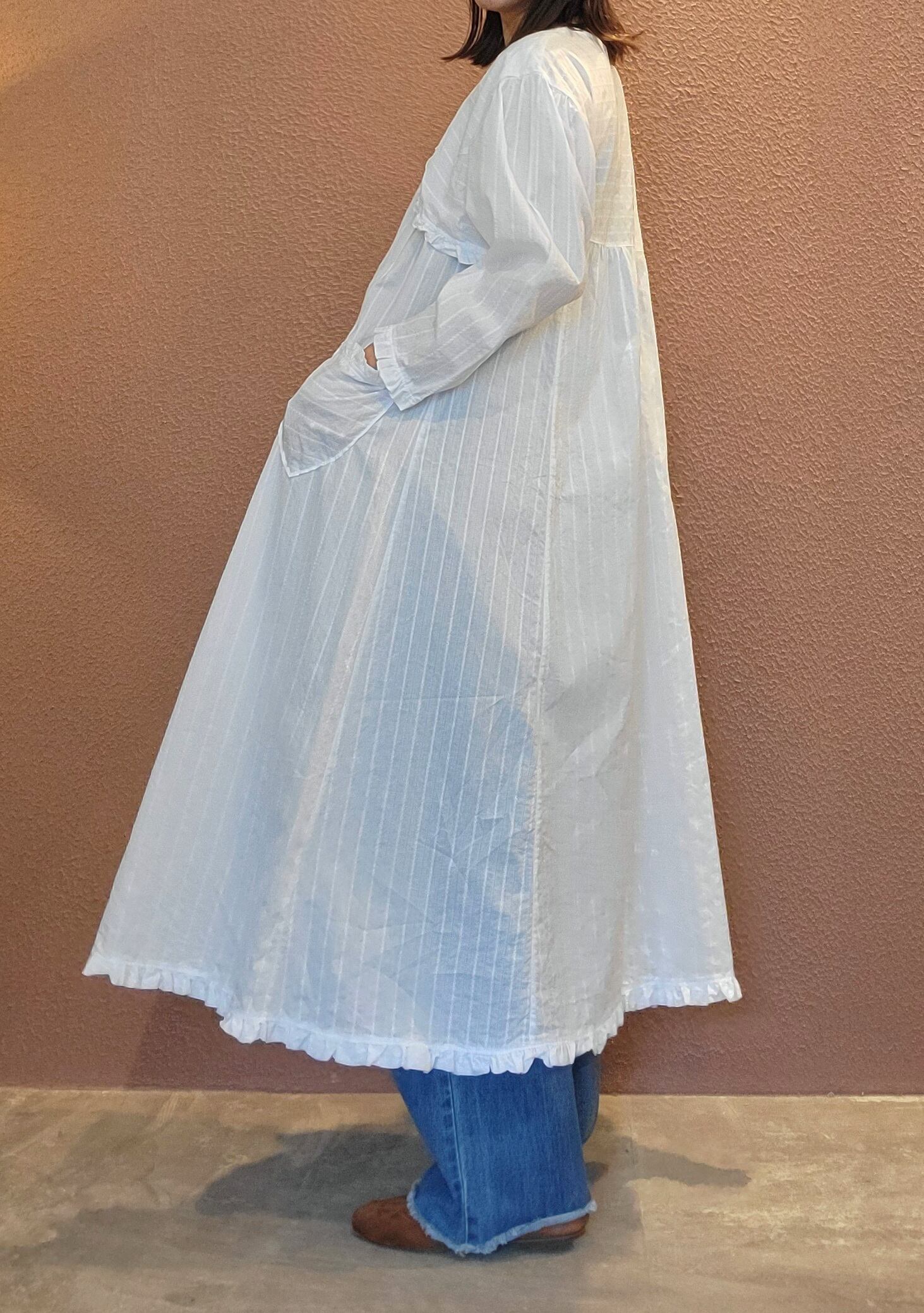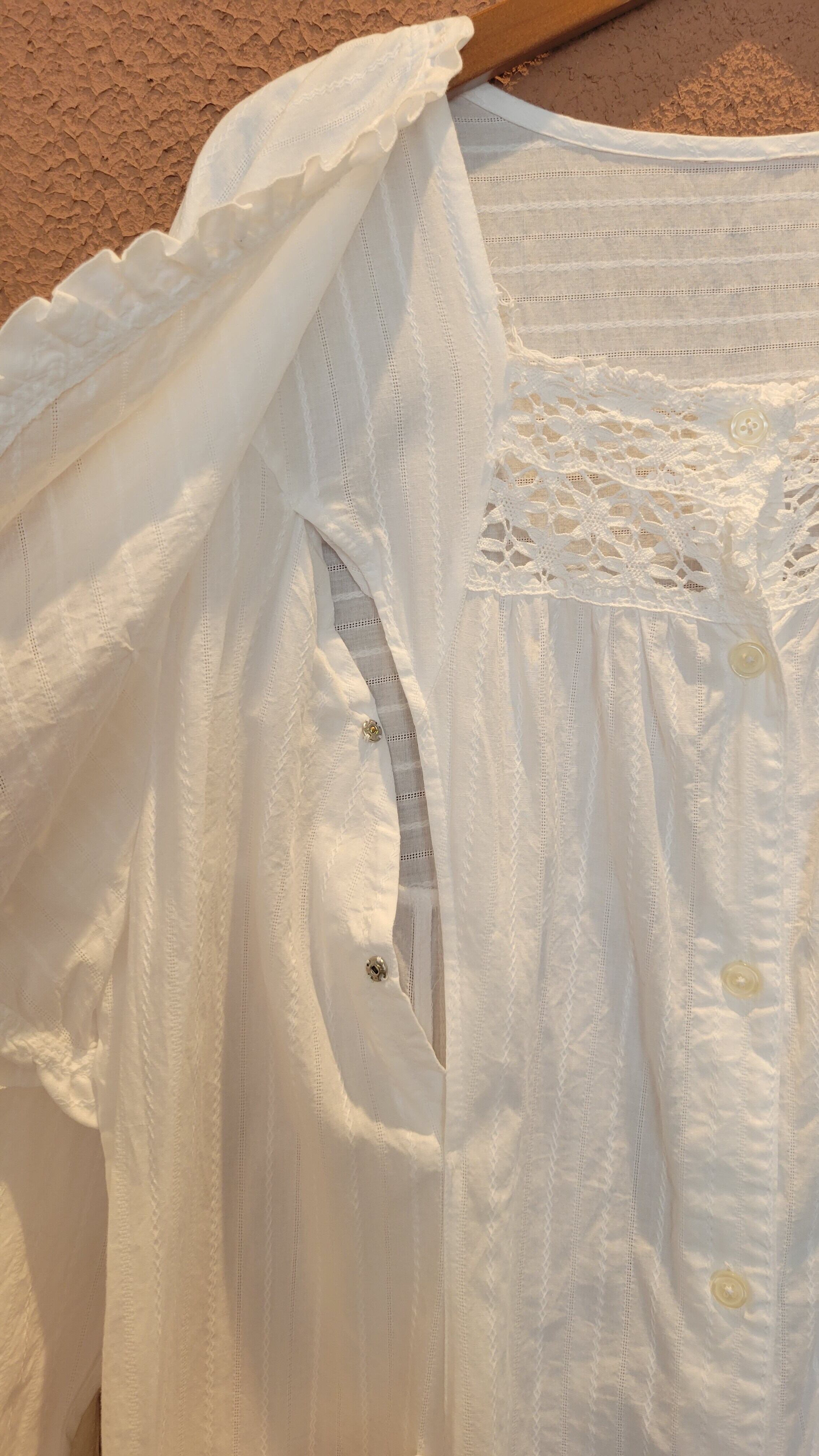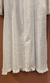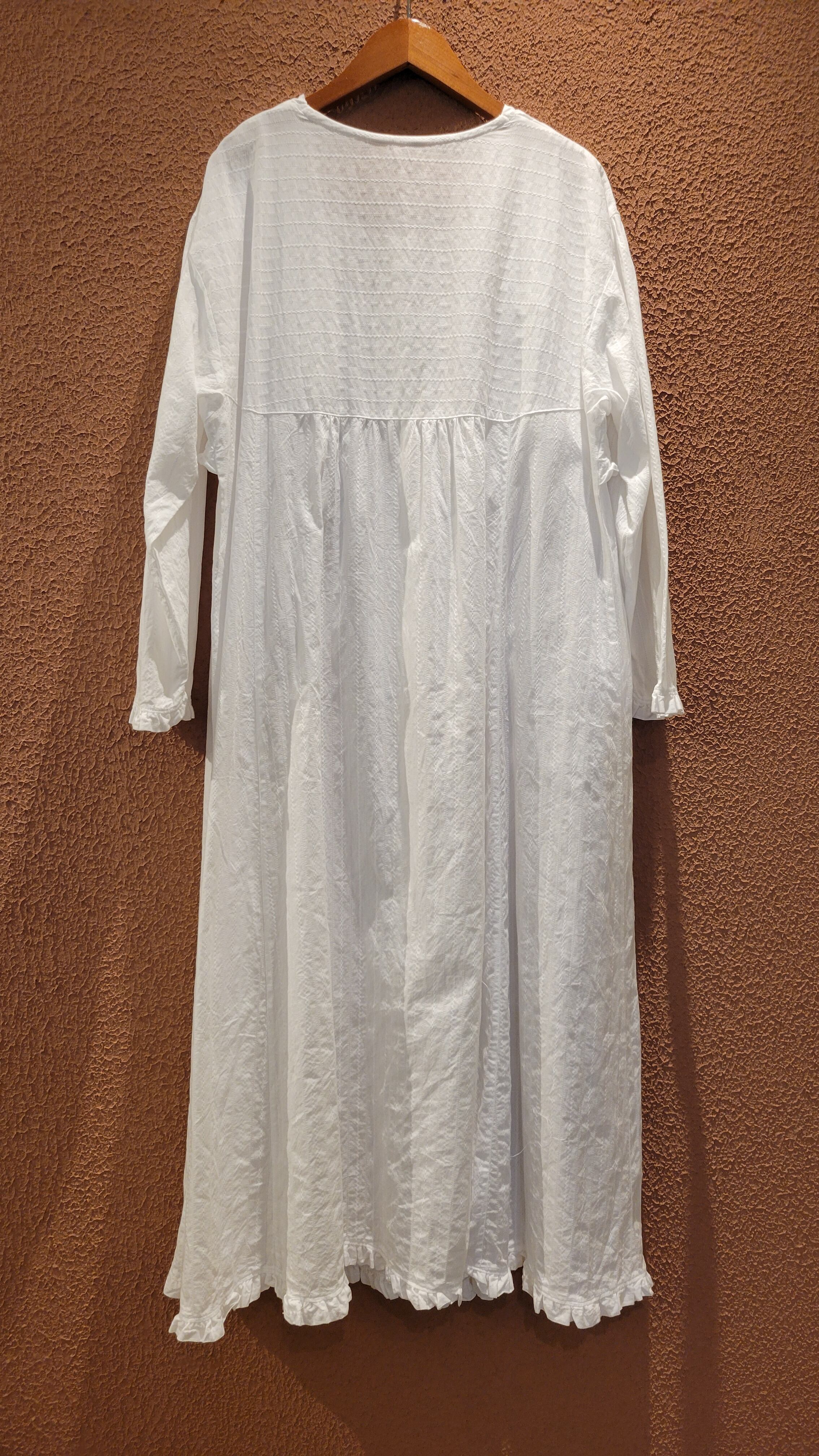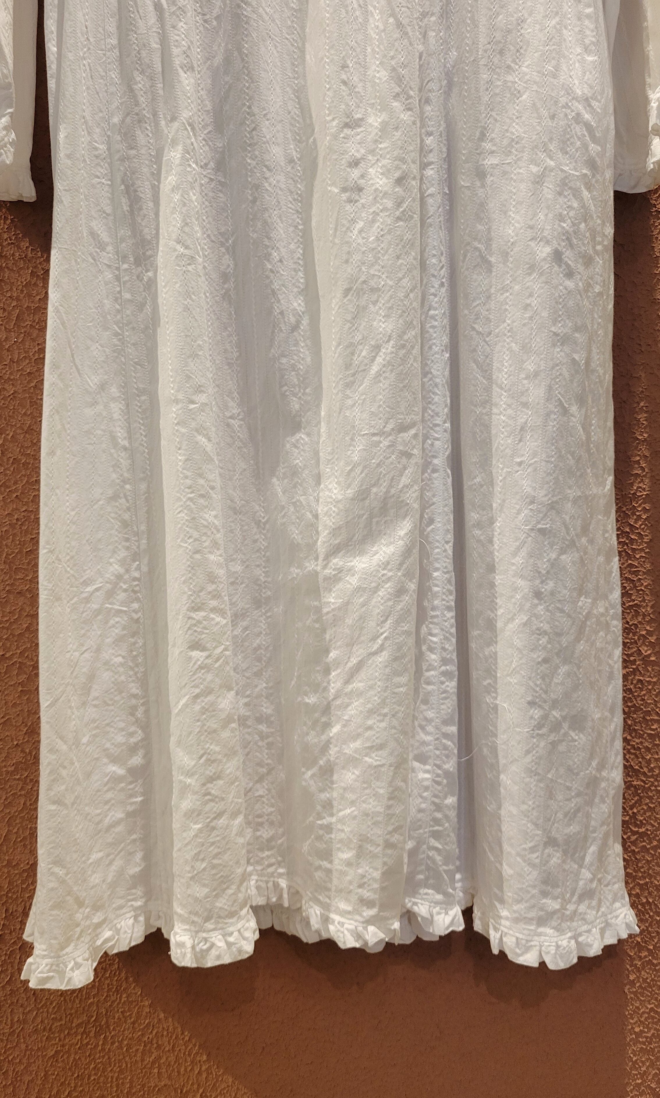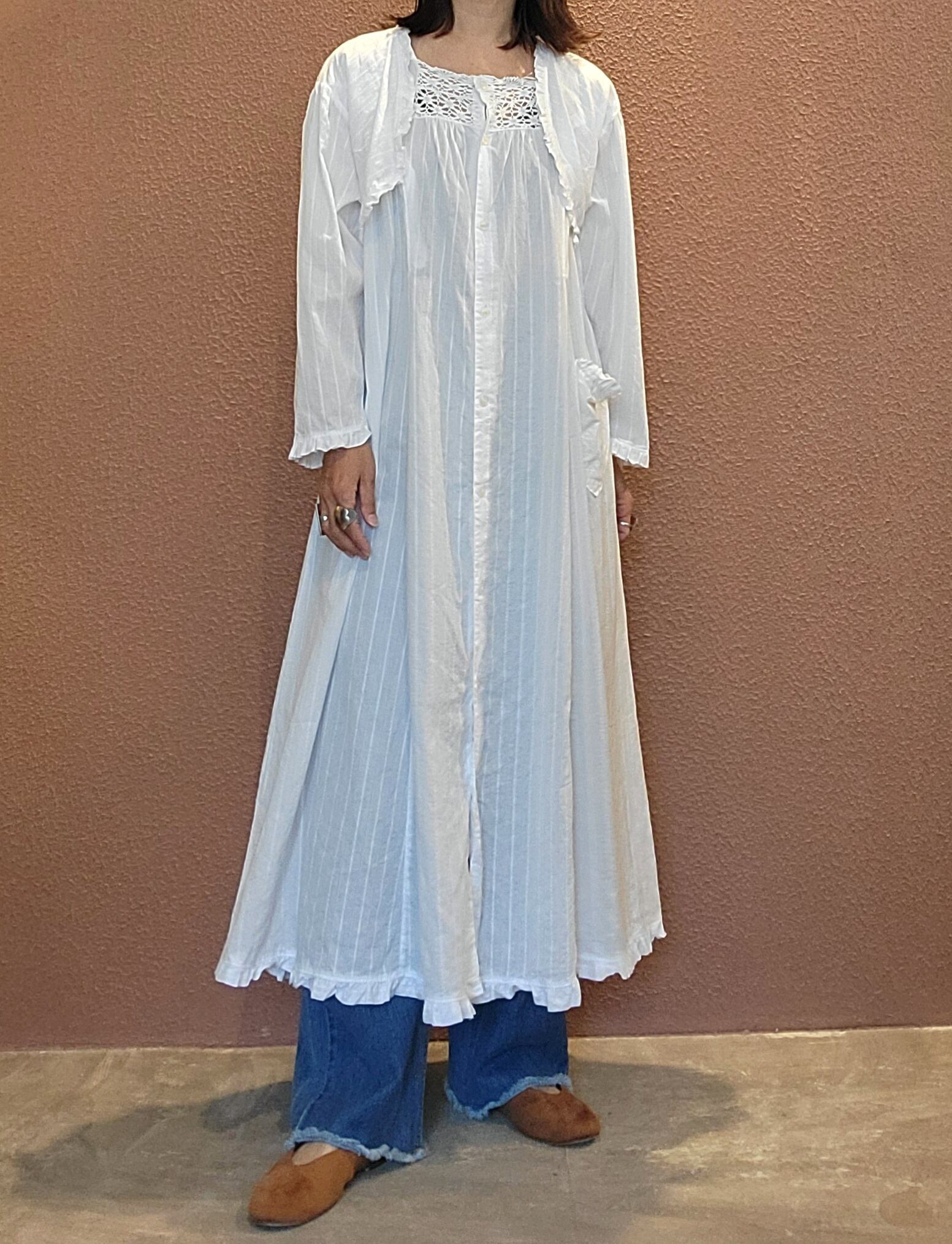 ヴィンテージのレースワンピース。素材表記はありませんがコットンです。ボレロがドッキングしたようなデザインでボレロの前部分をめくると身ごろが開くようになっています(画像参照)。フロントボタンを開けて羽織りのようにも着用できます。ゆったりしたサイズ感とデザインでストレスフリーな着心地。お部屋でのくつろぎ用にもぴったりです。