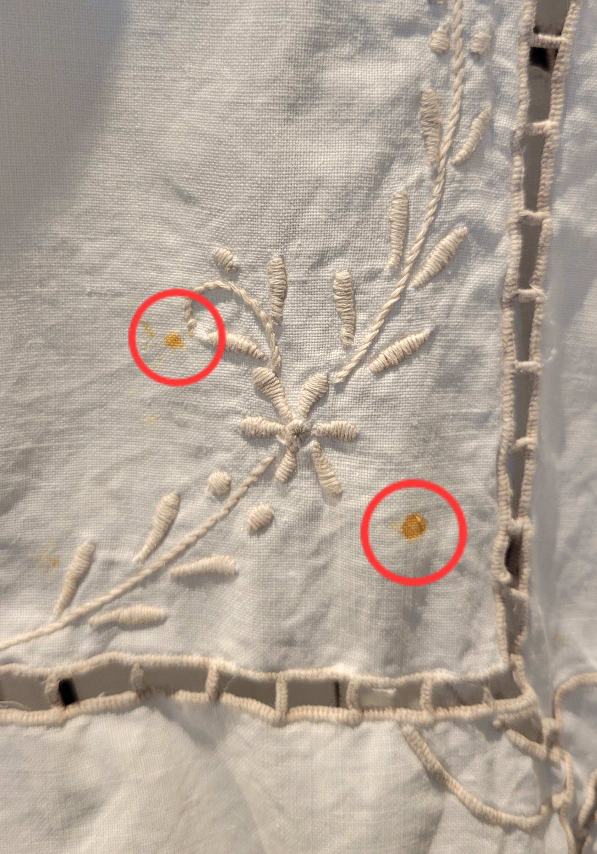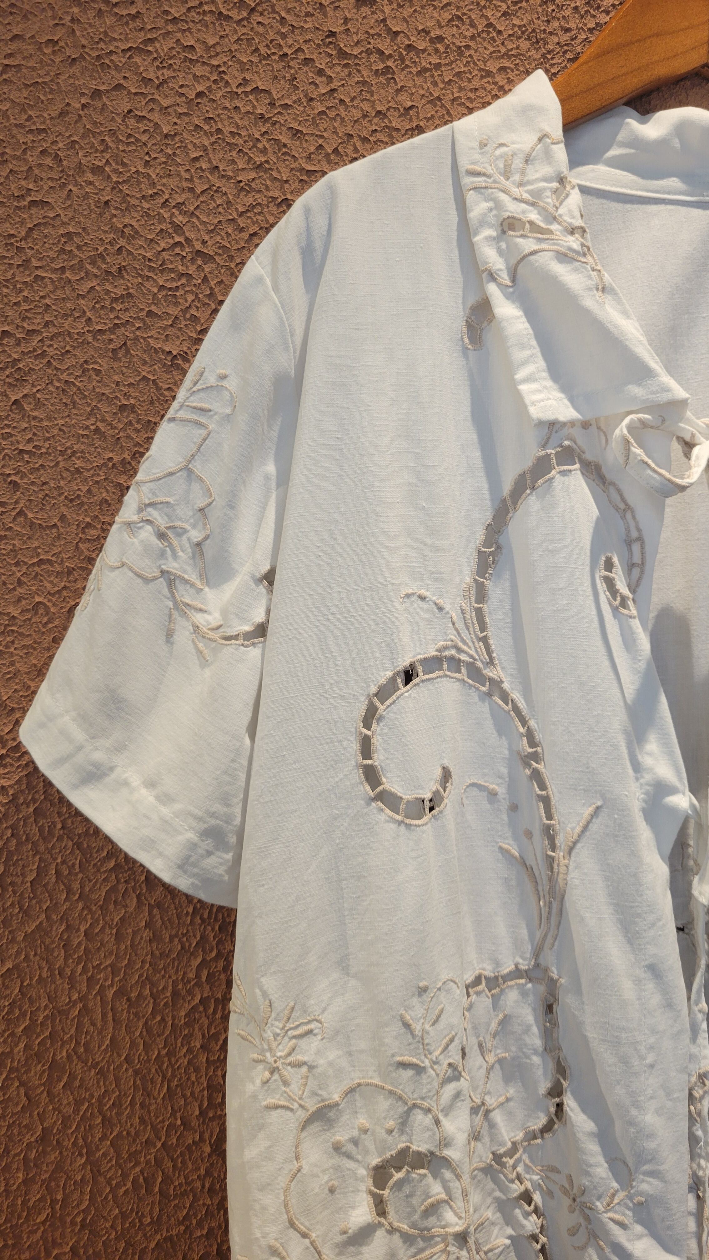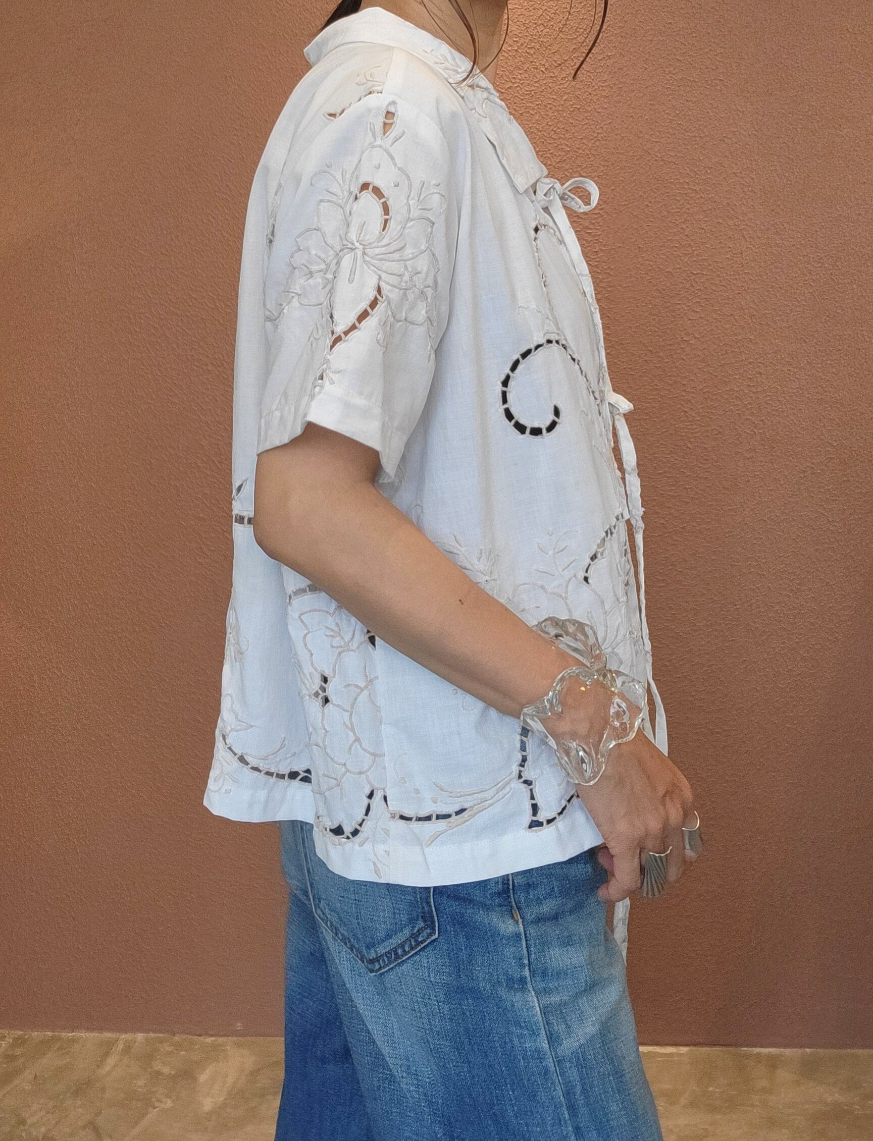 ヴィンテージのカットワークレース生地を使用したリメイクトップス。素材表記はありませんがコットンのようです。さらりと肌触り良く風の通る涼しい素材です。フロントリボンは結ぶとシャツのように、そのまま垂らして羽織りとしても着用できます。*後ろ身ごろ右腰付近に2ヵ所シミがあります(2ミリ、5ミリ程)。画像でご確認ください。