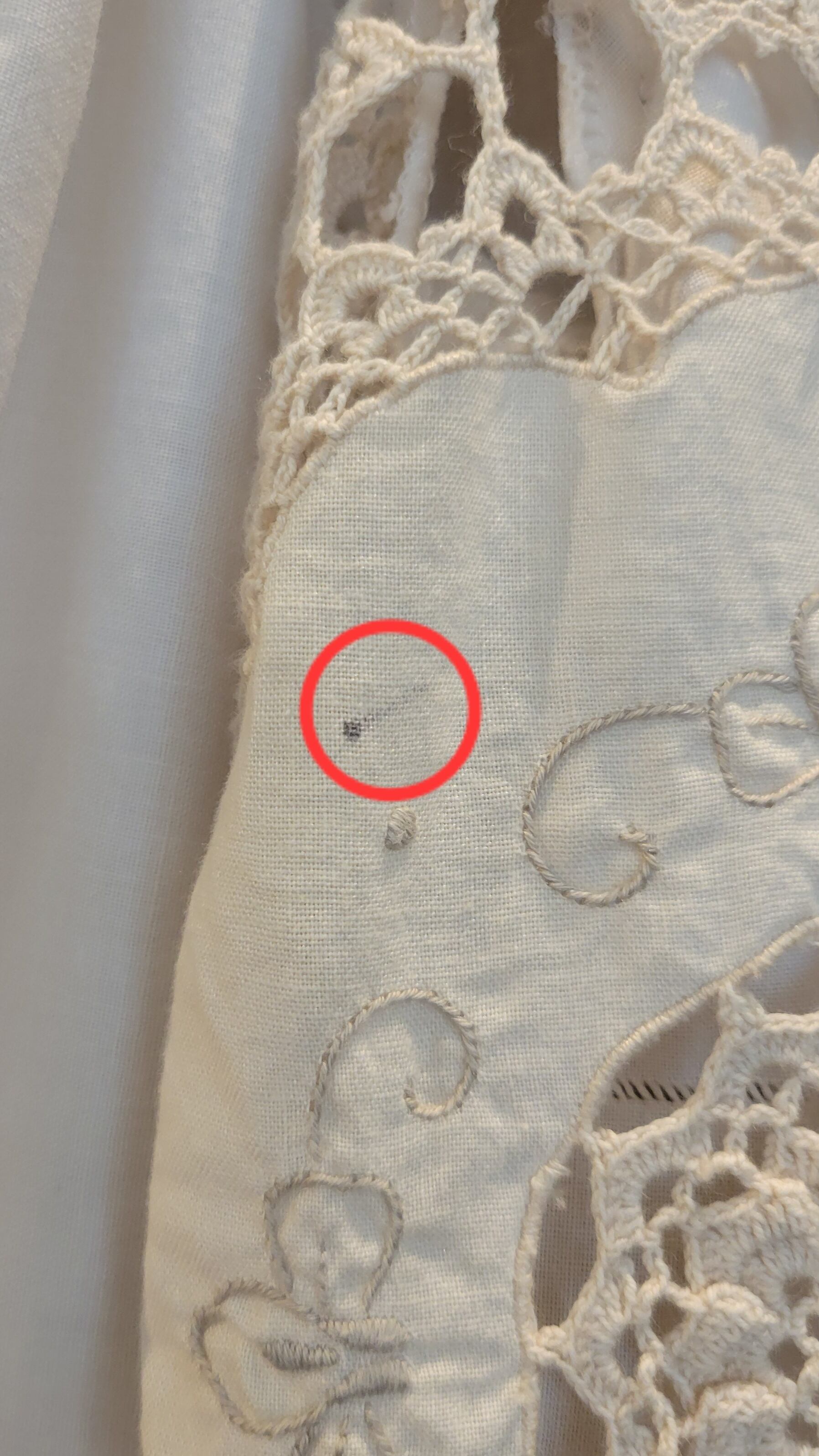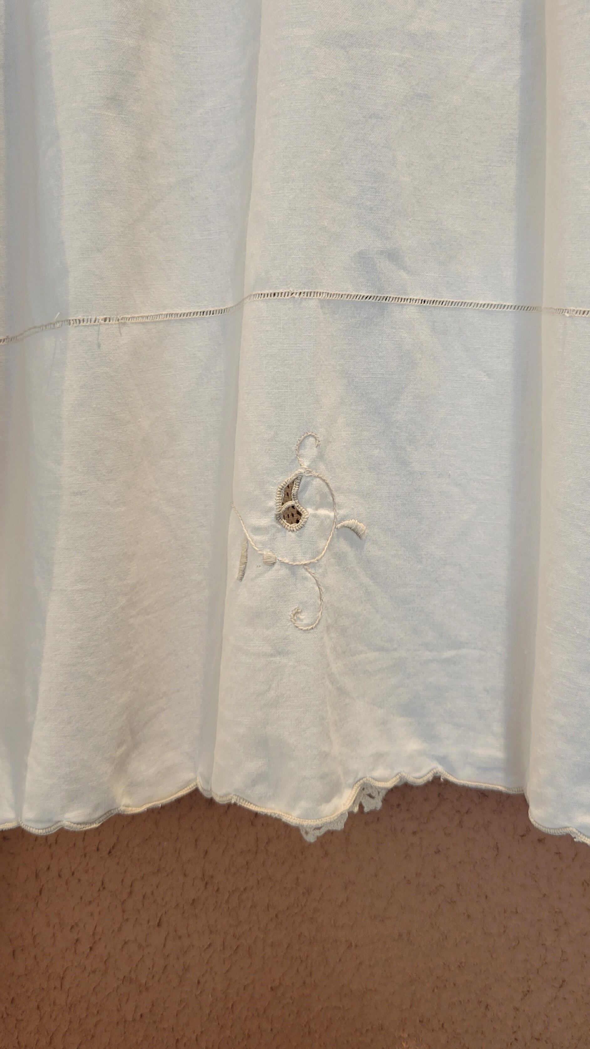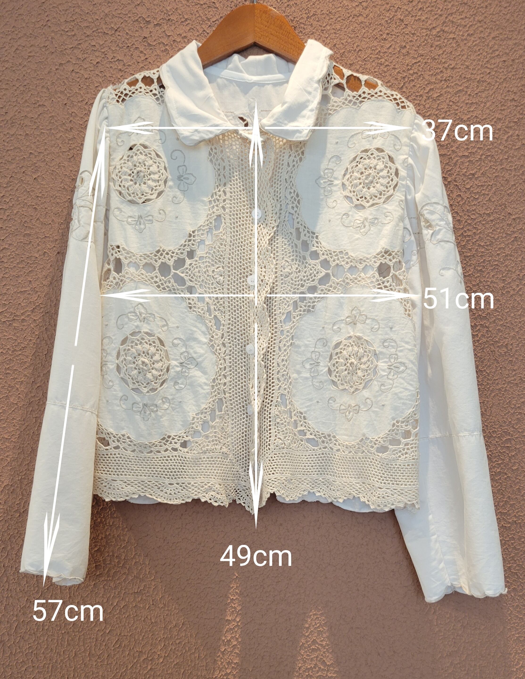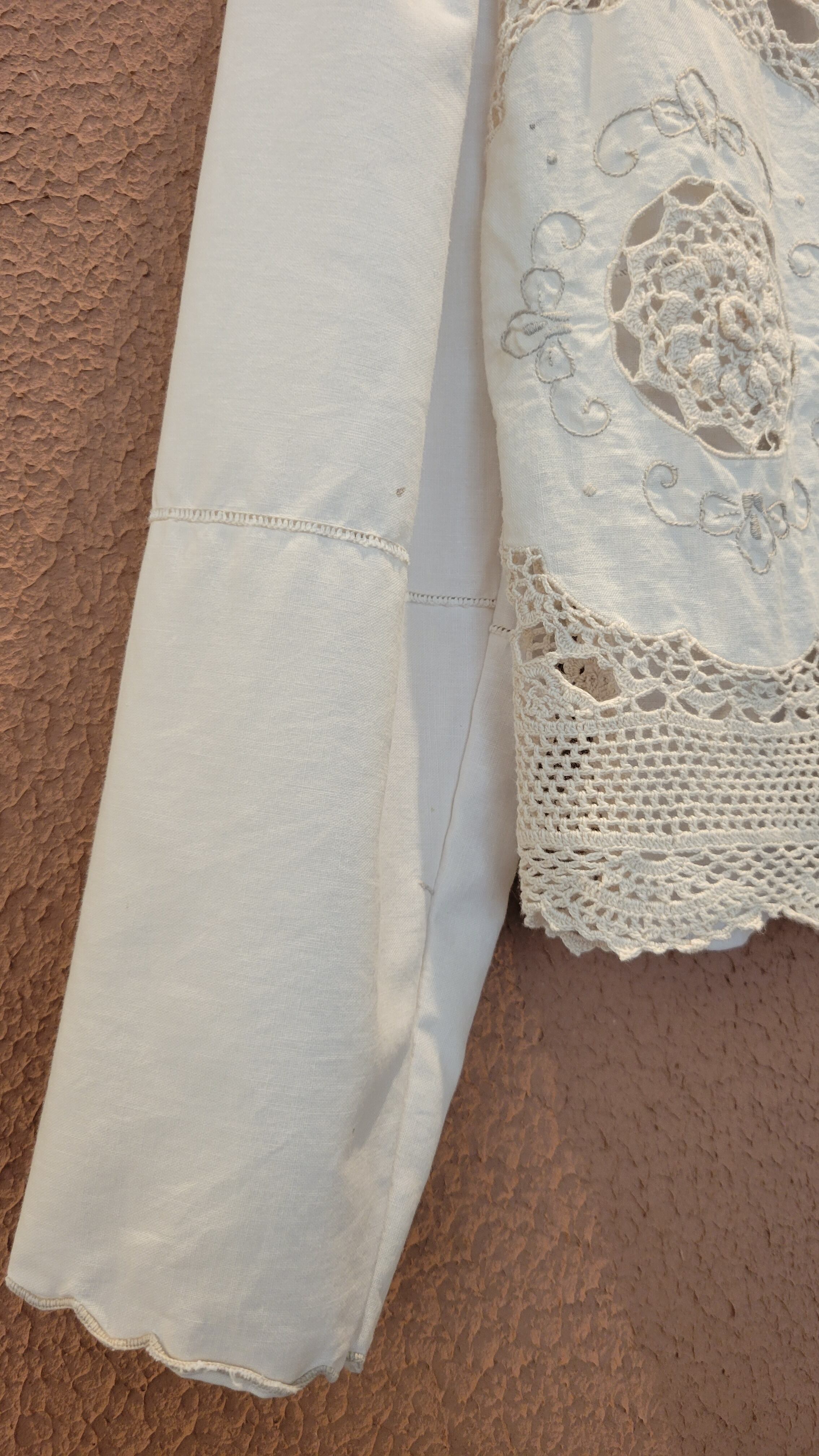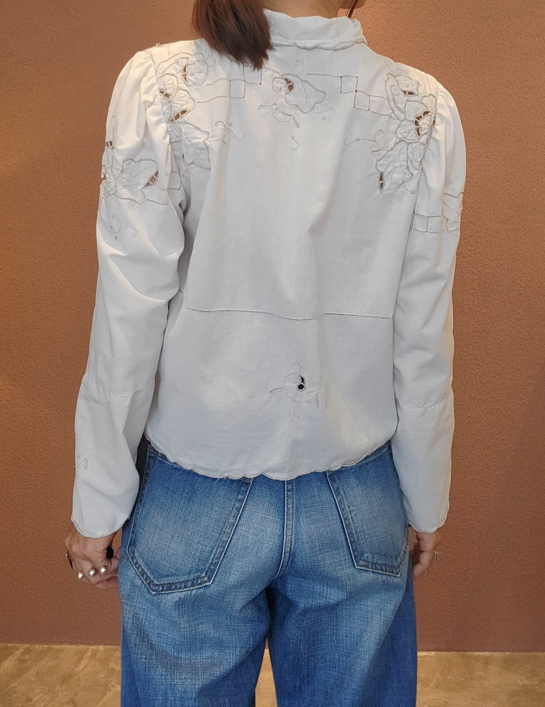 刺繍クロシェとカットワーク刺繍の2種類のヴィンテージ生地を使用したリメイクトップス。素材表記はありませんがコットンのようです。さらりと肌触り良く風の通る涼しい素材です。肩ギャザーのボリューム感とクロップト丈のコンパクト感のバランスが可愛い1枚。ハイウエストのボトムとの相性ぴったりです。*前身ごろ右脇下辺りシミあり(1センチ程)、右袖ひじ内側辺りシミあり(3ミリ程)。画像でご確認ください。