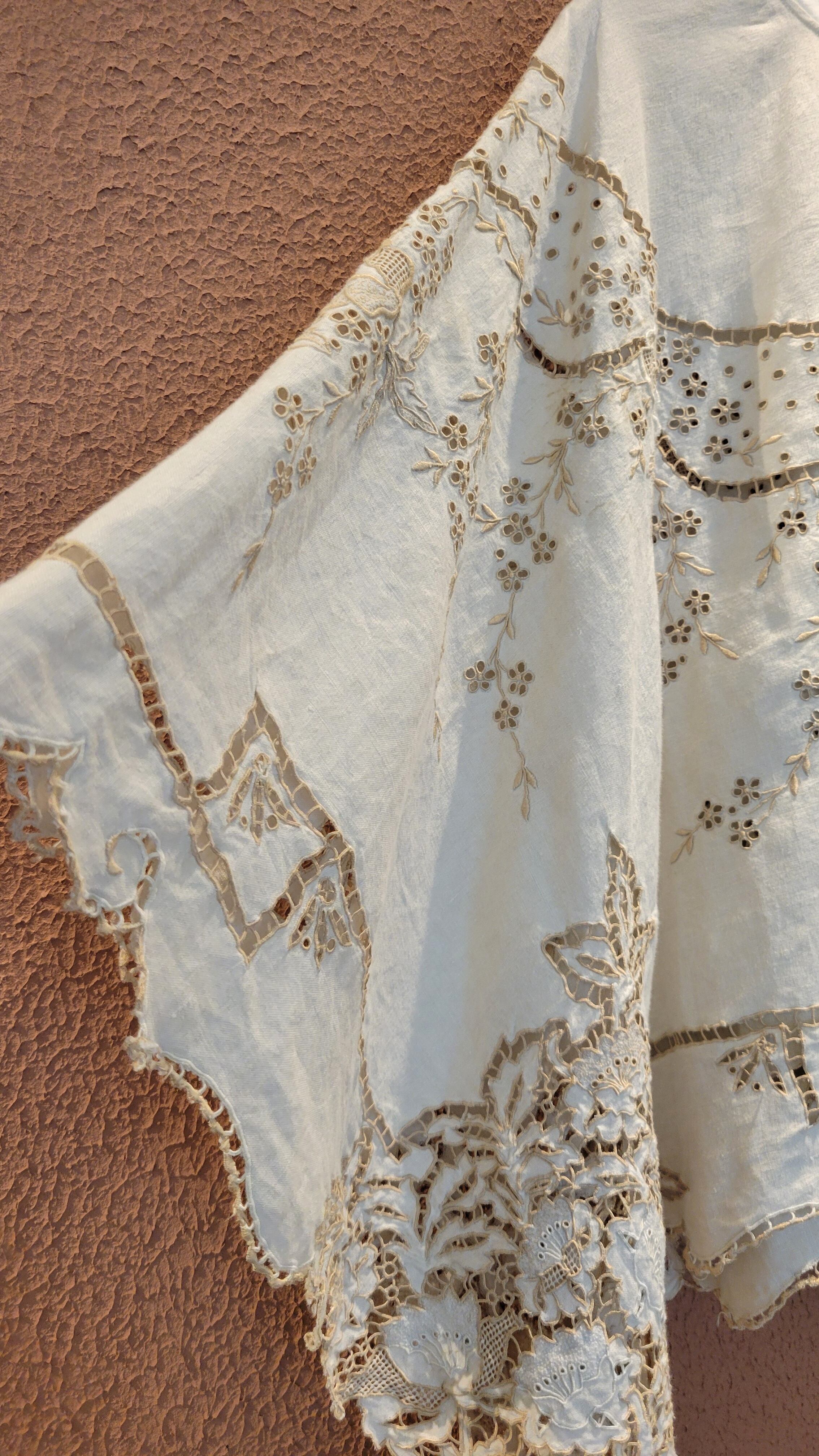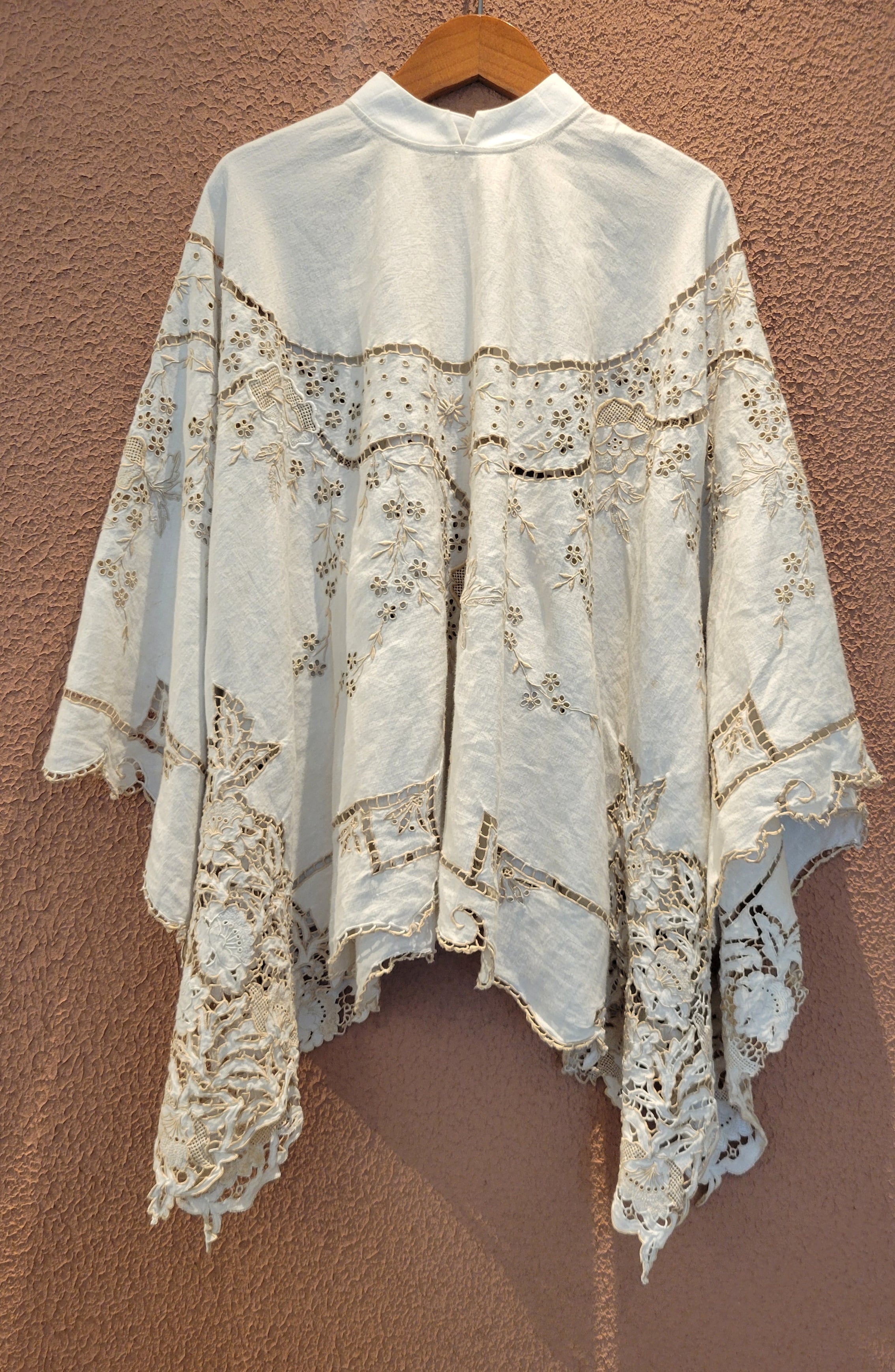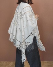 ヴィンテージのカットワーク生地を使用したリメイクトップス。素材表記はありませんがややしっかりしたリネンのようです。前後どちらでも着用できる2way仕様。サイドオープンで頭からすっぽり被るだけのポンチョタイプです。インナーにキャミソールやタンクトップを着用して涼しく着られます。とても細かく美しいカットワーク刺繍が魅力の1枚。