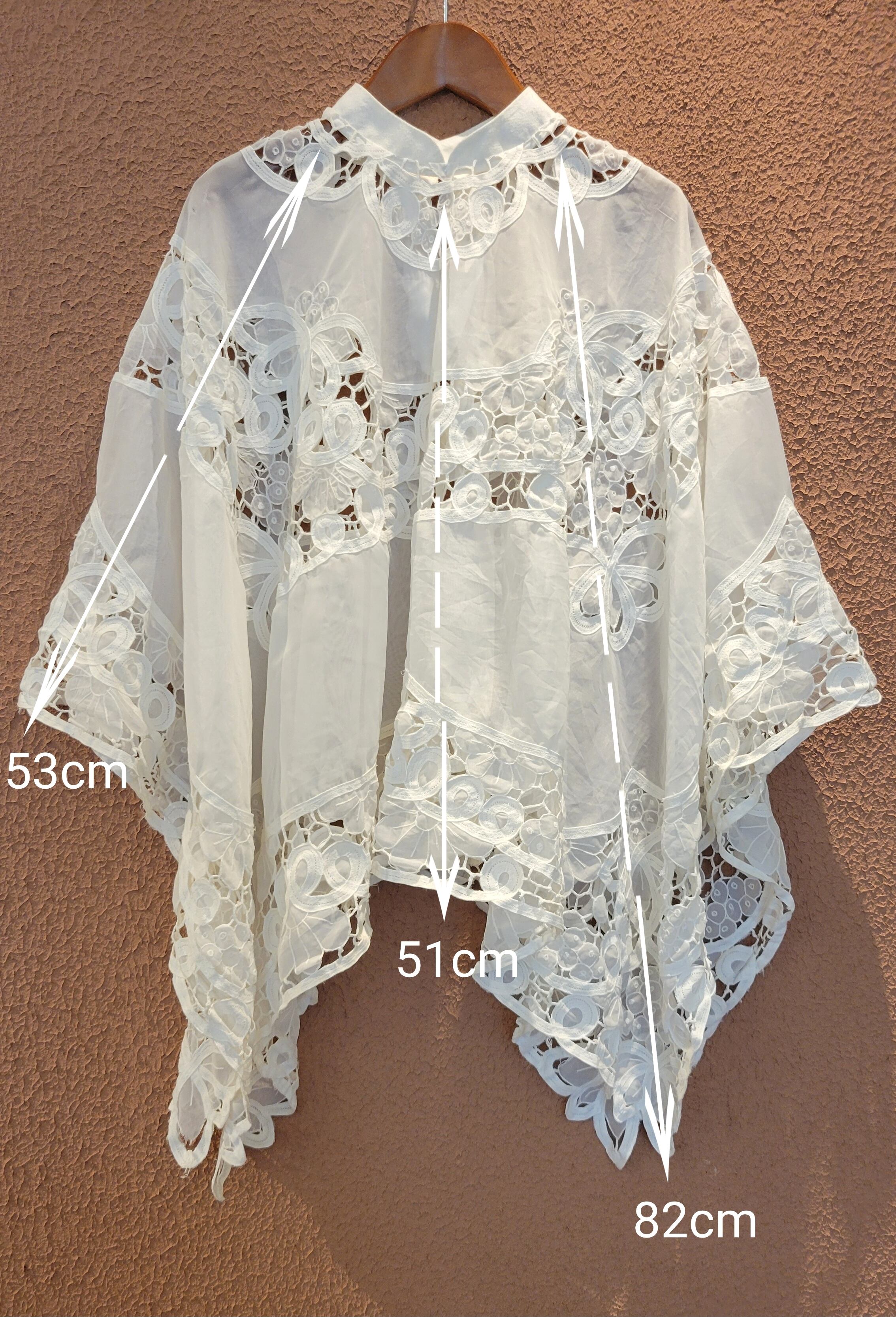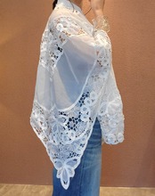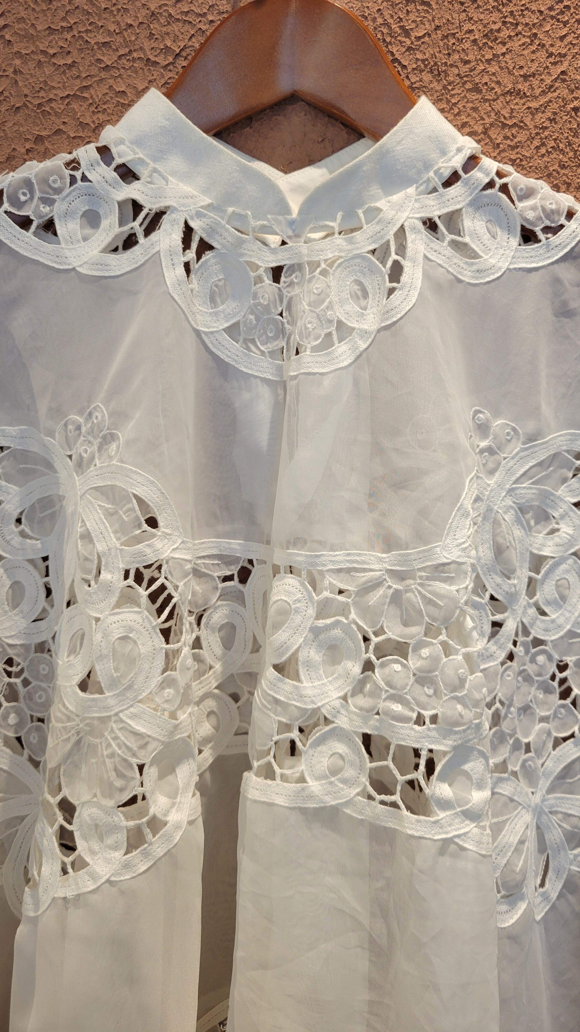ヴィンテージのバテンレース生地を使用したリメイクトップス。素材表記はありませんがポリエステルのようです。透け感があります。サイドオープンで頭からすっぽり被るだけのポンチョタイプです。インナーにキャミソールやタンクトップを着用して涼しく着られます。レースの美しい模様が魅力の1枚。