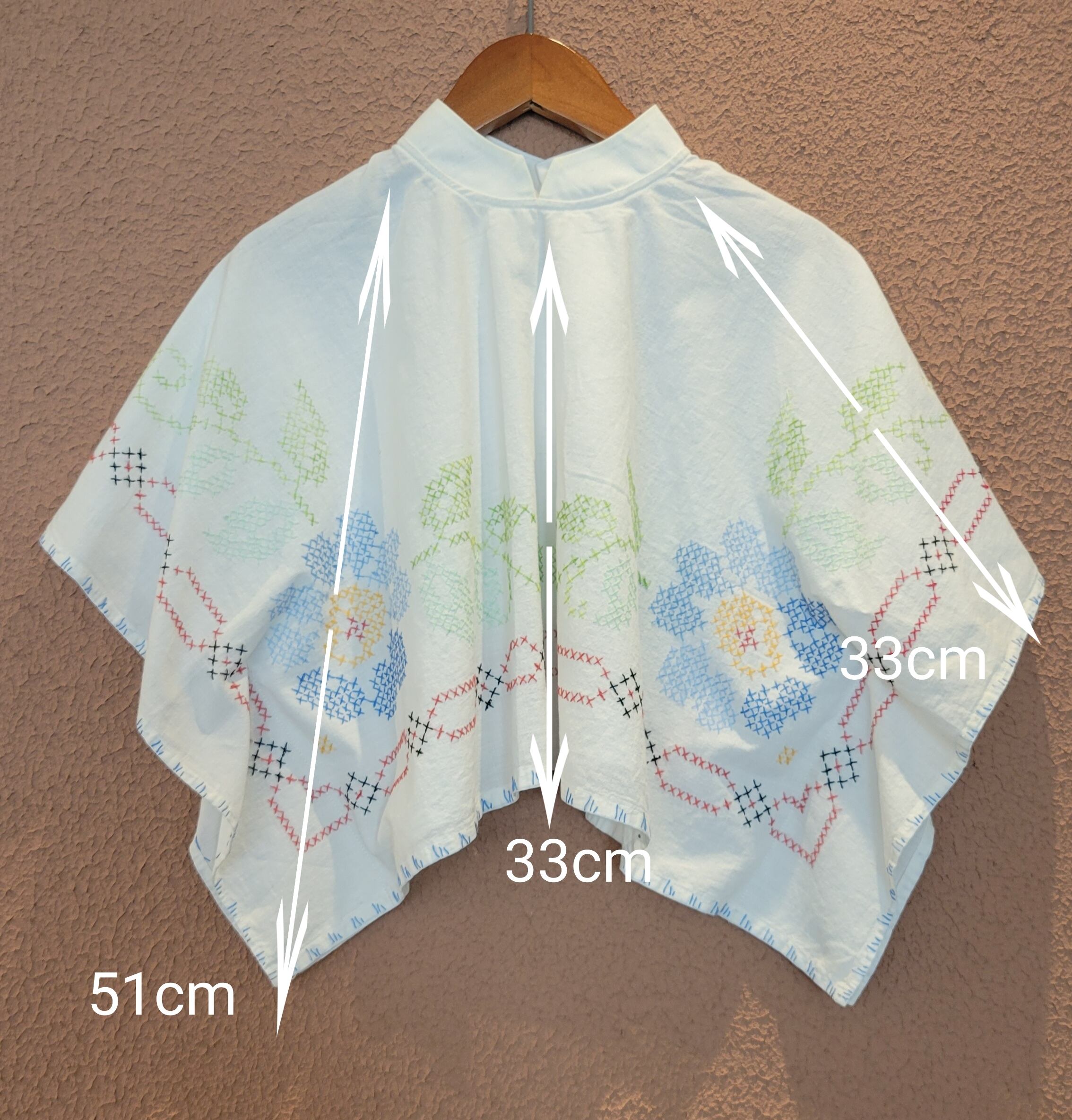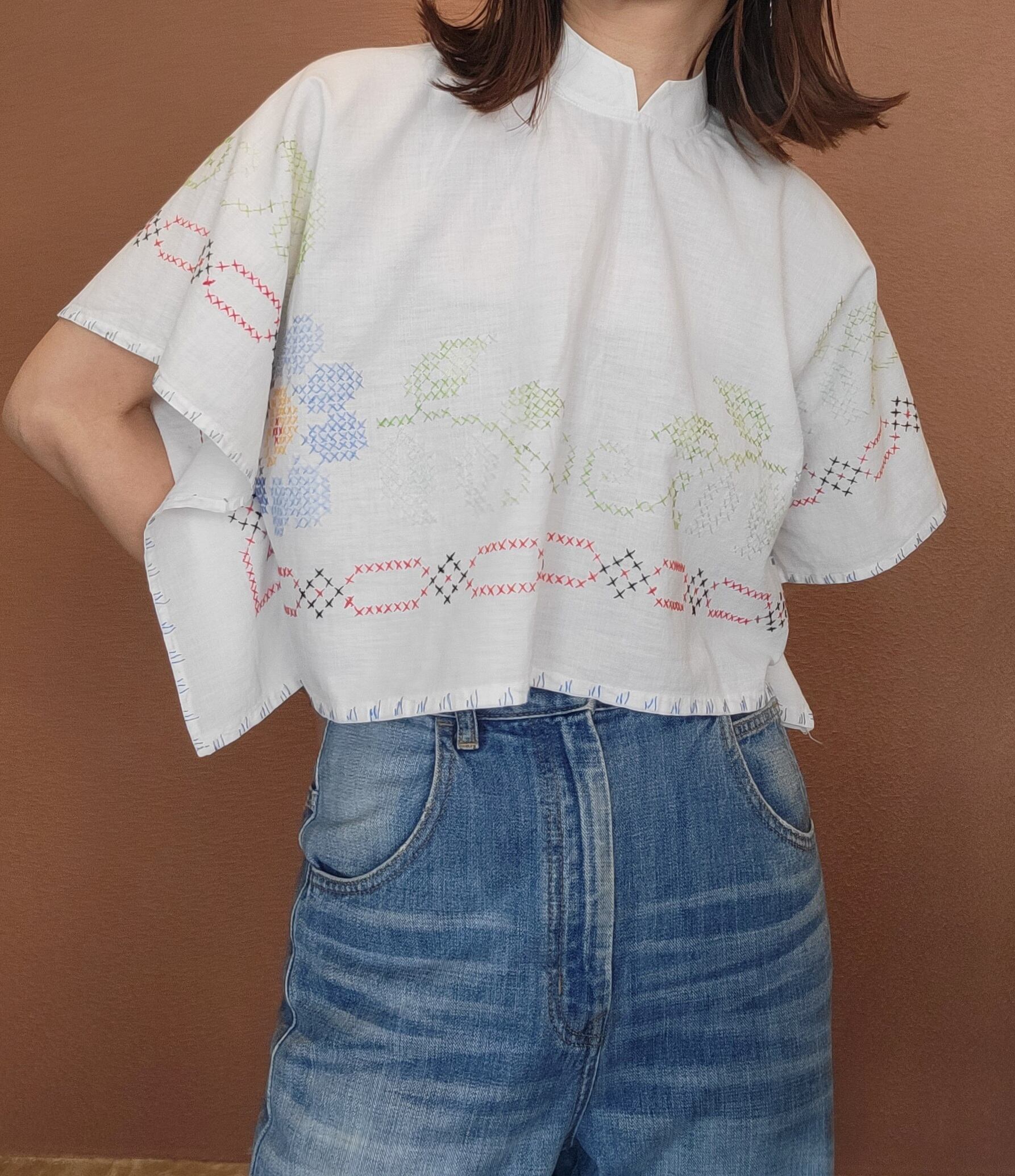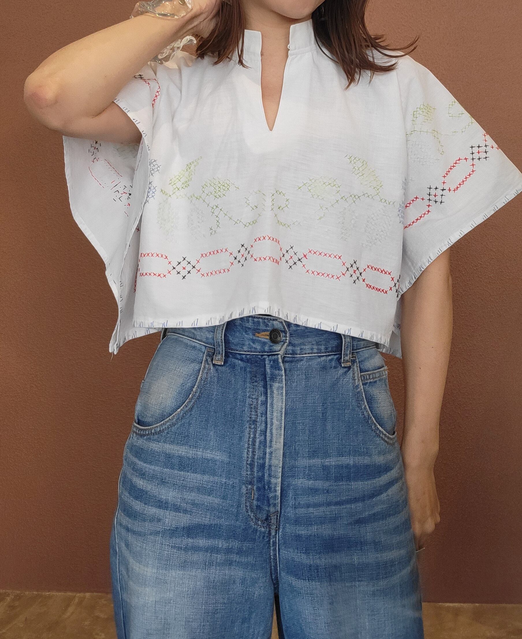 ヴィンテージの刺繍クロスを使用したリメイクトップス。素材表記はありませんがコットンです。前後どちらでも着用できます。サイドは縫われており腕を通して着用します。ショート丈でコンパクトなトップスはハイウエストボトムとの相性ぴったりです。