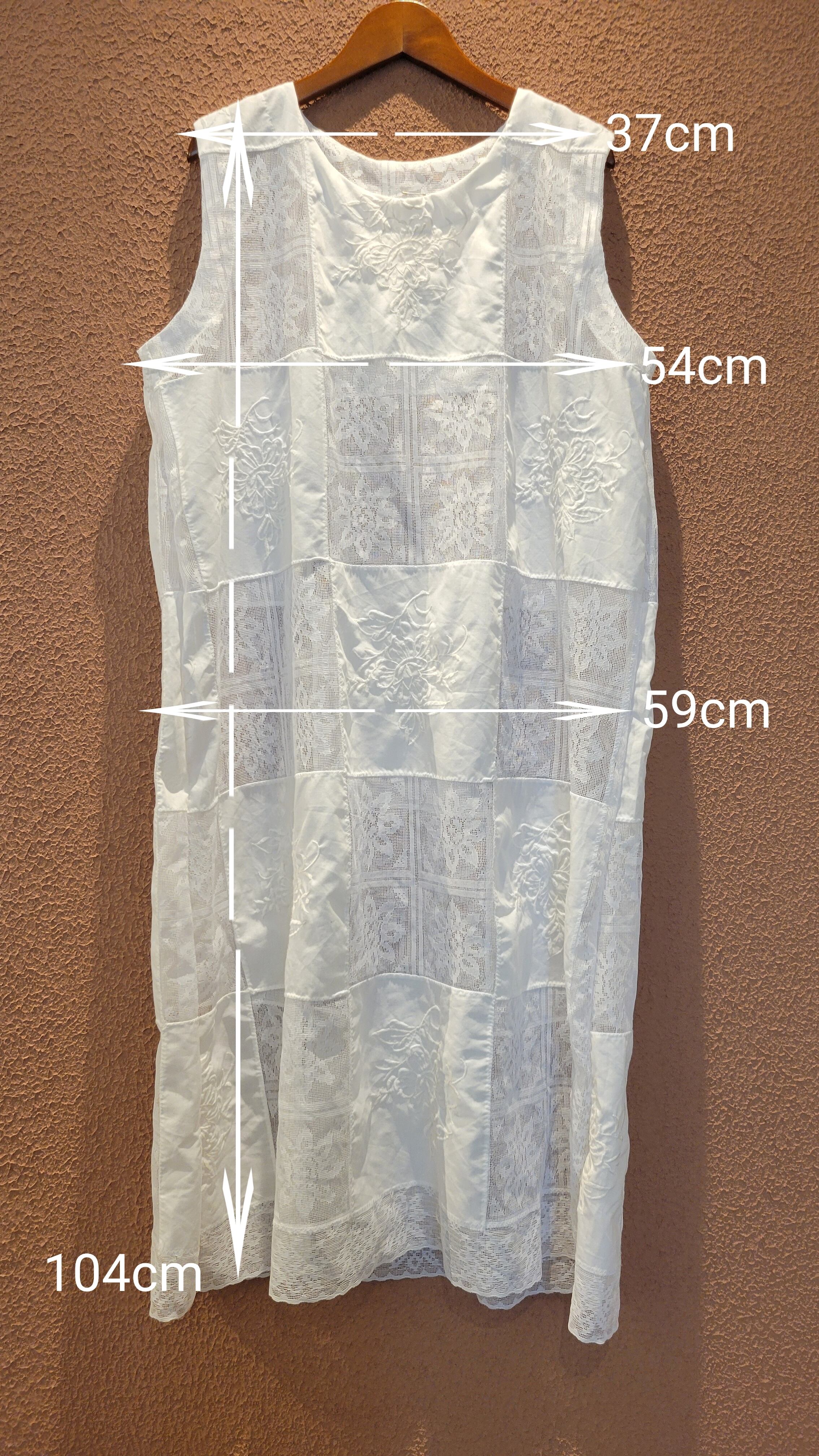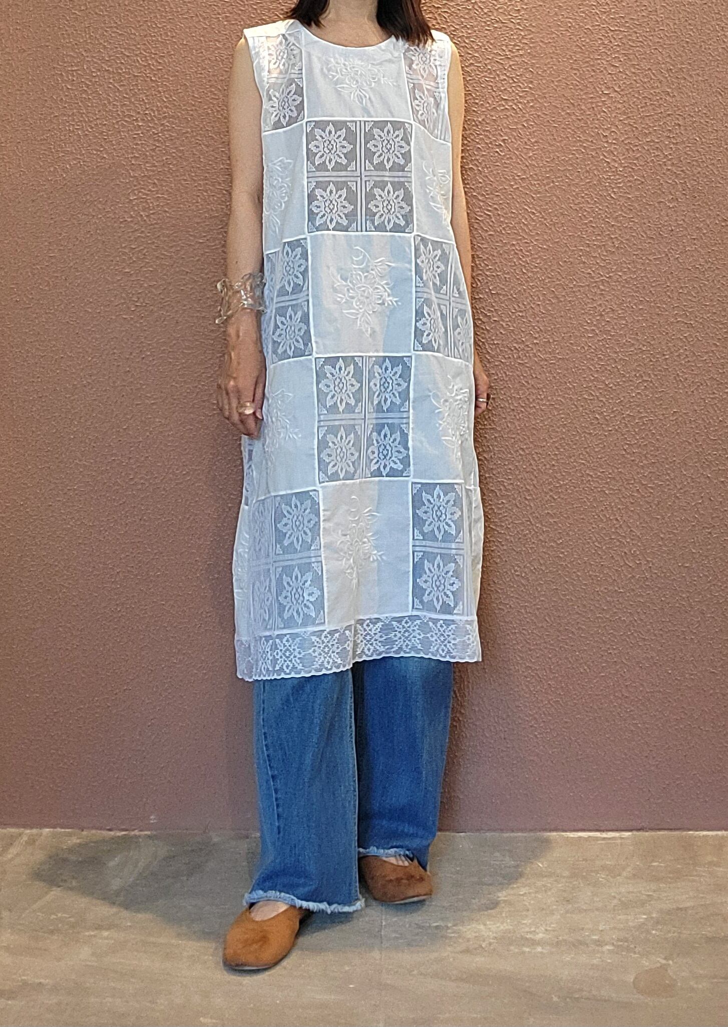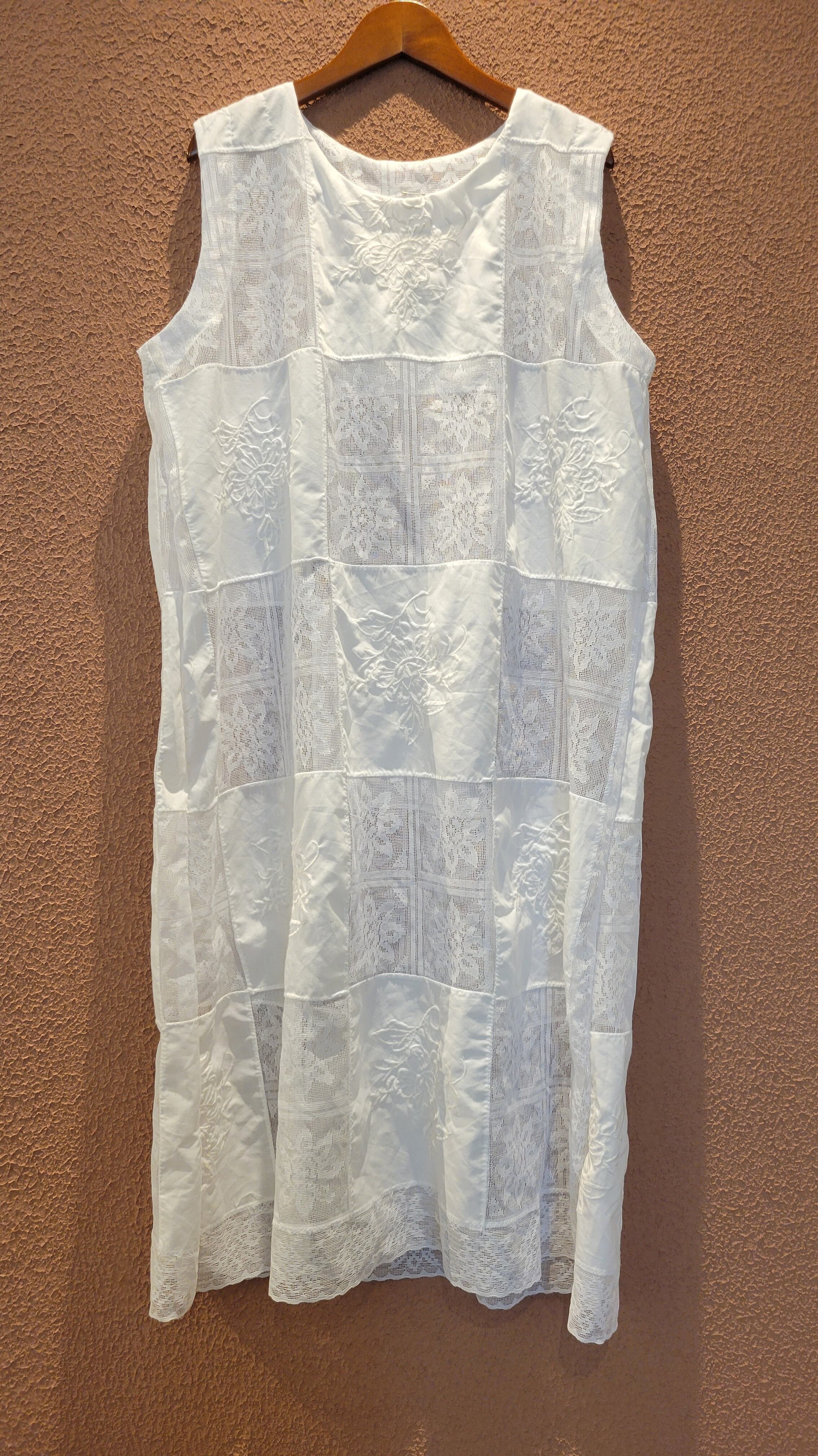 ヴィンテージレースを使用したリメイクワンピース。素材表記はありませんがコットンのようです。ファスナーは付いていないプルオーバータイプです。透け感のある繊細なレースと刺繍が清涼感のある1枚。レイヤードスタイルでお楽しみください。
