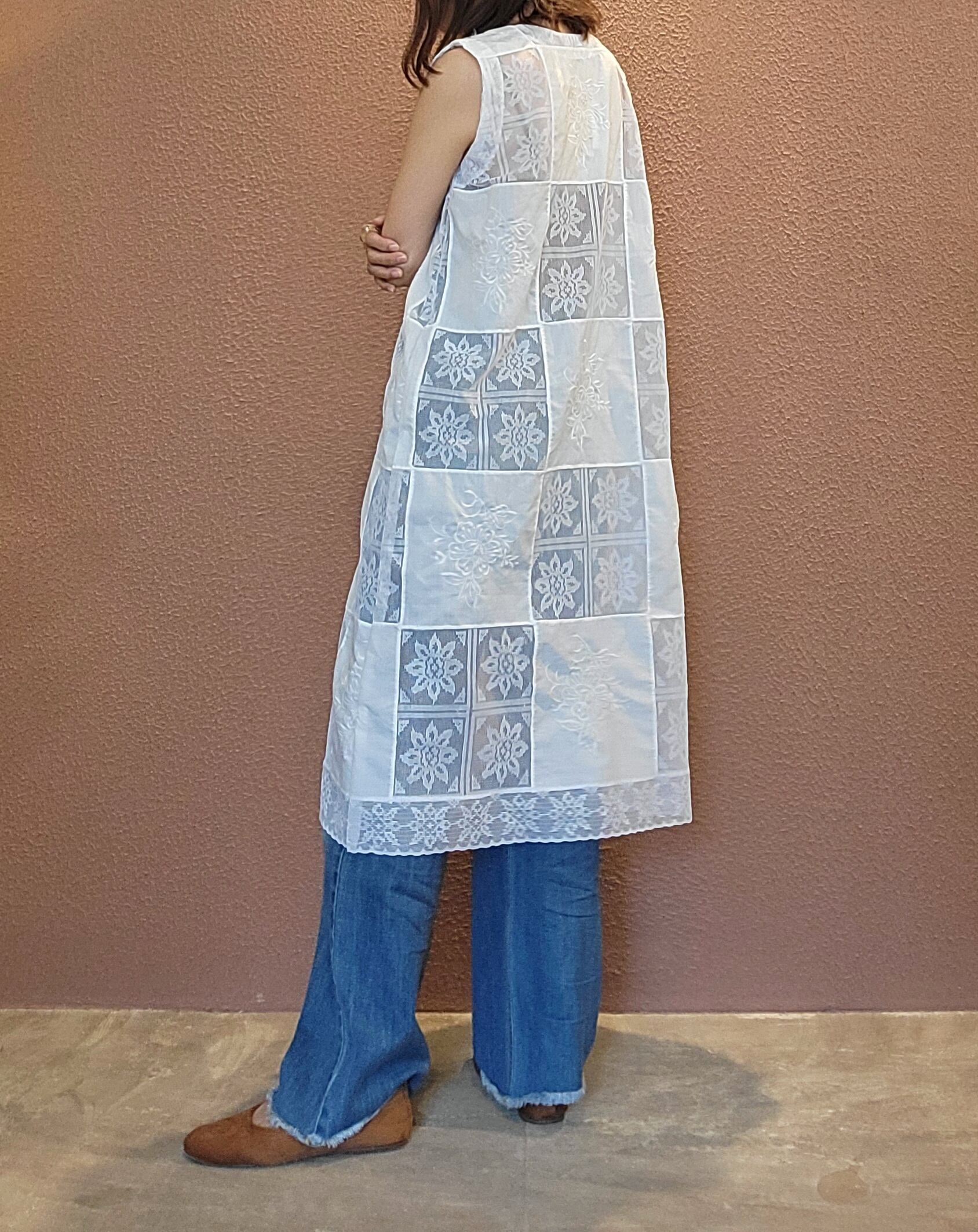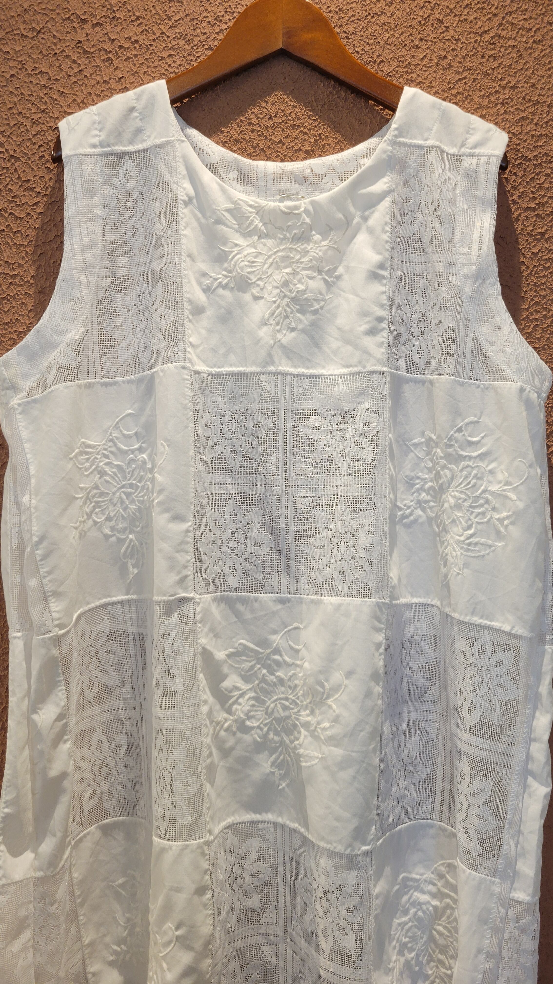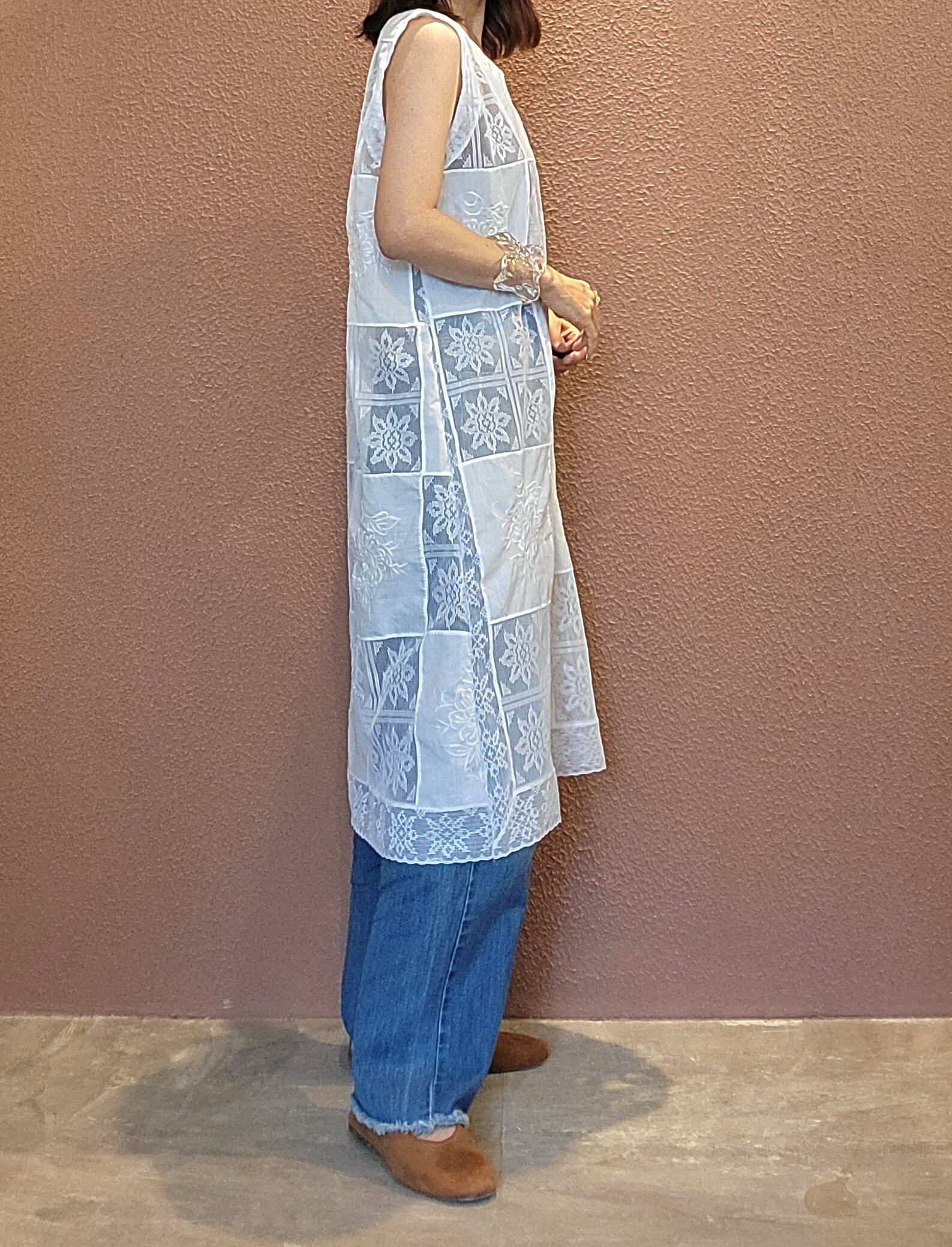ヴィンテージレースを使用したリメイクワンピース。素材表記はありませんがコットンのようです。ファスナーは付いていないプルオーバータイプです。透け感のある繊細なレースと刺繍が清涼感のある1枚。レイヤードスタイルでお楽しみください。