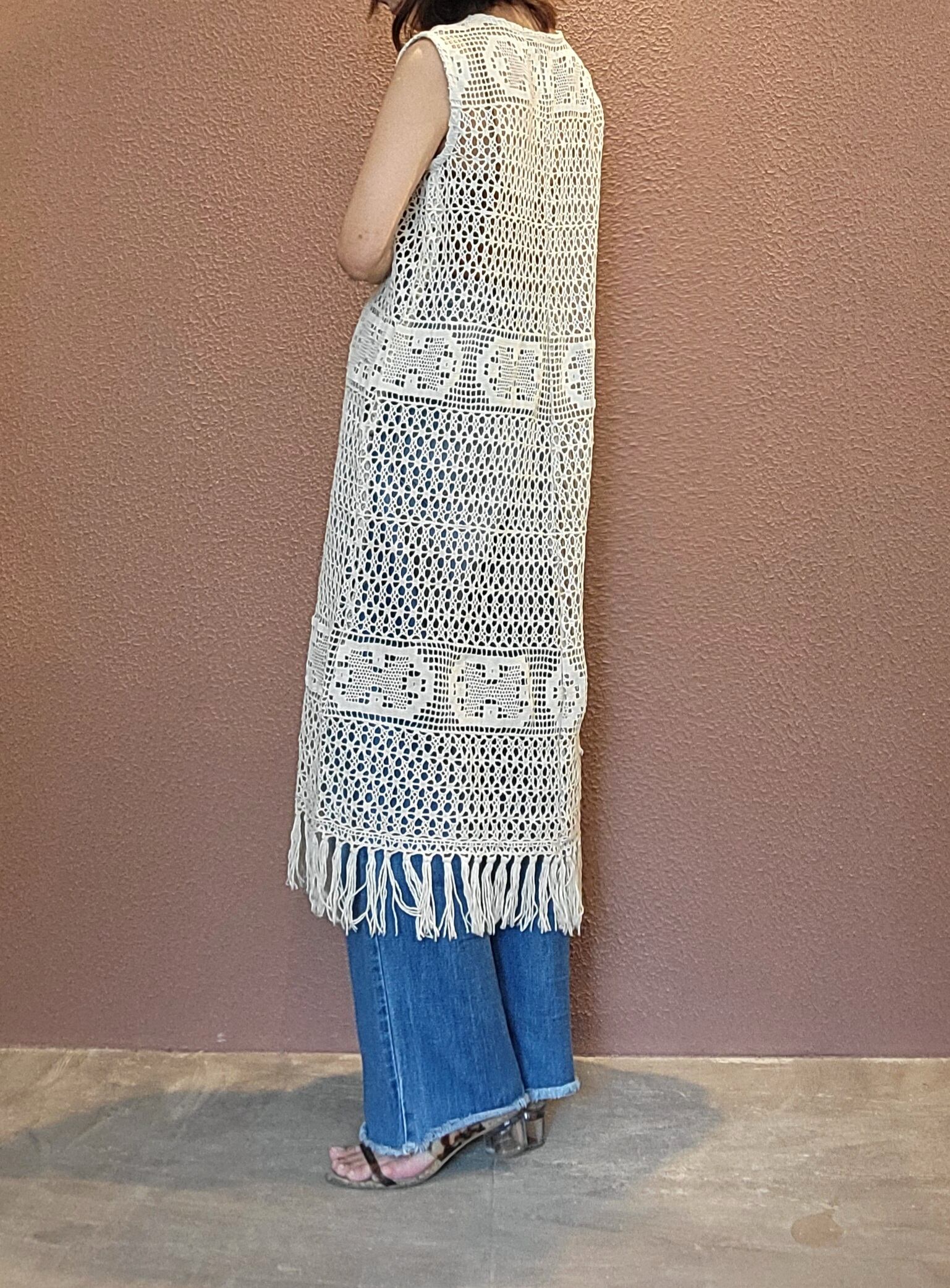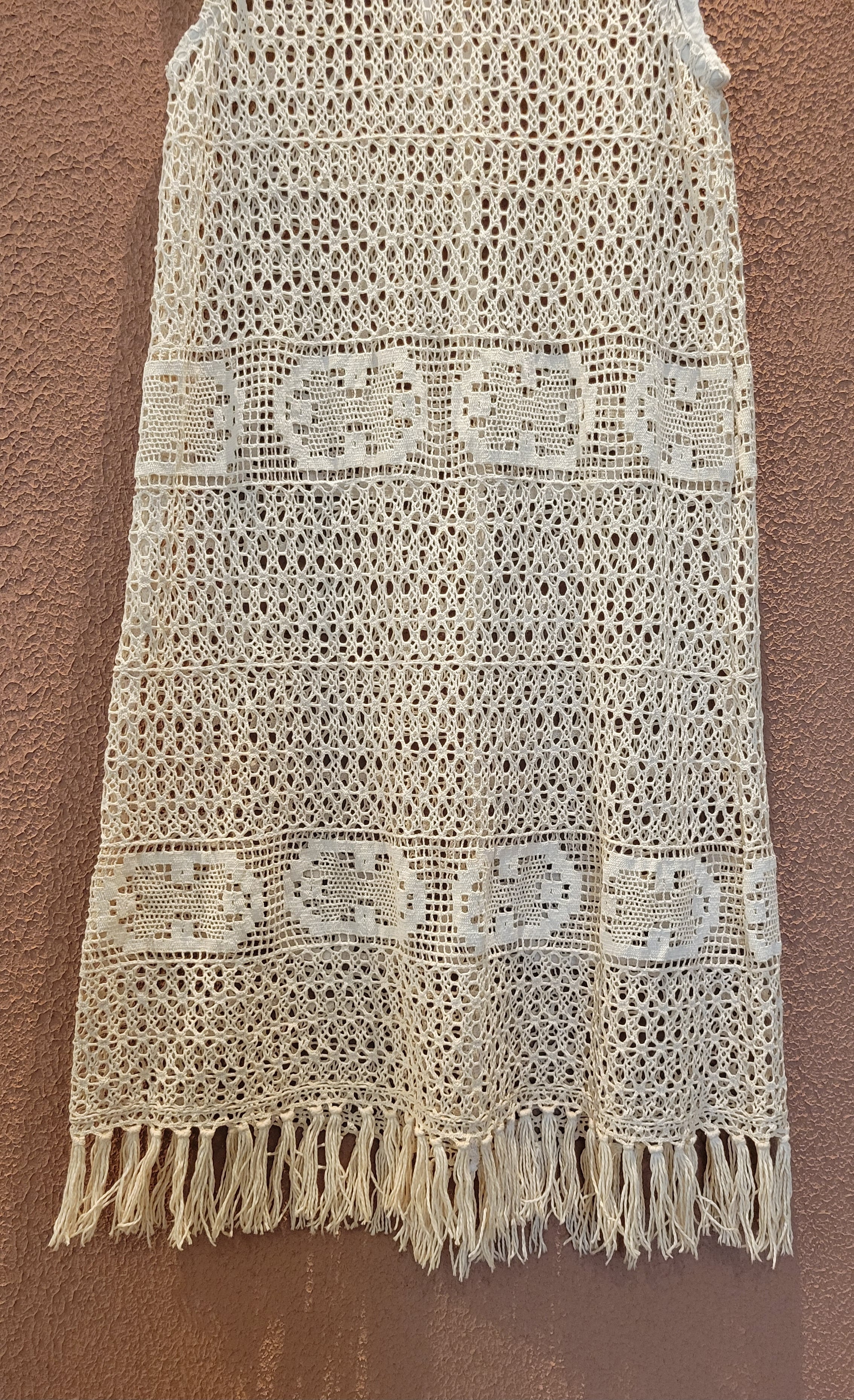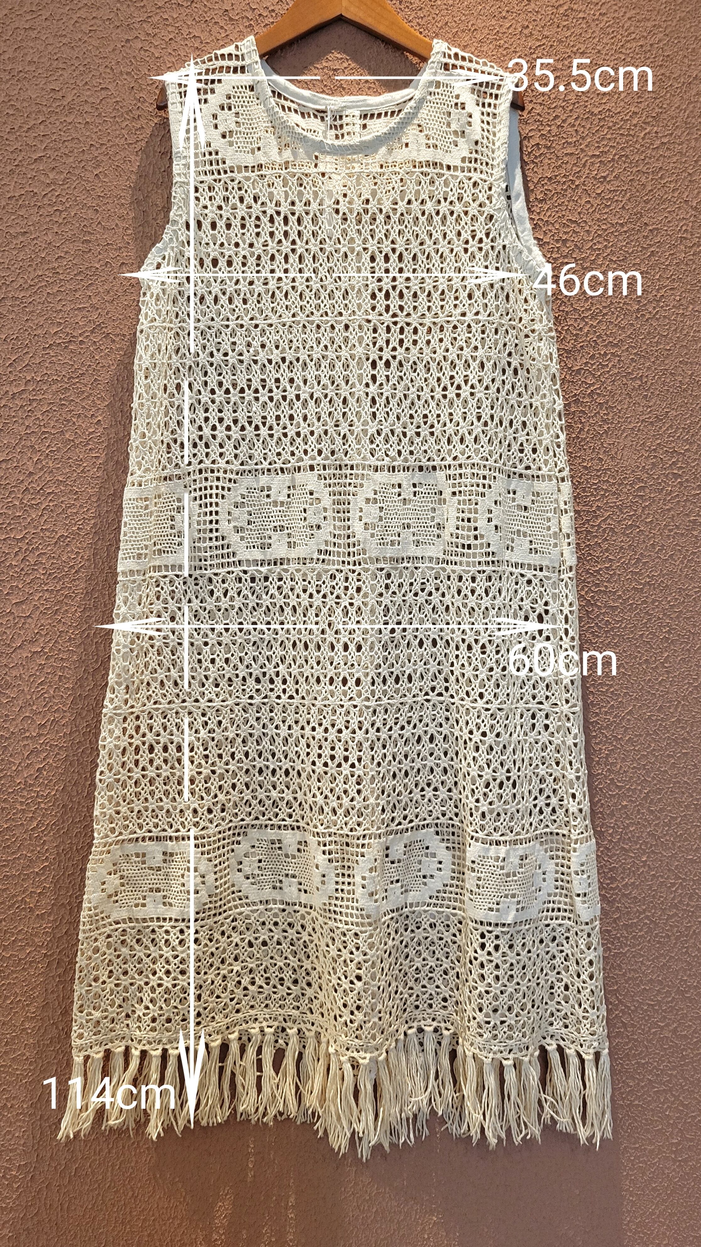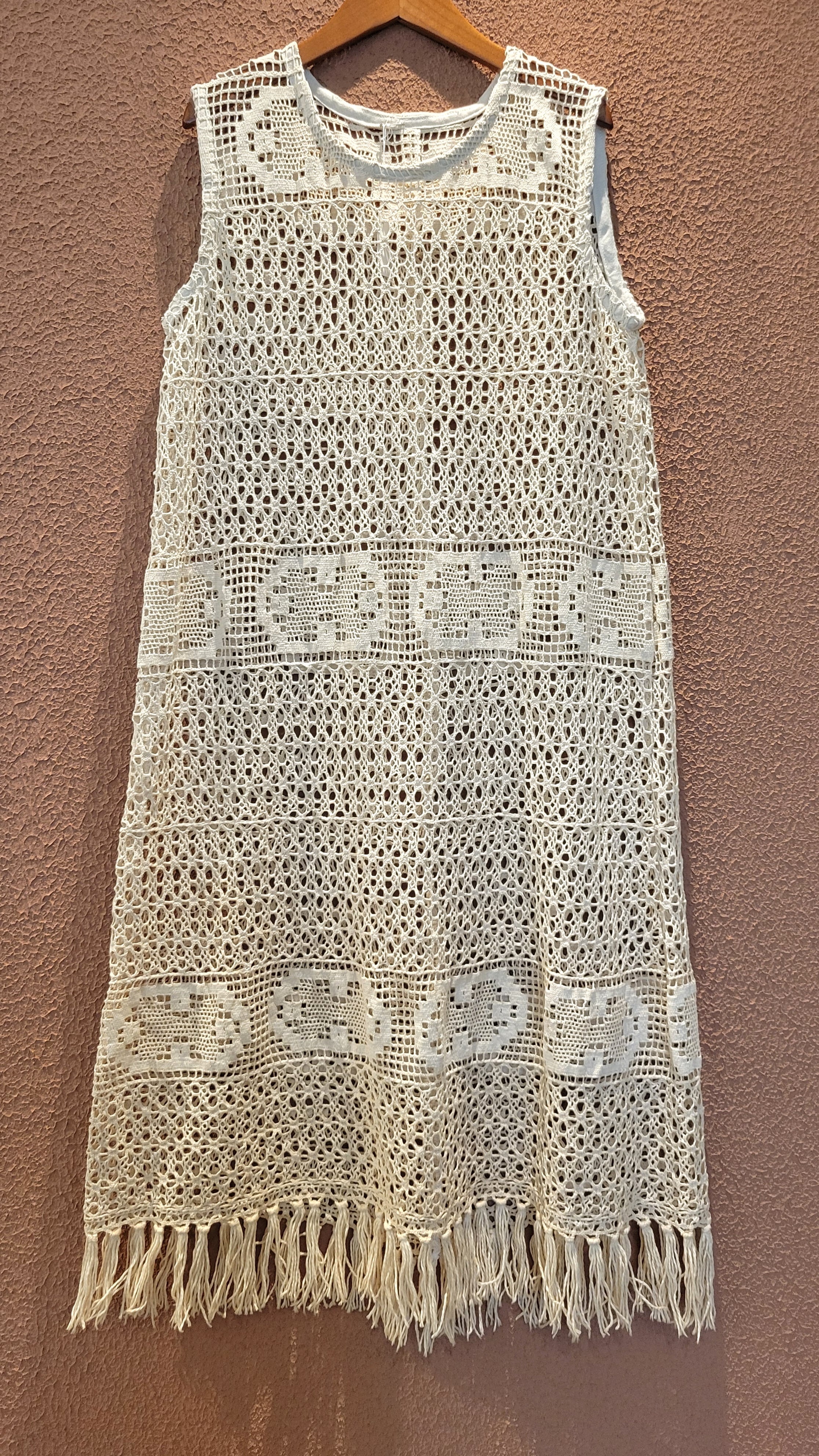 ヴィンテージのクロシェ生地を使用したリメイクワンピース。素材表記はありませんがコットンのようです。ファスナーは付いていないプルオーバータイプです。総クロシェで涼しく着ていただけます。レイヤードスタイルでお楽しみください。