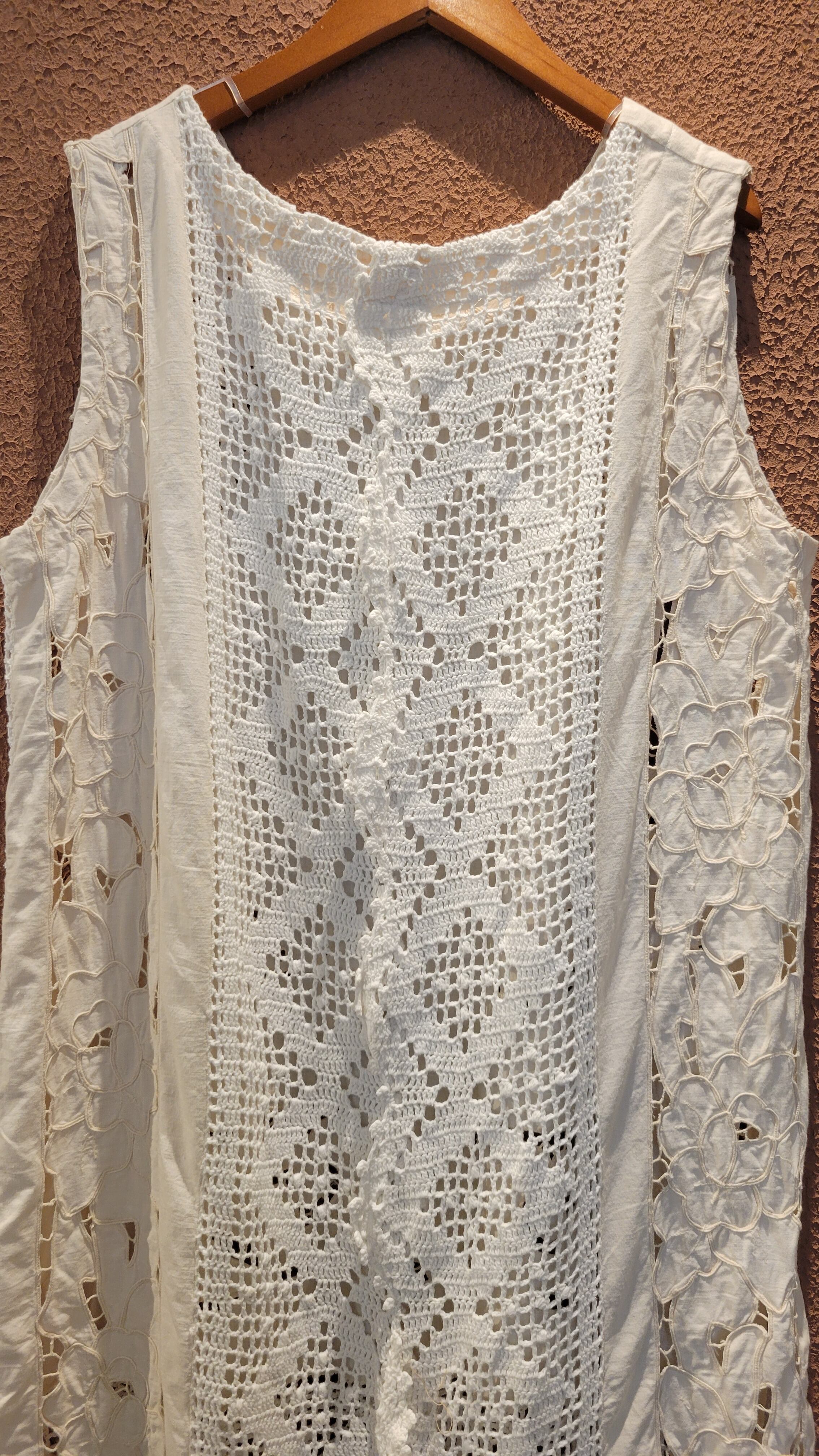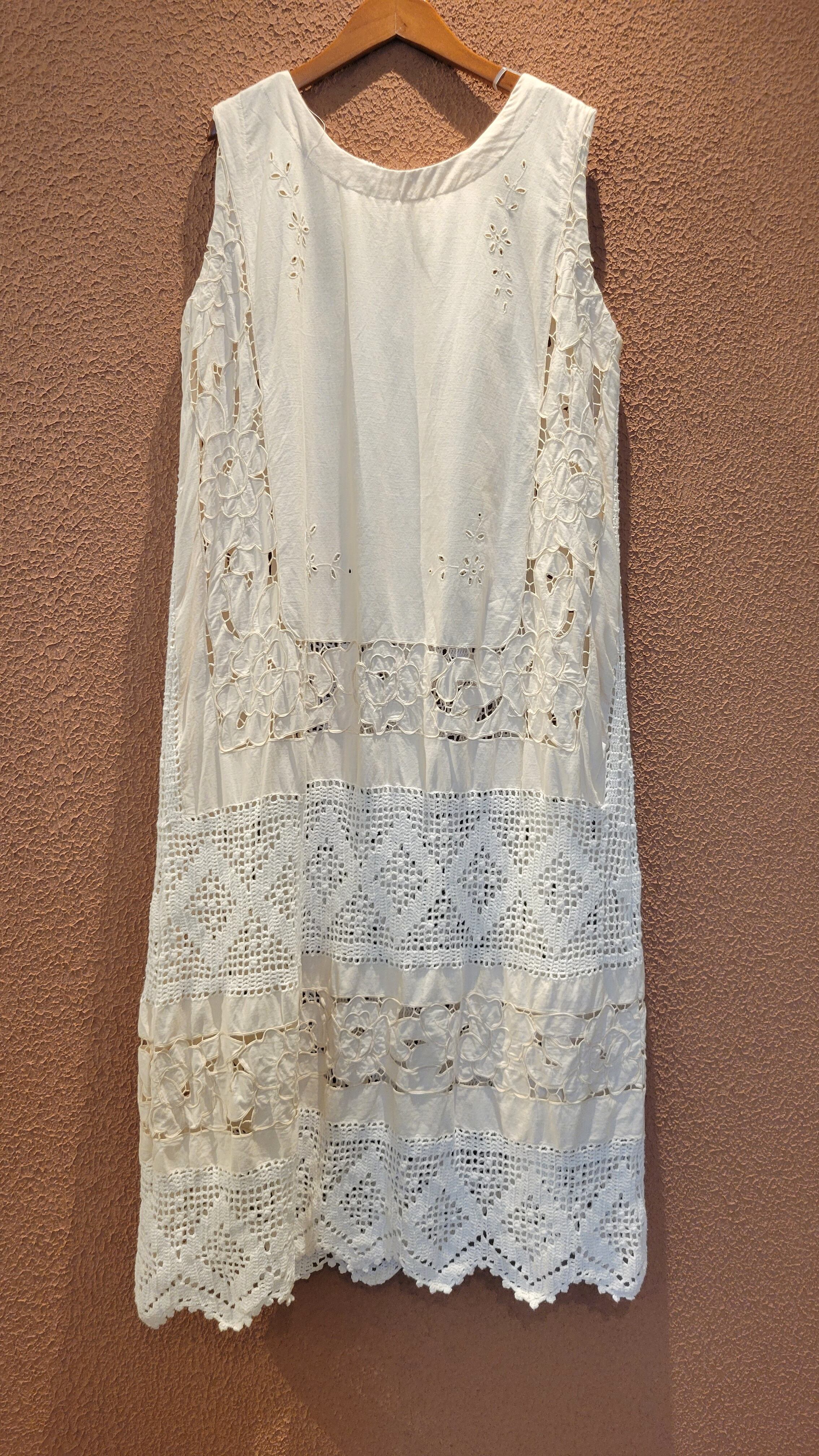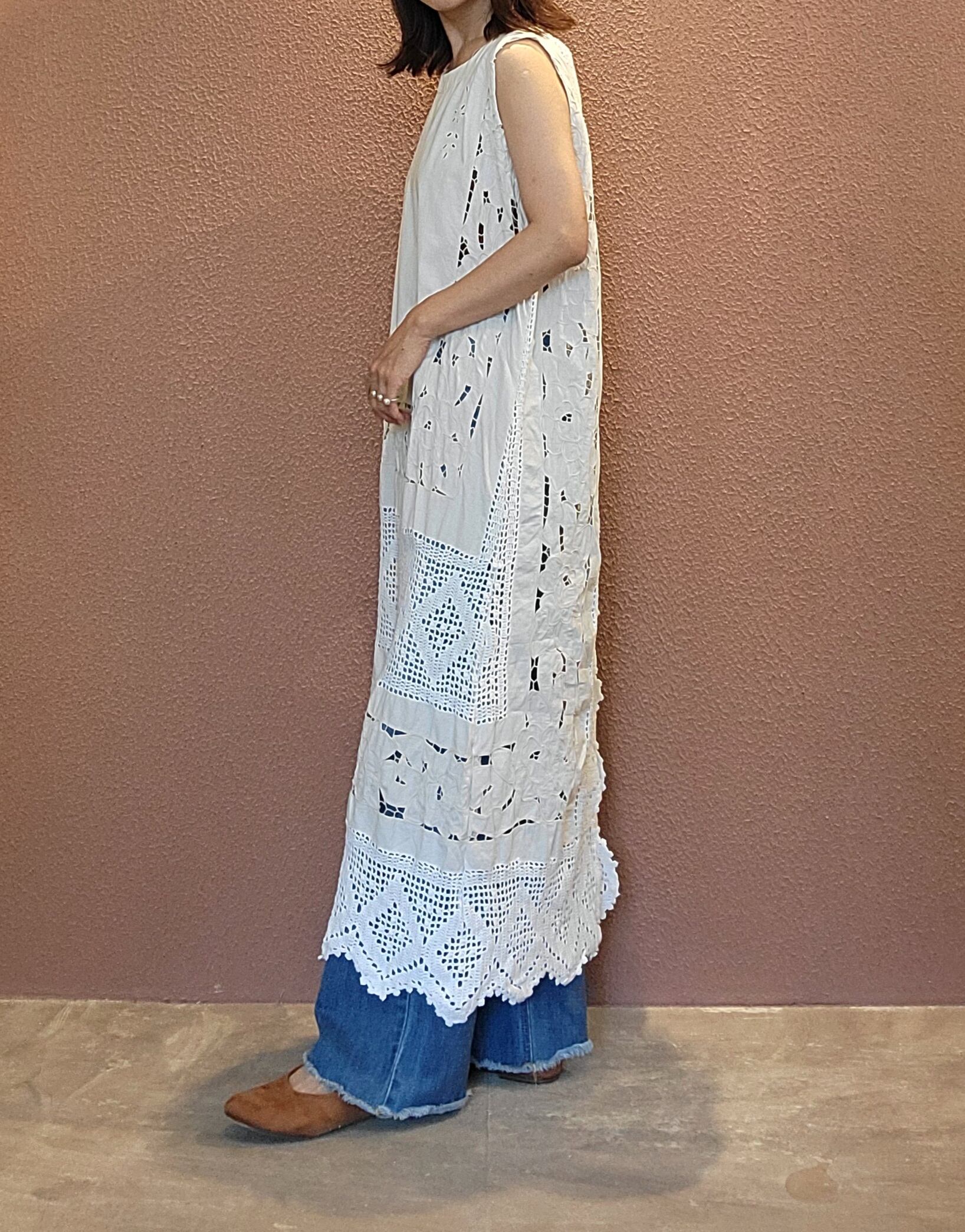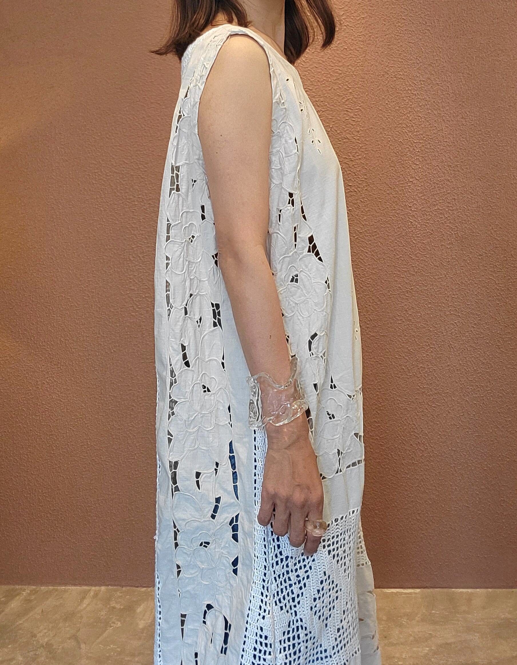 ヴィンテージレースを使用したリメイクワンピース。クロシェとカットワーク刺繍レースがドッキングした希少な生地です。素材表記はありませんがコットンのようです。ファスナーは付いていないプルオーバータイプ。総レースで涼しく着ていただけます。レイヤードスタイルでお楽しみください。