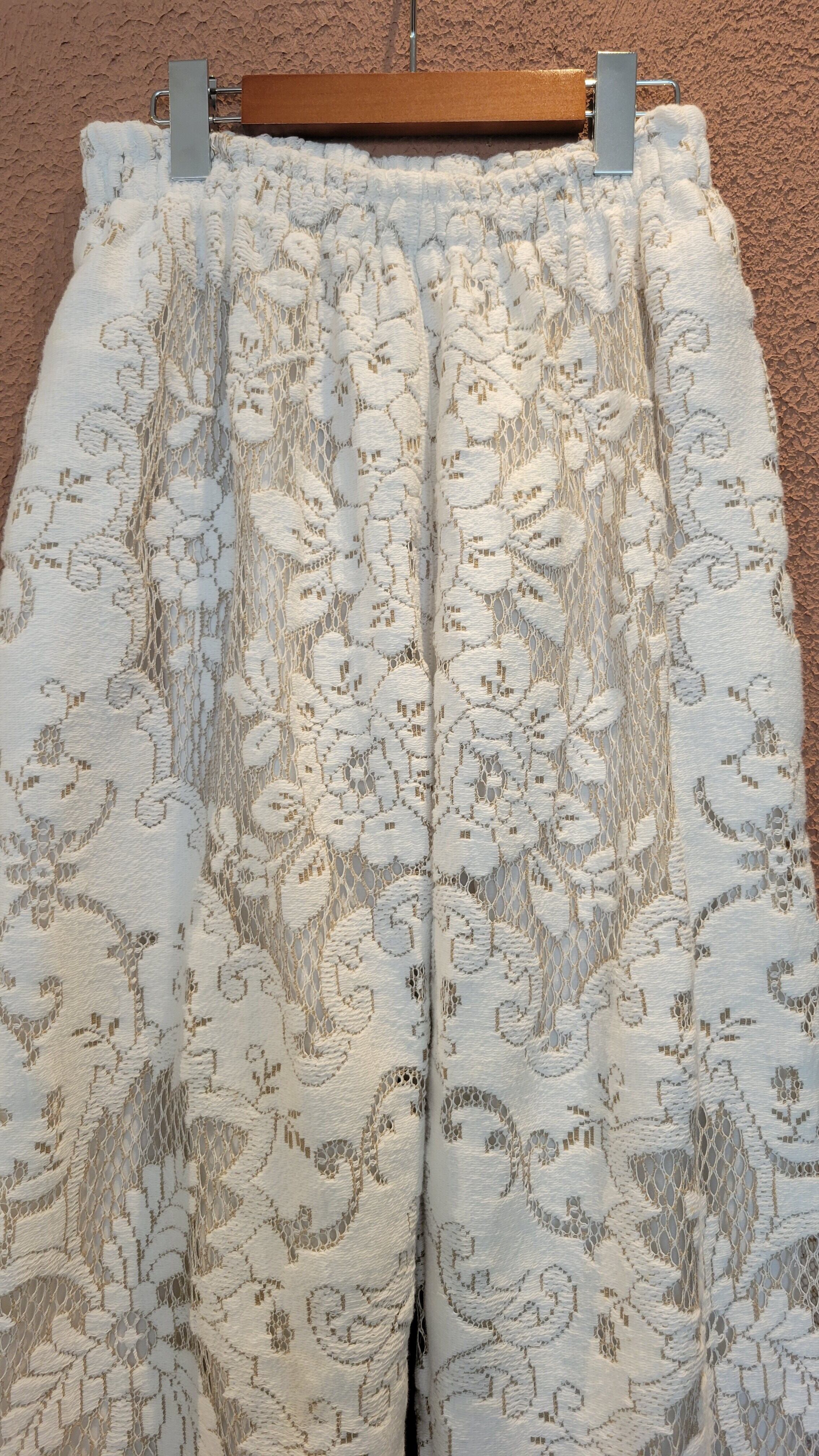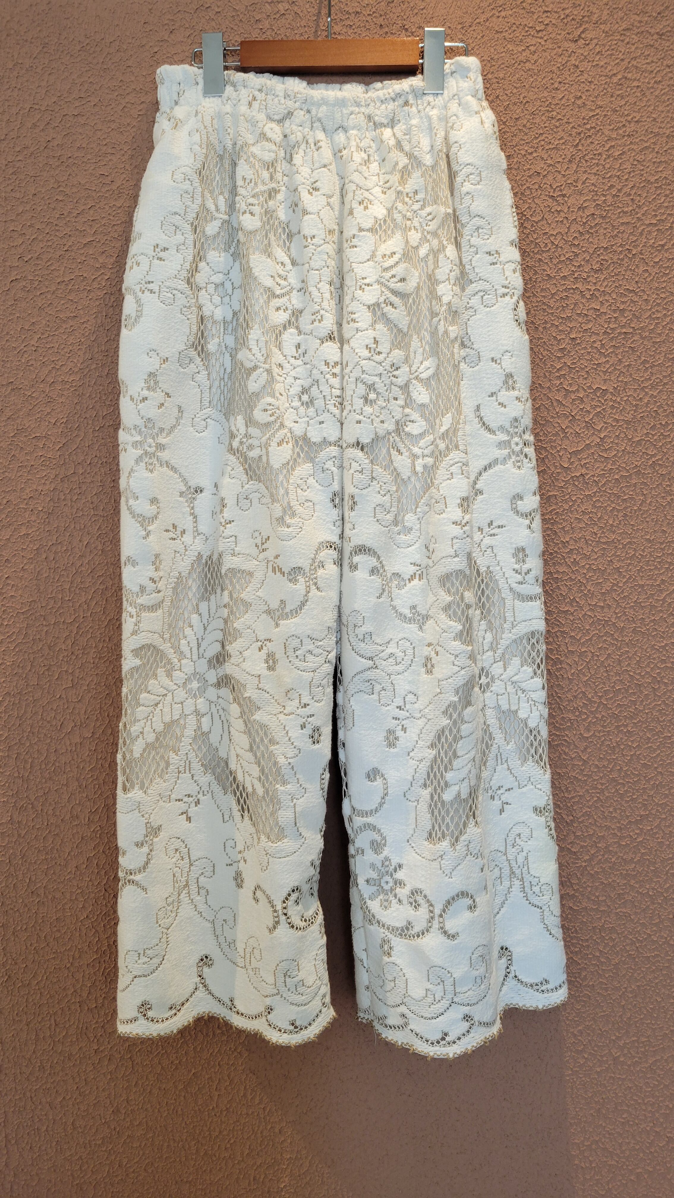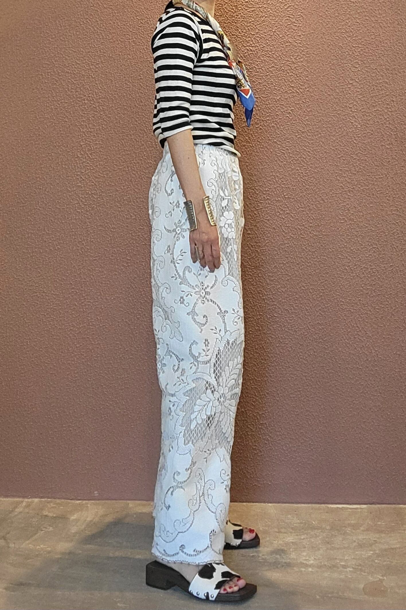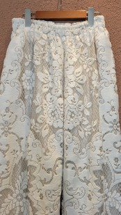 ヴィンテージレースを使用したリメイクパンツ。素材表記はありませんがコットンのようです。ウエストゴム、ポケット無し、足首上あたりまでの裏地付き。程よくワイドなすとんと落ちるすっきりシルエット。Tシャツに合わせてカジュアルに、ジャケットを合わせてキレイめに、幅広くスタイリングできる1本です。*後ろ左ヒップあたりにシミが2ヵ所あります。画像でご確認ください。