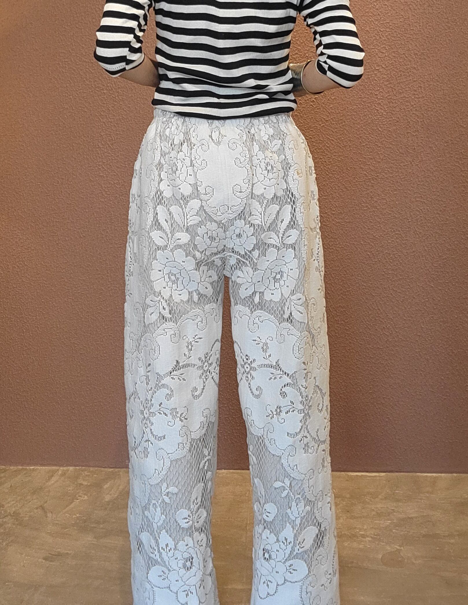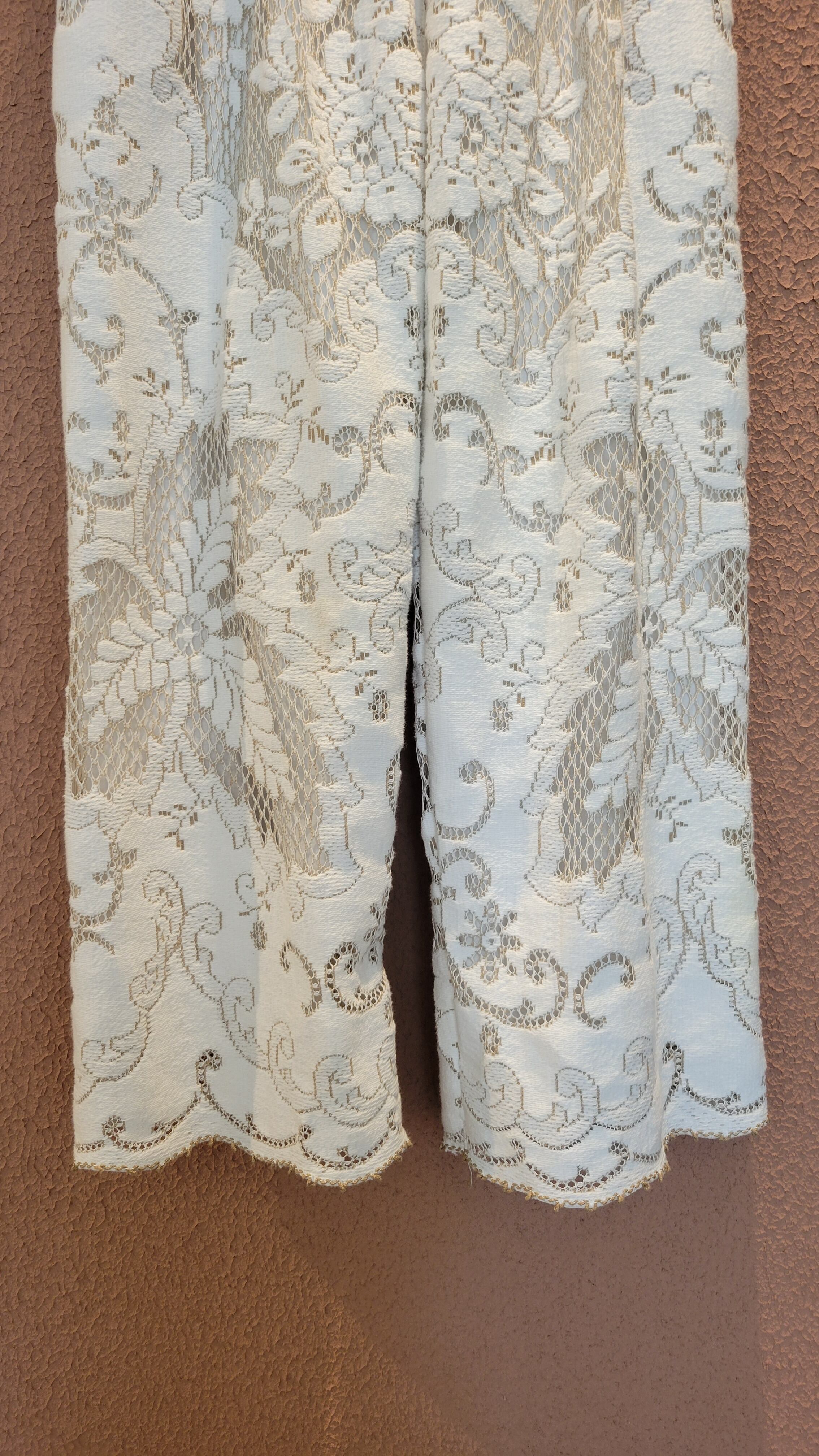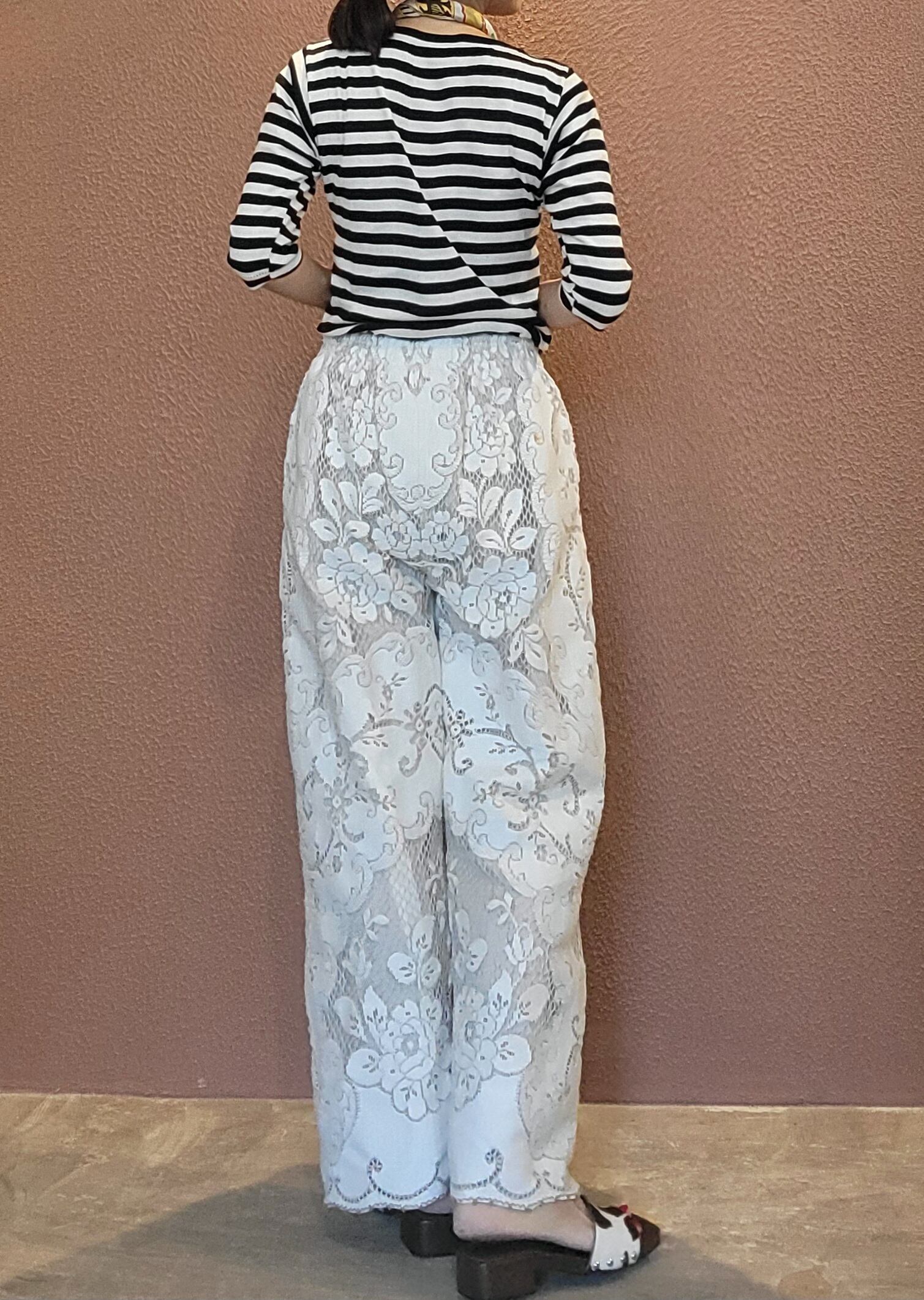 ヴィンテージレースを使用したリメイクパンツ。素材表記はありませんがコットンのようです。ウエストゴム、ポケット無し、足首上あたりまでの裏地付き。程よくワイドなすとんと落ちるすっきりシルエット。Tシャツに合わせてカジュアルに、ジャケットを合わせてキレイめに、幅広くスタイリングできる1本です。*後ろ左ヒップあたりにシミが2ヵ所あります。画像でご確認ください。