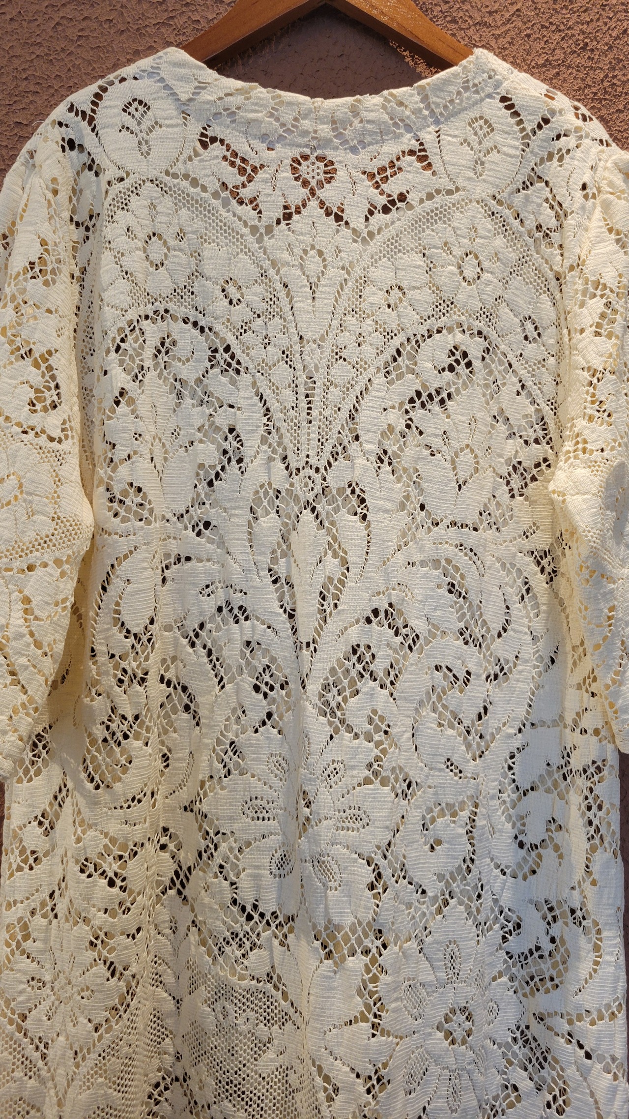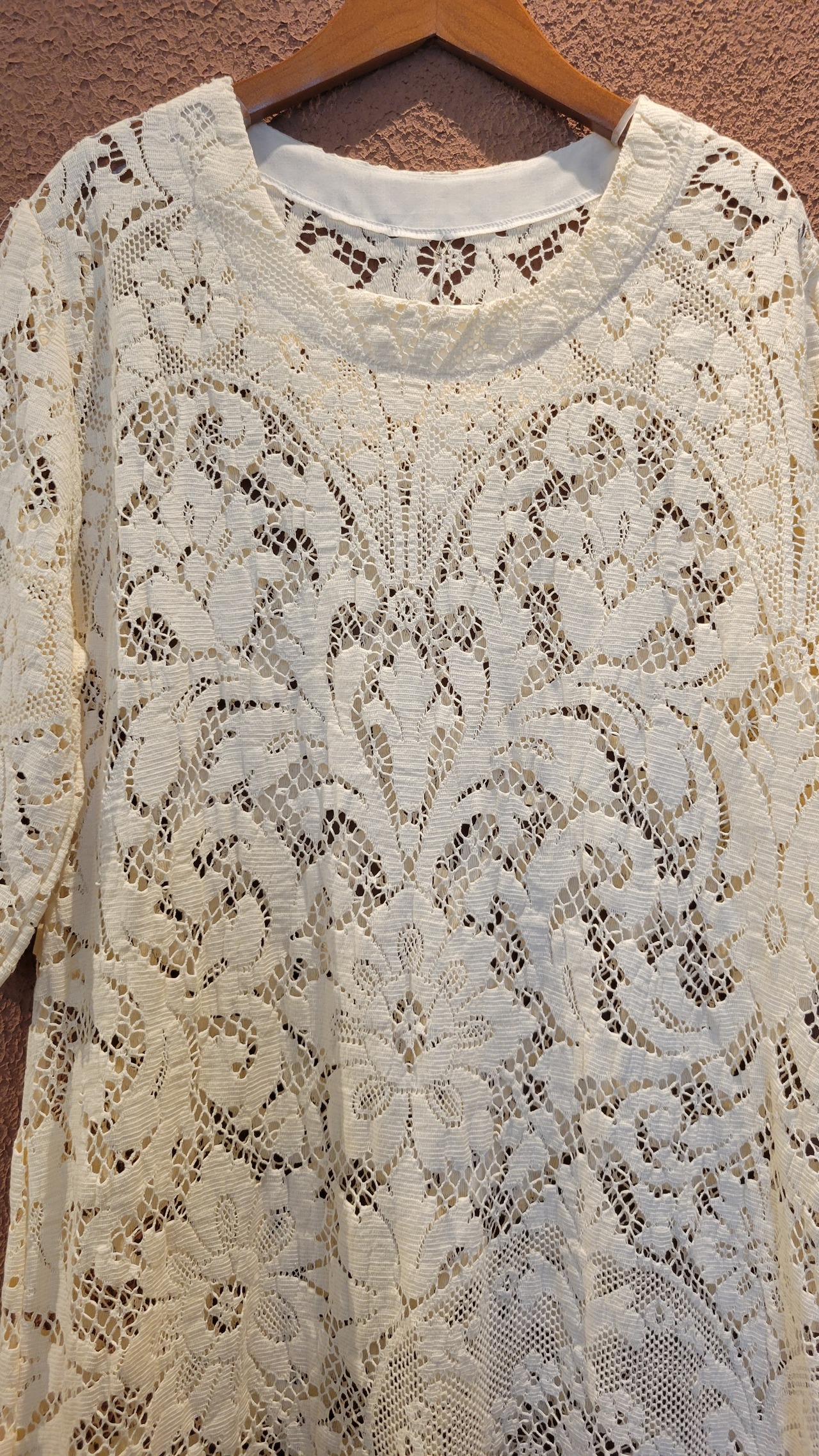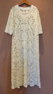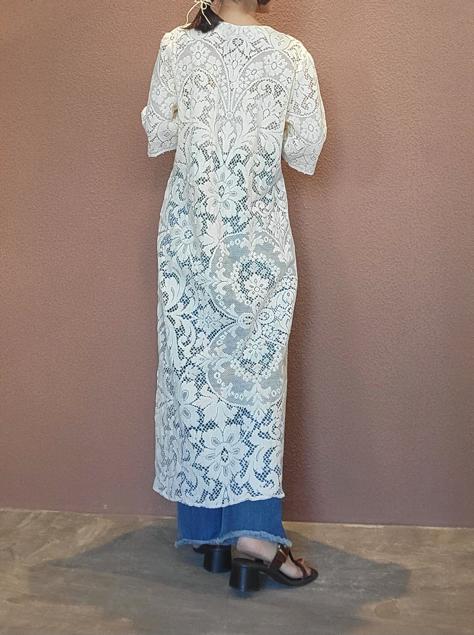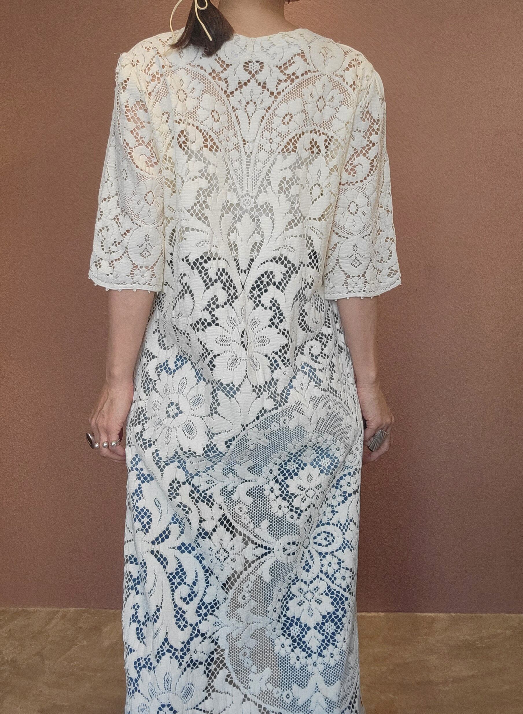 ヴィンテージのレース生地を使用したリメイクドレス。素材表記はありませんがコットンのようです。比較的しっかりしたレース生地になります。ファスナーやボタン等は付いておらず、頭から被って着用するプルオーバータイプ。デニムに合わせてカジュアルにも、インナーにスリップドレスを合わせてきれいめにもスタイリングできる1着です。