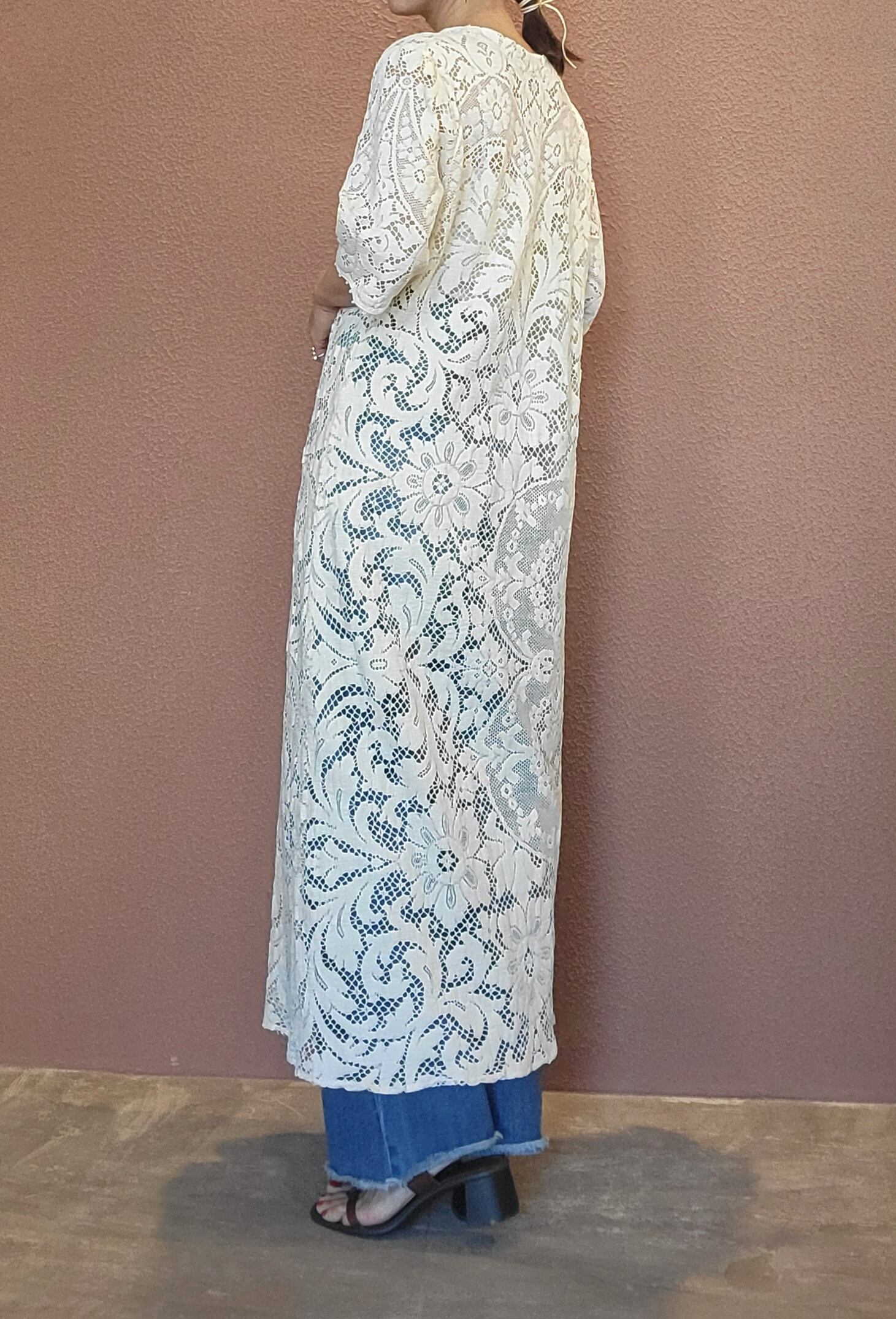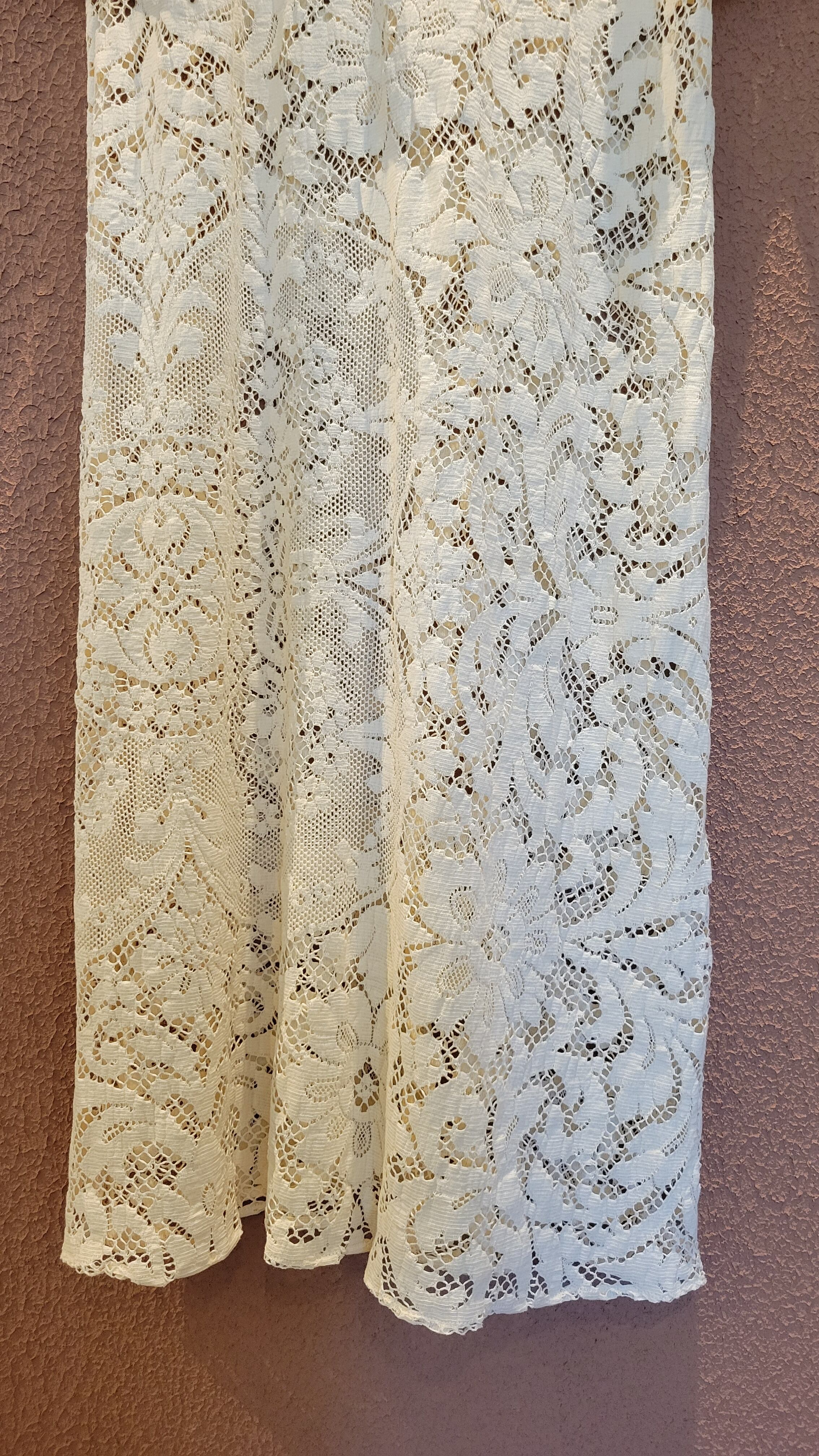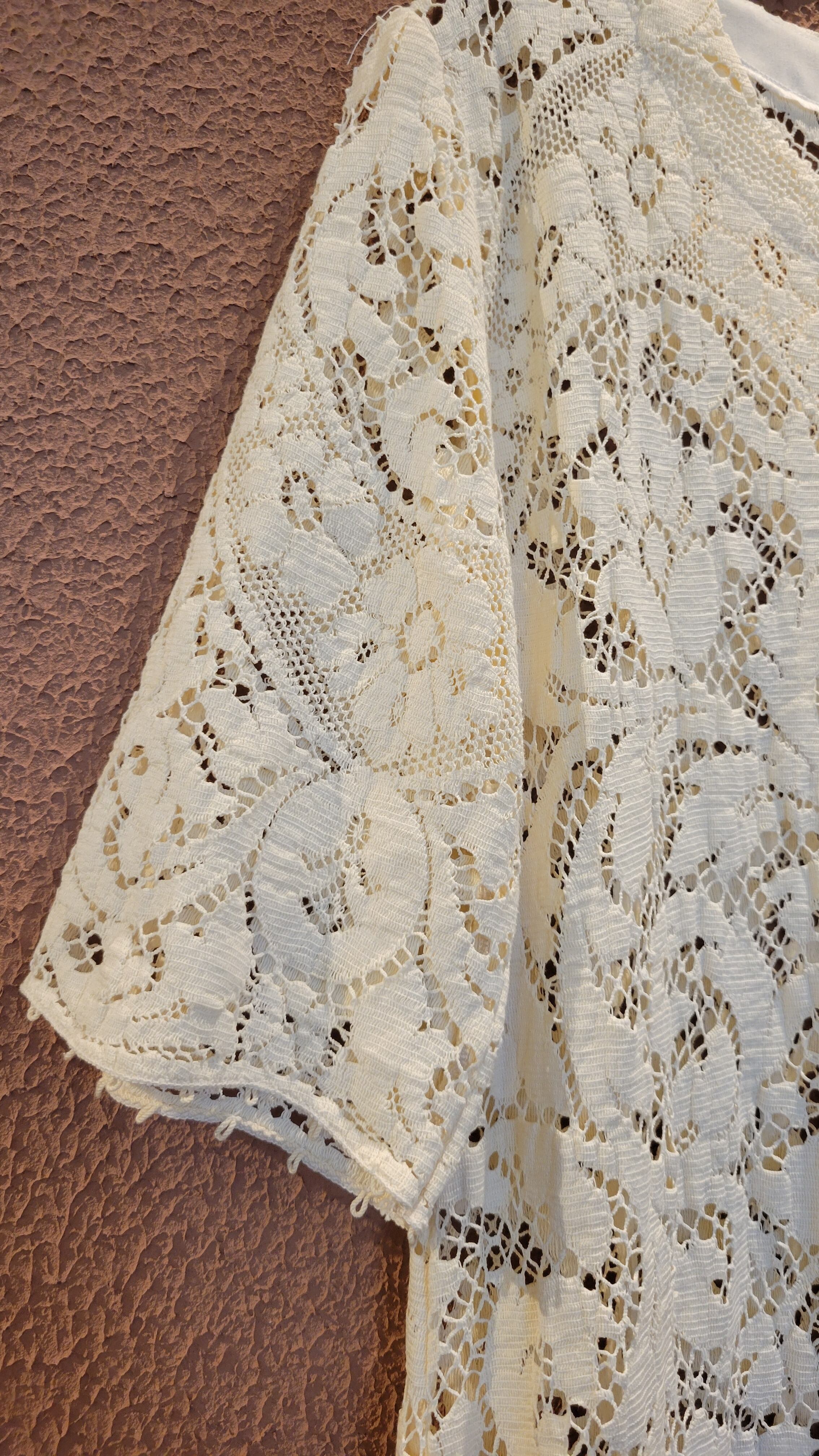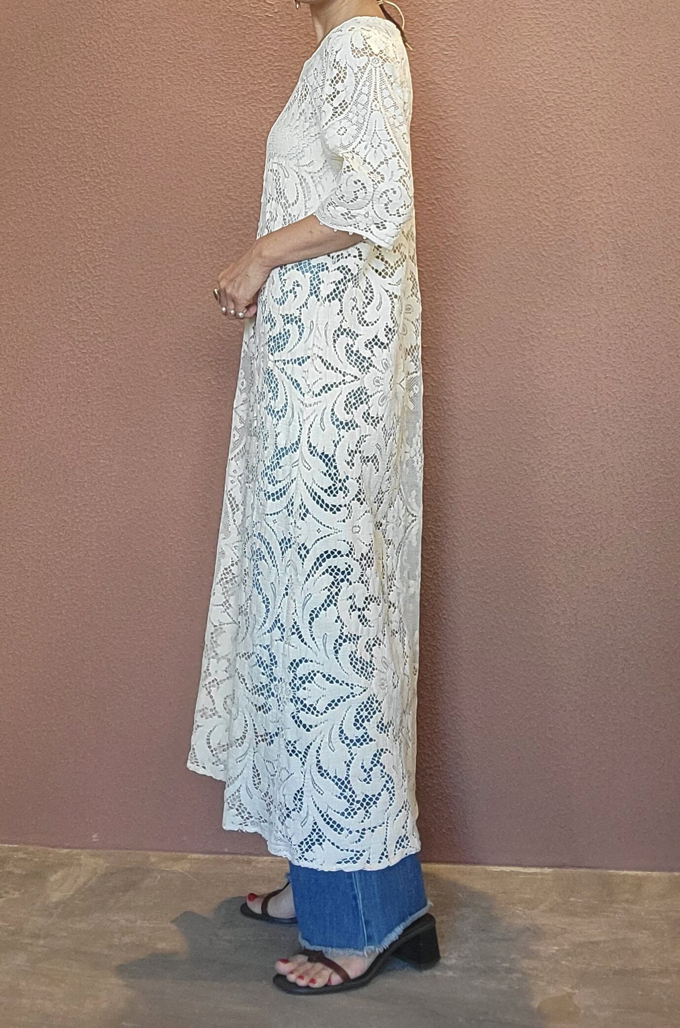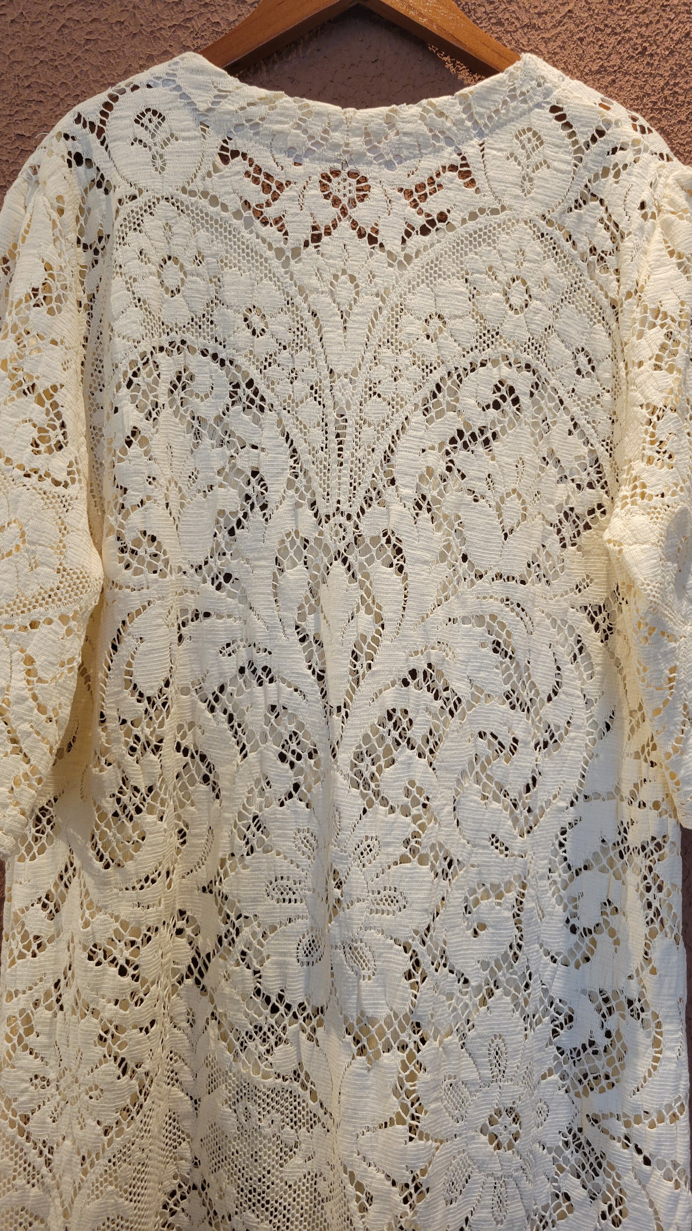 ヴィンテージのレース生地を使用したリメイクドレス。素材表記はありませんがコットンのようです。比較的しっかりしたレース生地になります。ファスナーやボタン等は付いておらず、頭から被って着用するプルオーバータイプ。デニムに合わせてカジュアルにも、インナーにスリップドレスを合わせてきれいめにもスタイリングできる1着です。