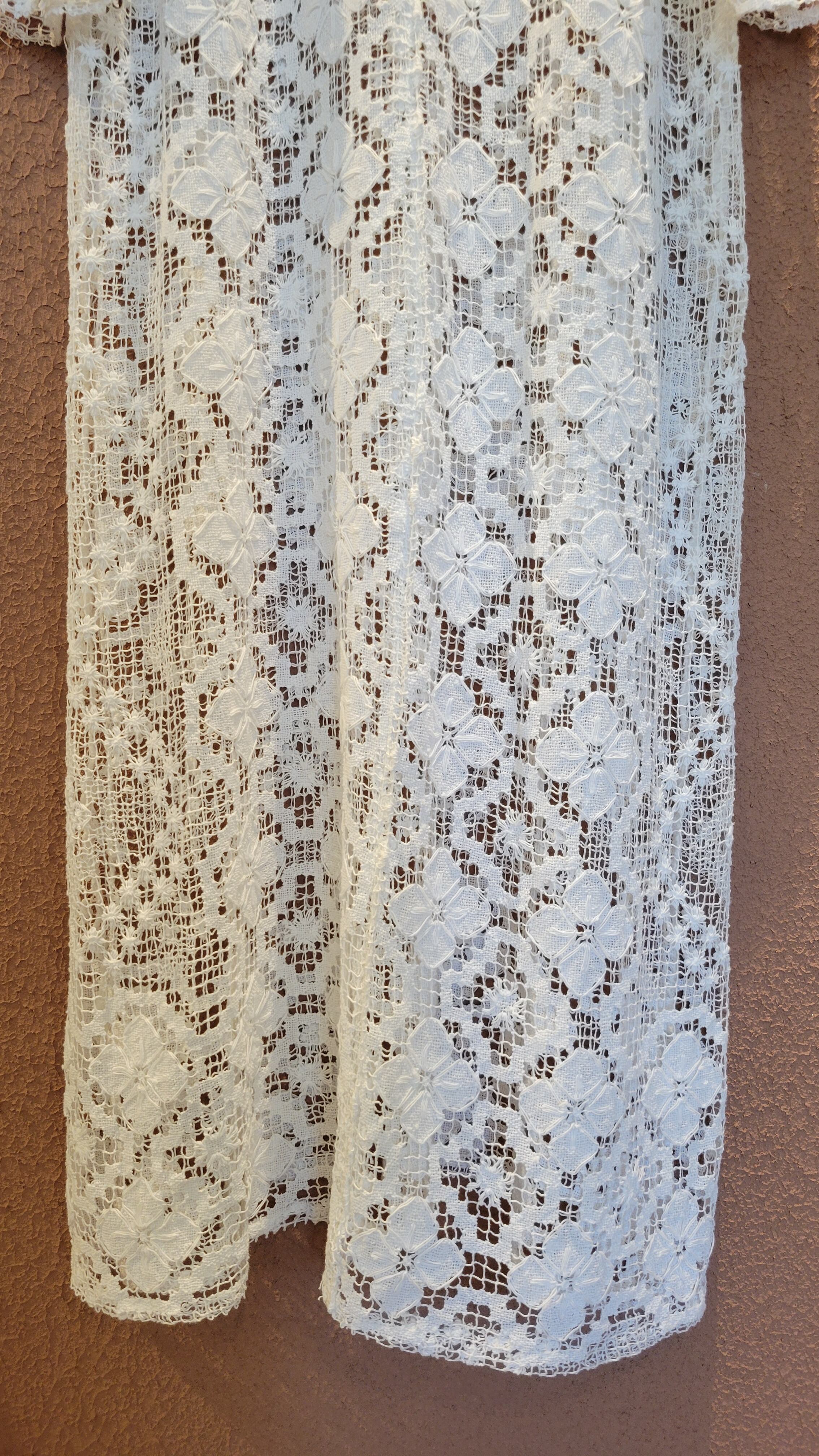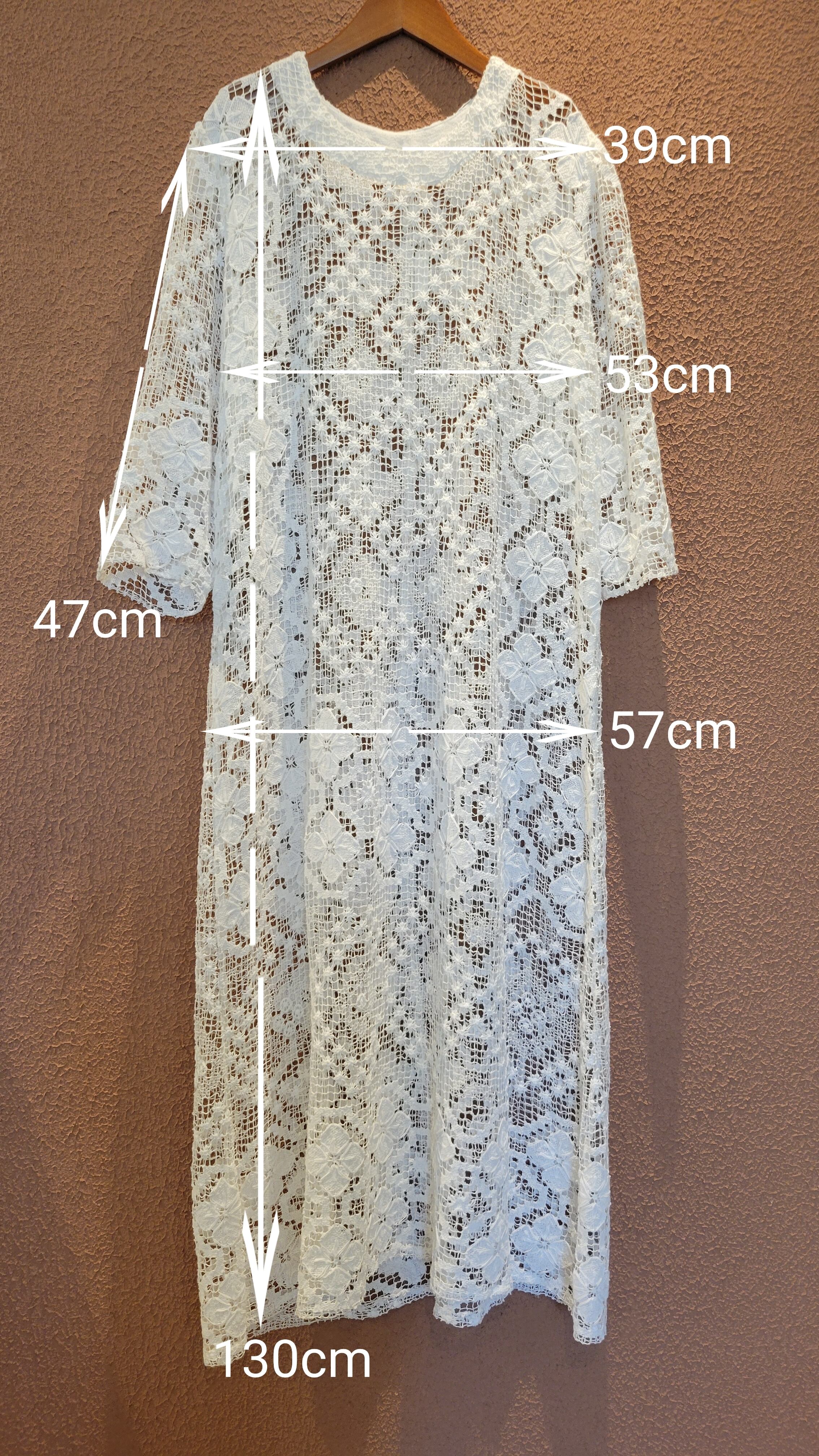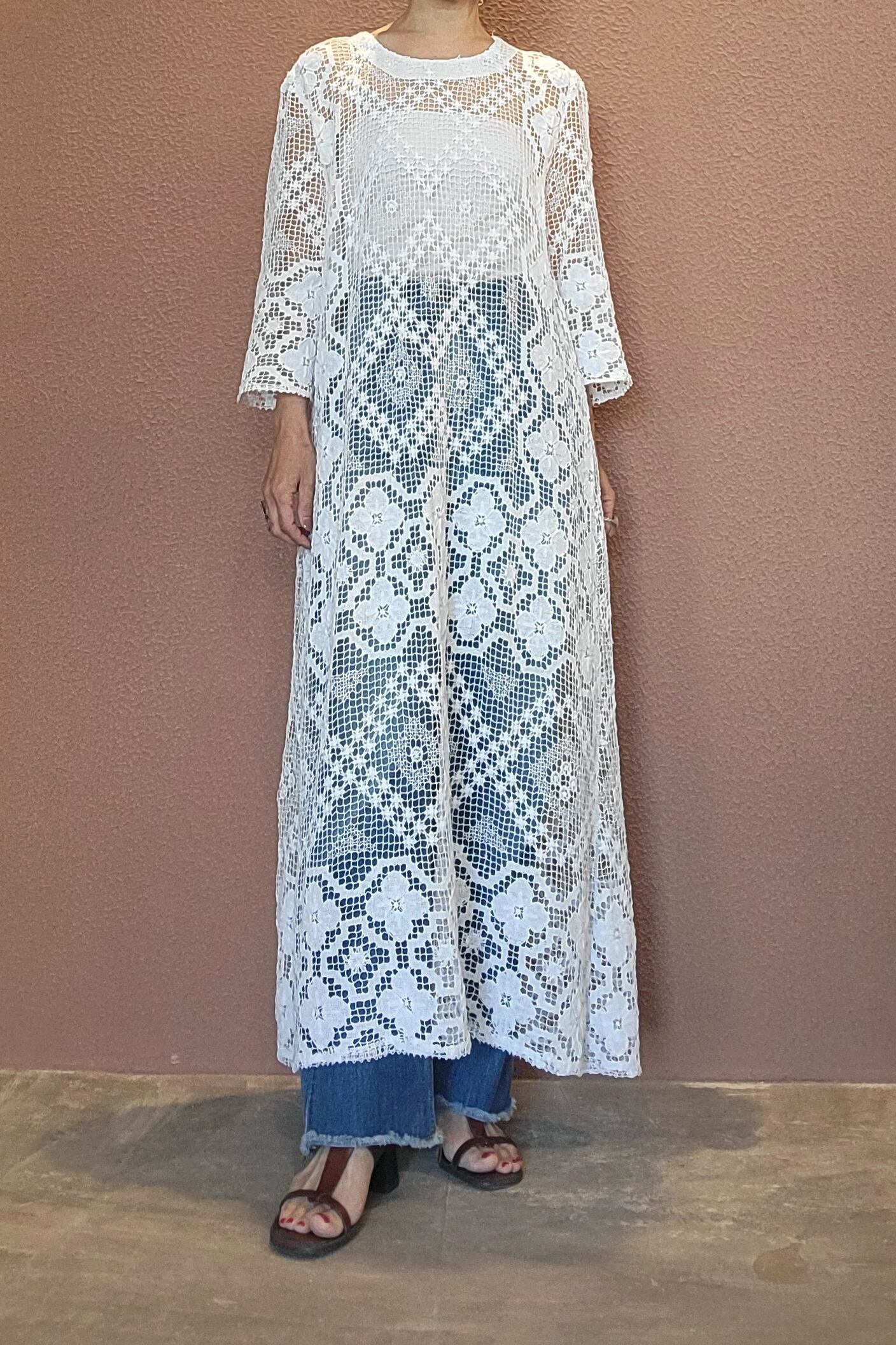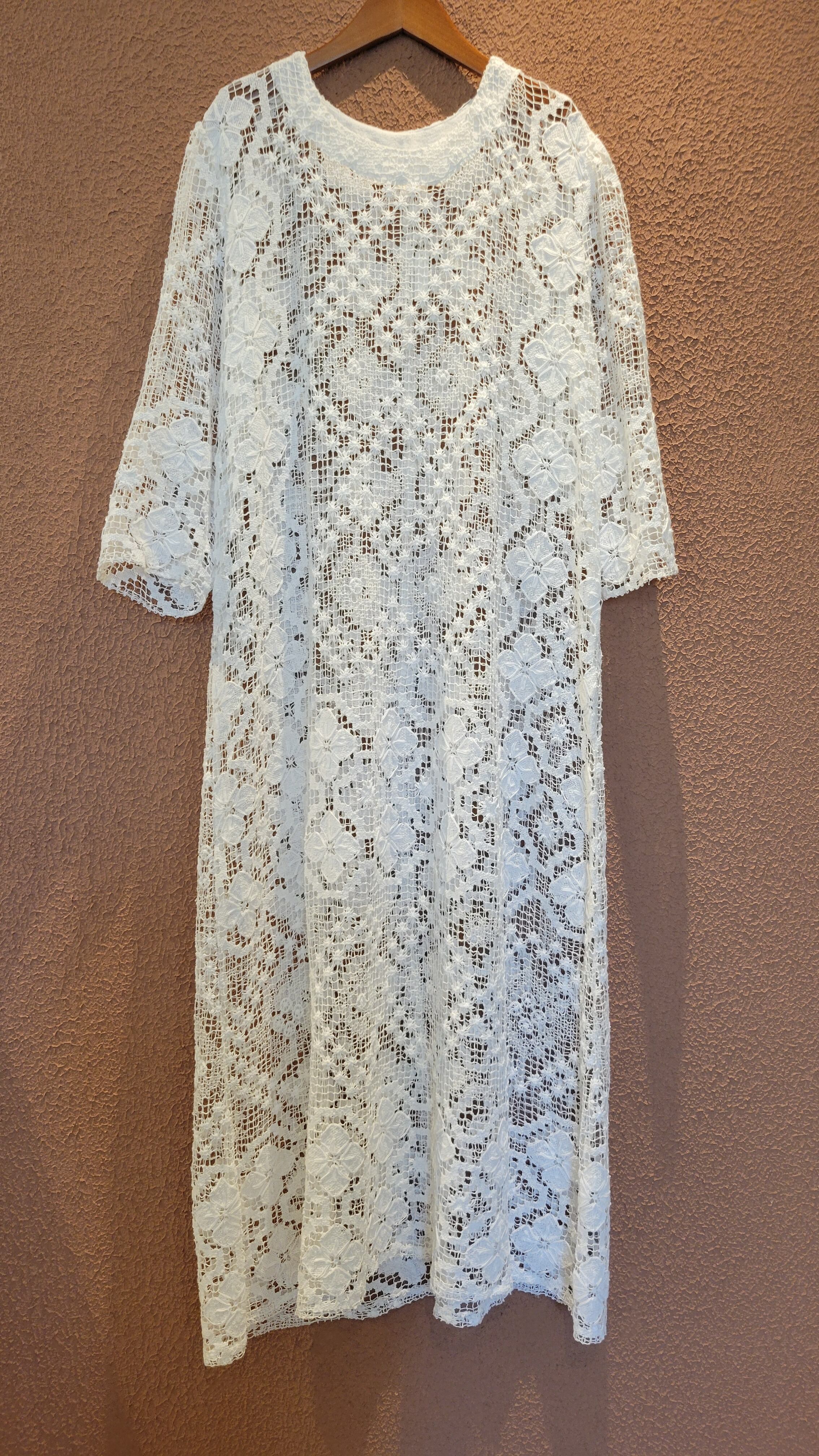 ヴィンテージのレース生地を使用したリメイクドレス。素材表記はありませんがコットンのようです。薄手で比較的透け感の強いレース生地になります。ファスナーやボタン等は付いておらず、頭から被って着用するプルオーバータイプ。デニムに合わせてカジュアルにも、インナーにスリップドレスを合わせてきれいめにもスタイリングできる1着です。