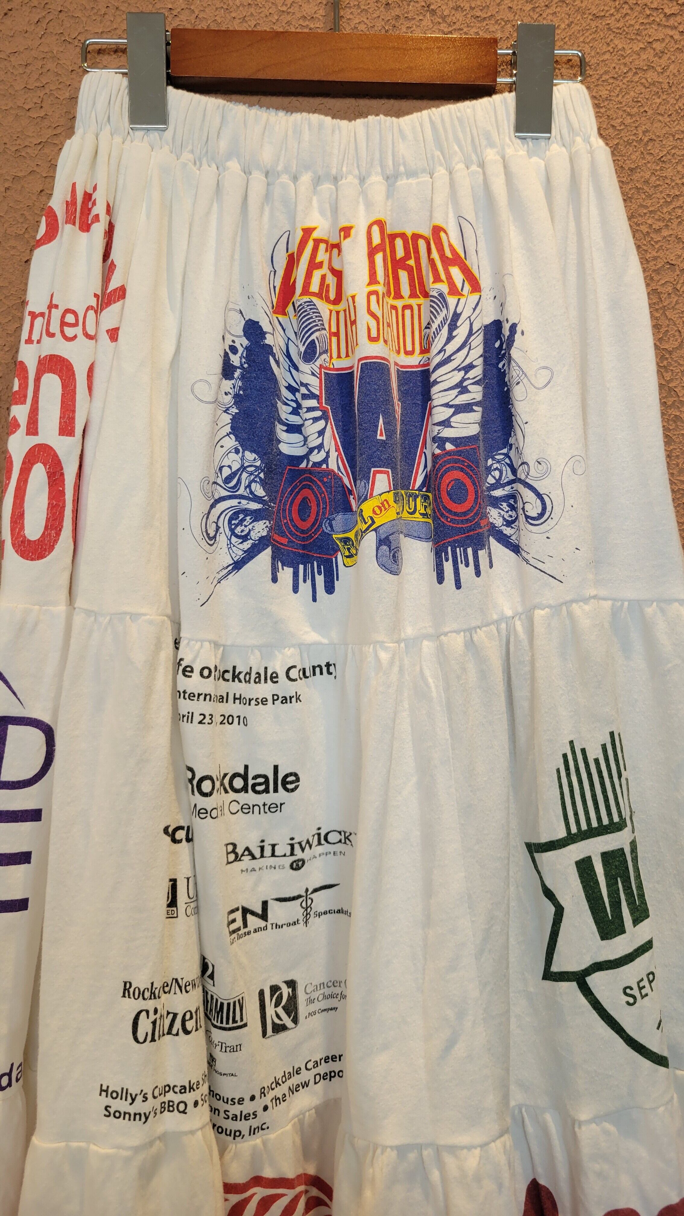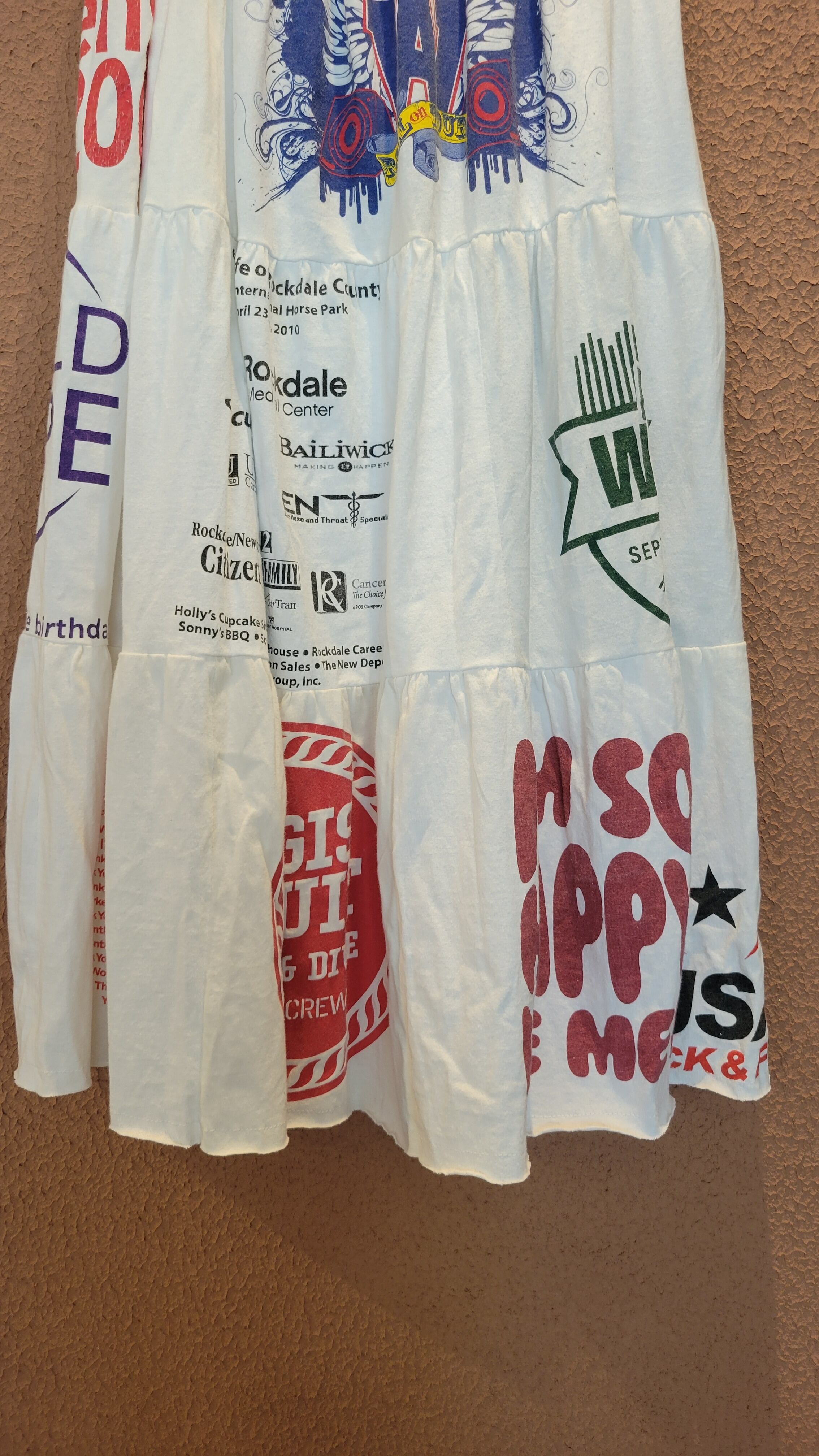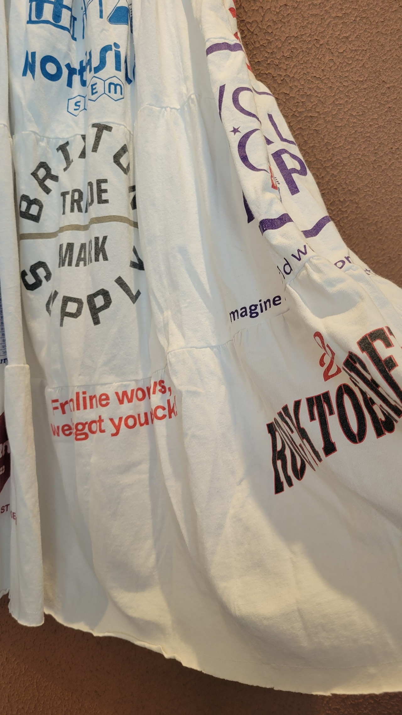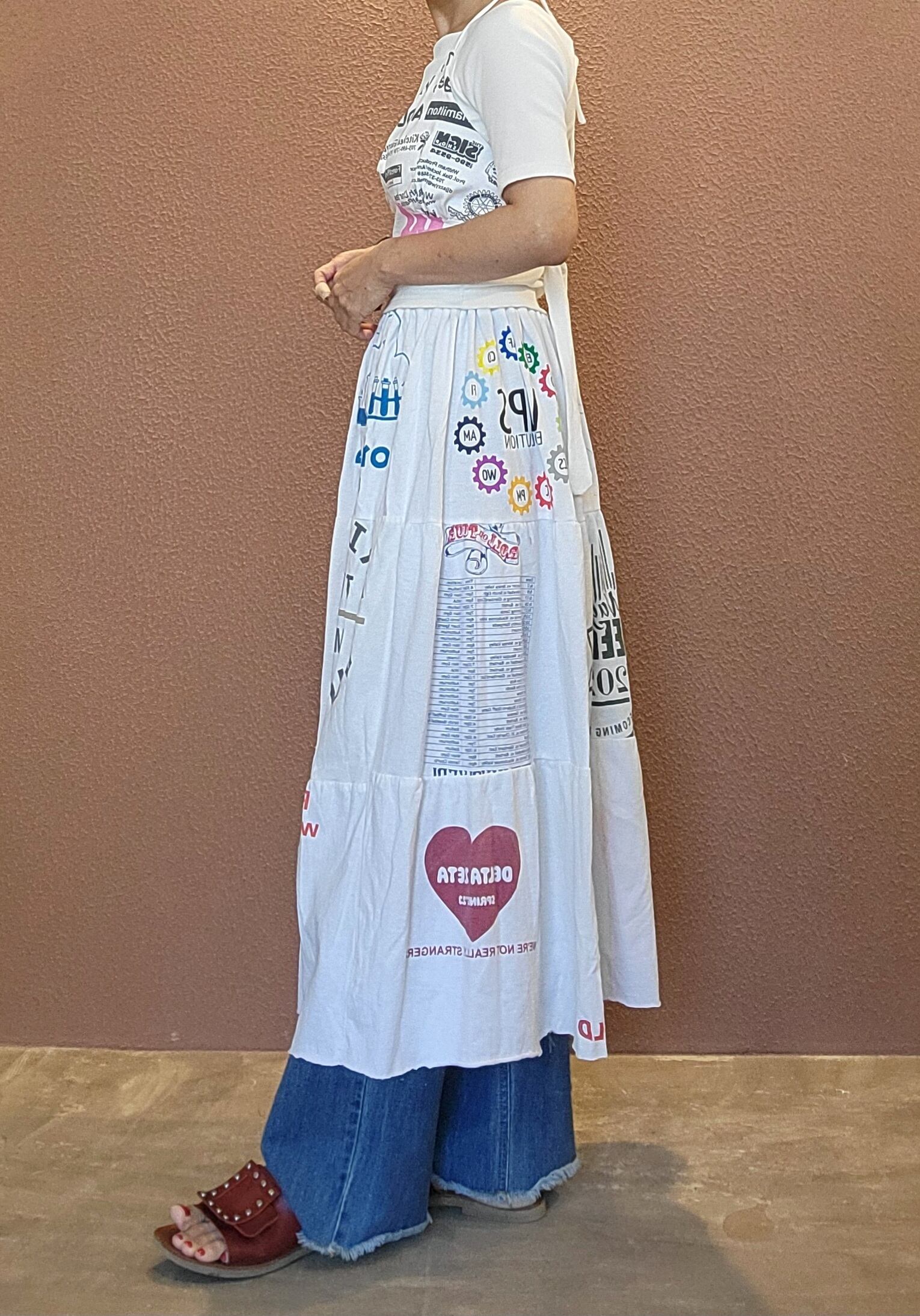 白地のusedプリントTシャツを何枚も裁断し繋ぎ合わせたリメイクスカート。こちらは丈shortタイプです。ウエストゴム、裾は裁ち切り&ぐるり一周ステッチが入っています。1枚ずつプリントや配置の異なる一点ものです。柔らかいTシャツ素材で涼しく、デニムとのレイヤードもおすすめです。