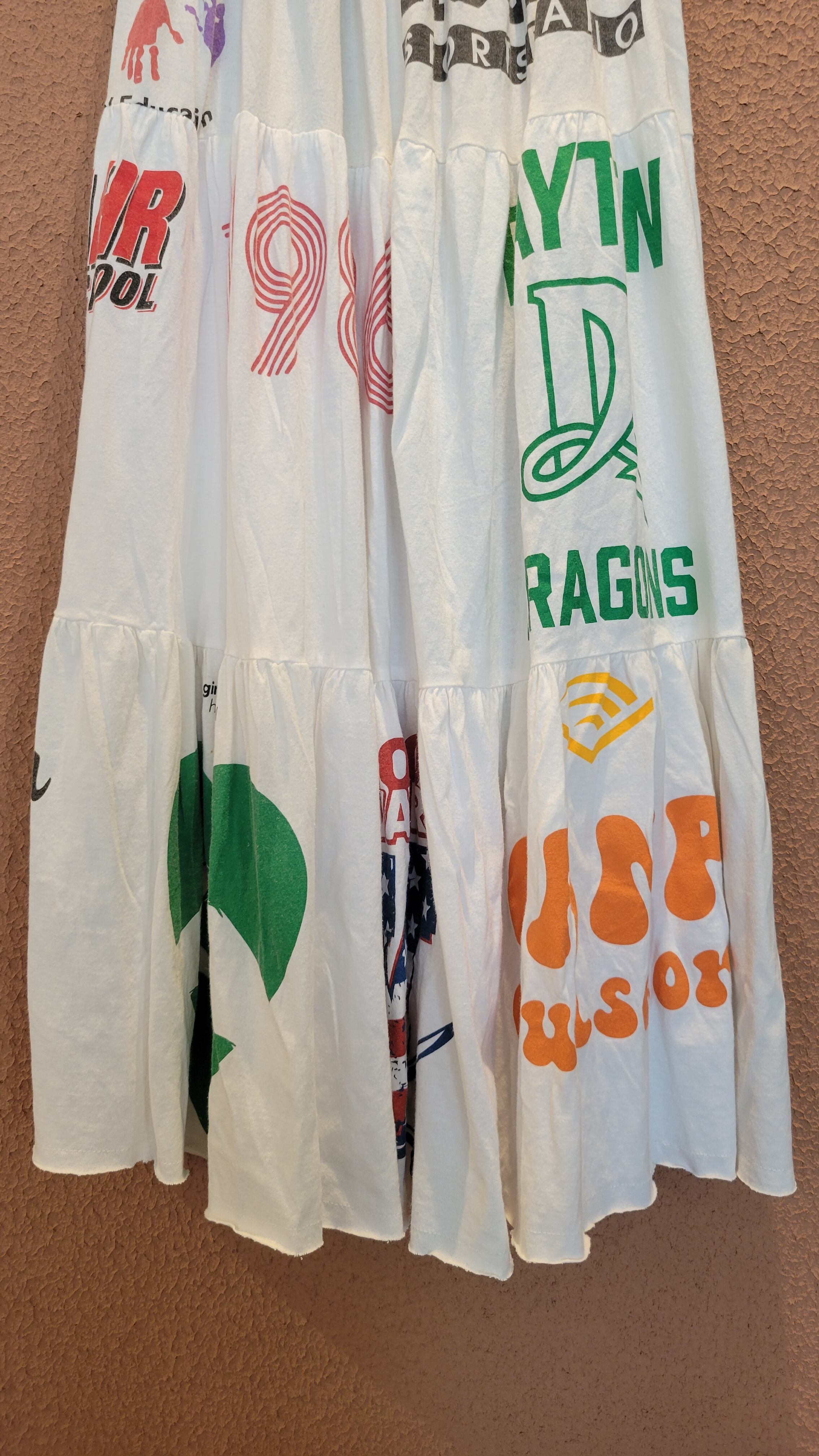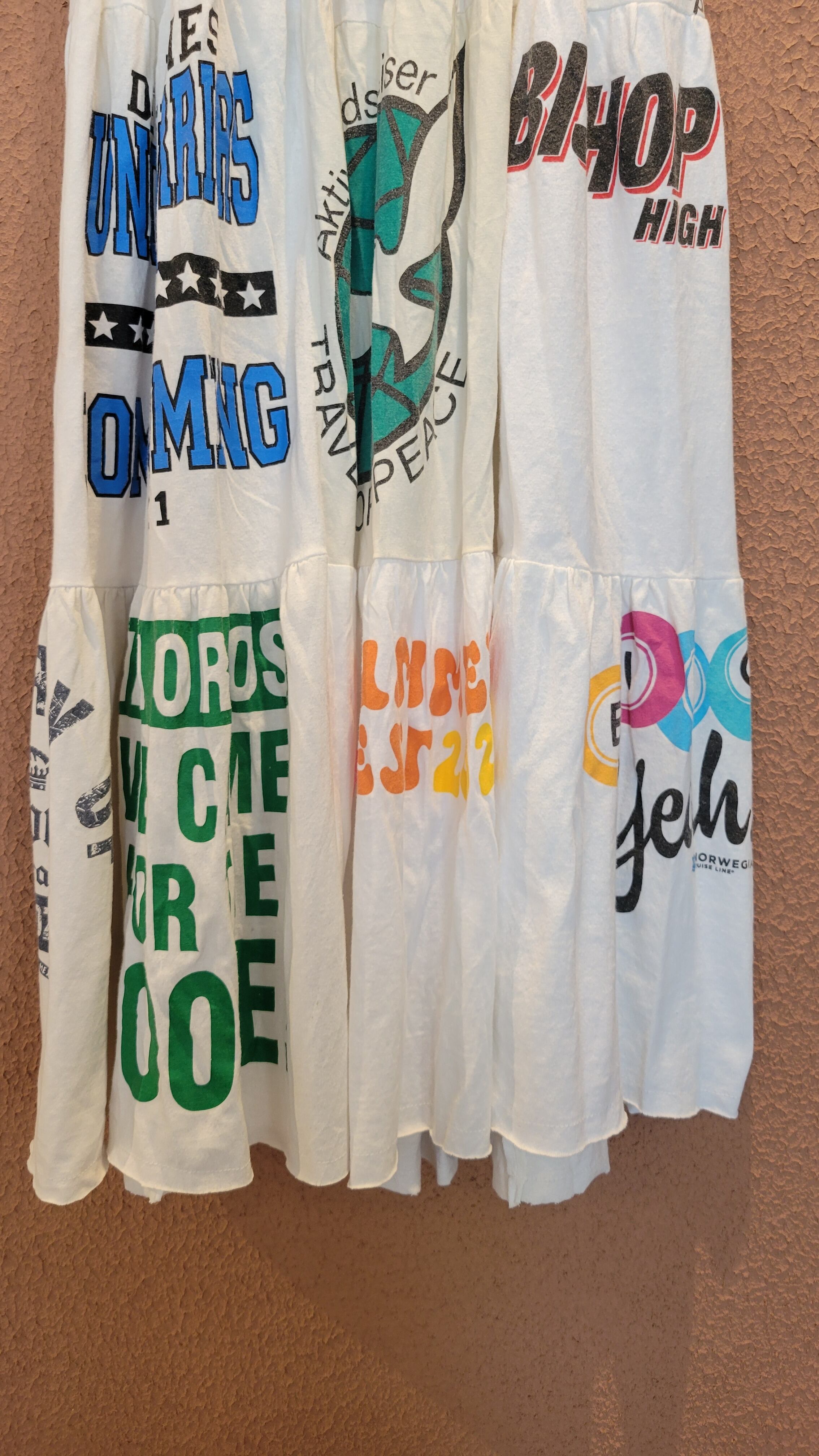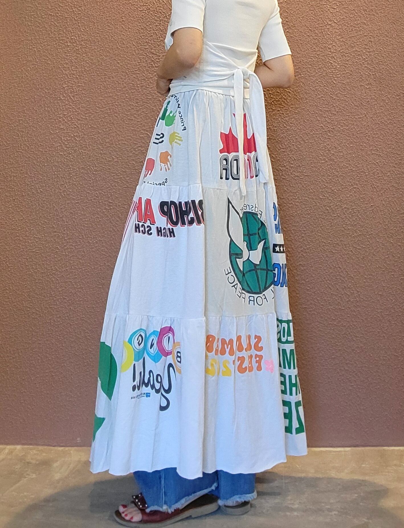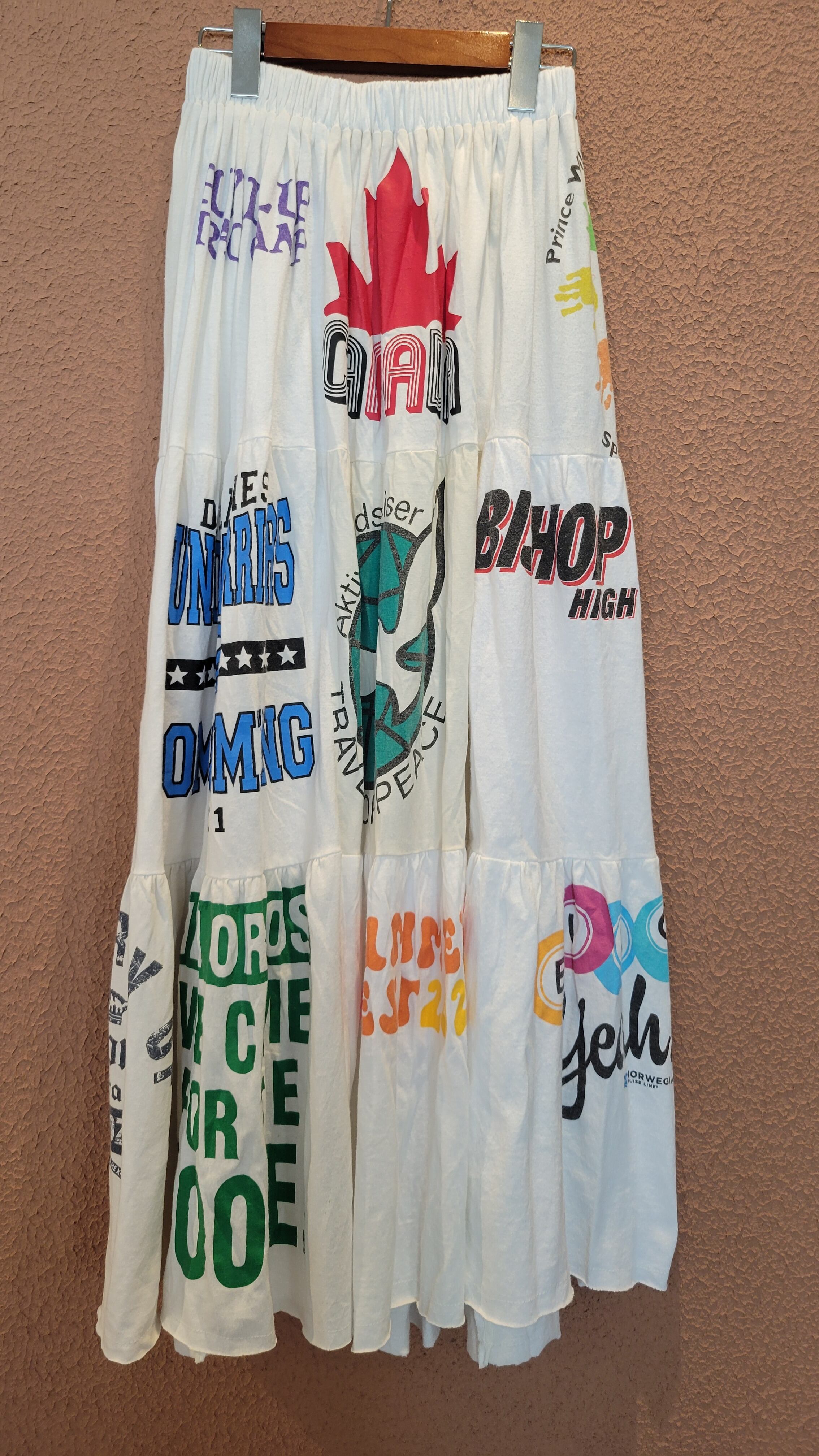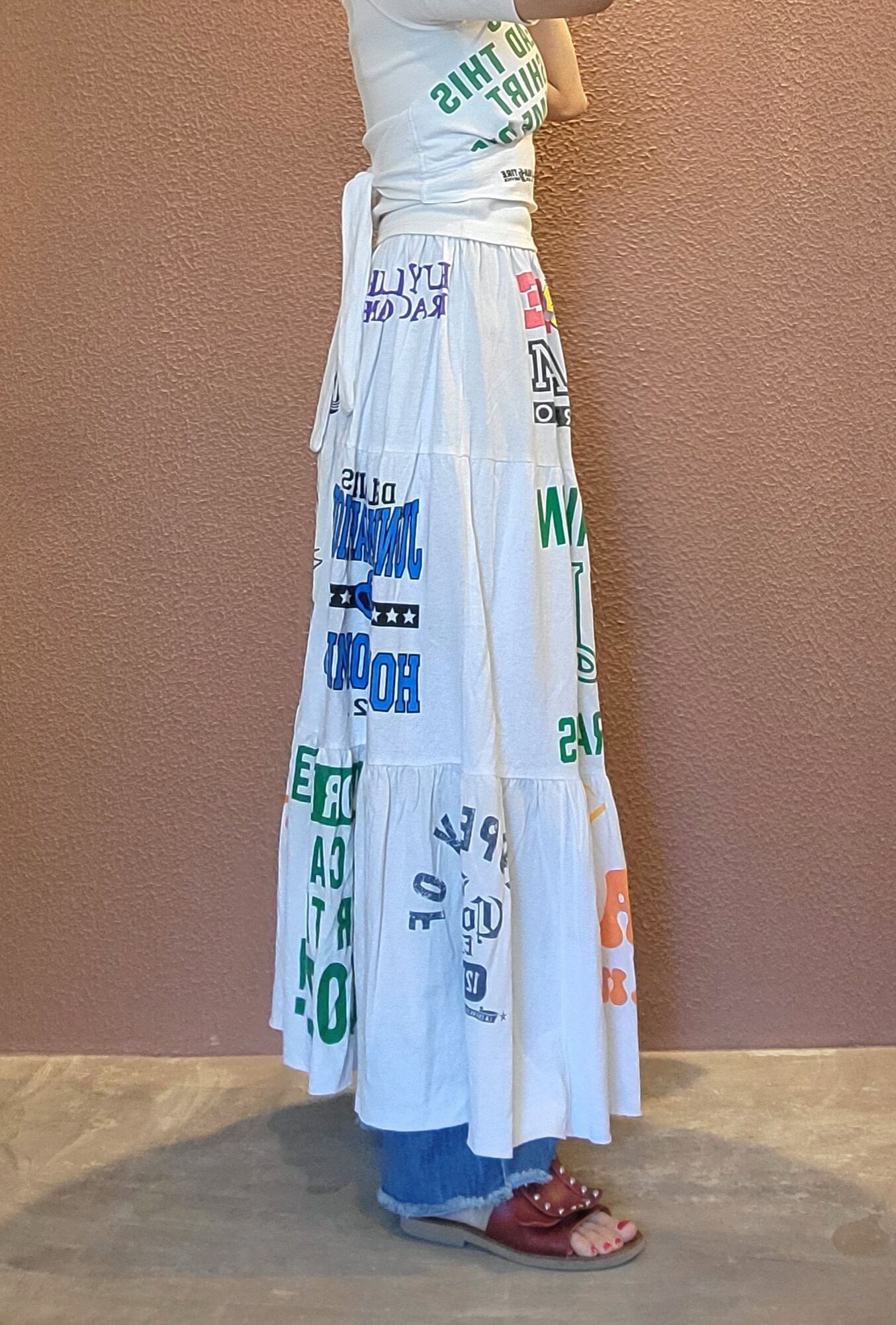 白地のusedプリントTシャツを何枚も裁断し繋ぎ合わせたリメイクスカート。こちらは丈longタイプです。ウエストゴム、裾は裁ち切り&ぐるり一周ステッチが入っています。1枚ずつプリントや配置の異なる一点ものです。柔らかいTシャツ素材で涼しく、デニムとのレイヤードもおすすめです。