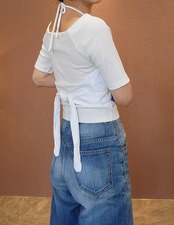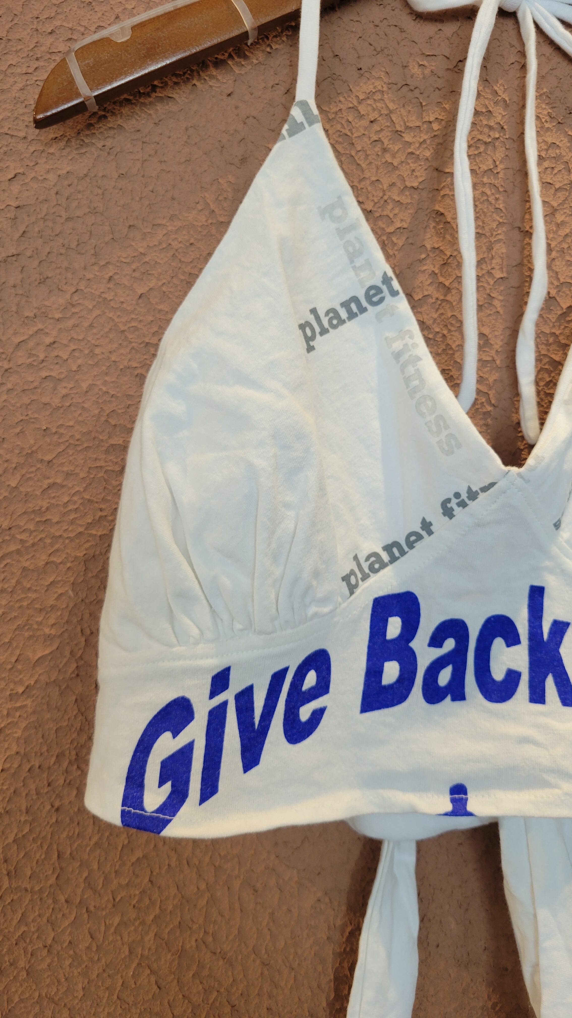 白地のusedプリントTシャツを使用したリメイクビスチェ。複数のTシャツを繋ぎ合わせた一点ものです。ホルターネック&バックリボン仕様です。1枚での着用はもちろん、Tシャツやカットソー等トップスにレイヤードもおすすめです。