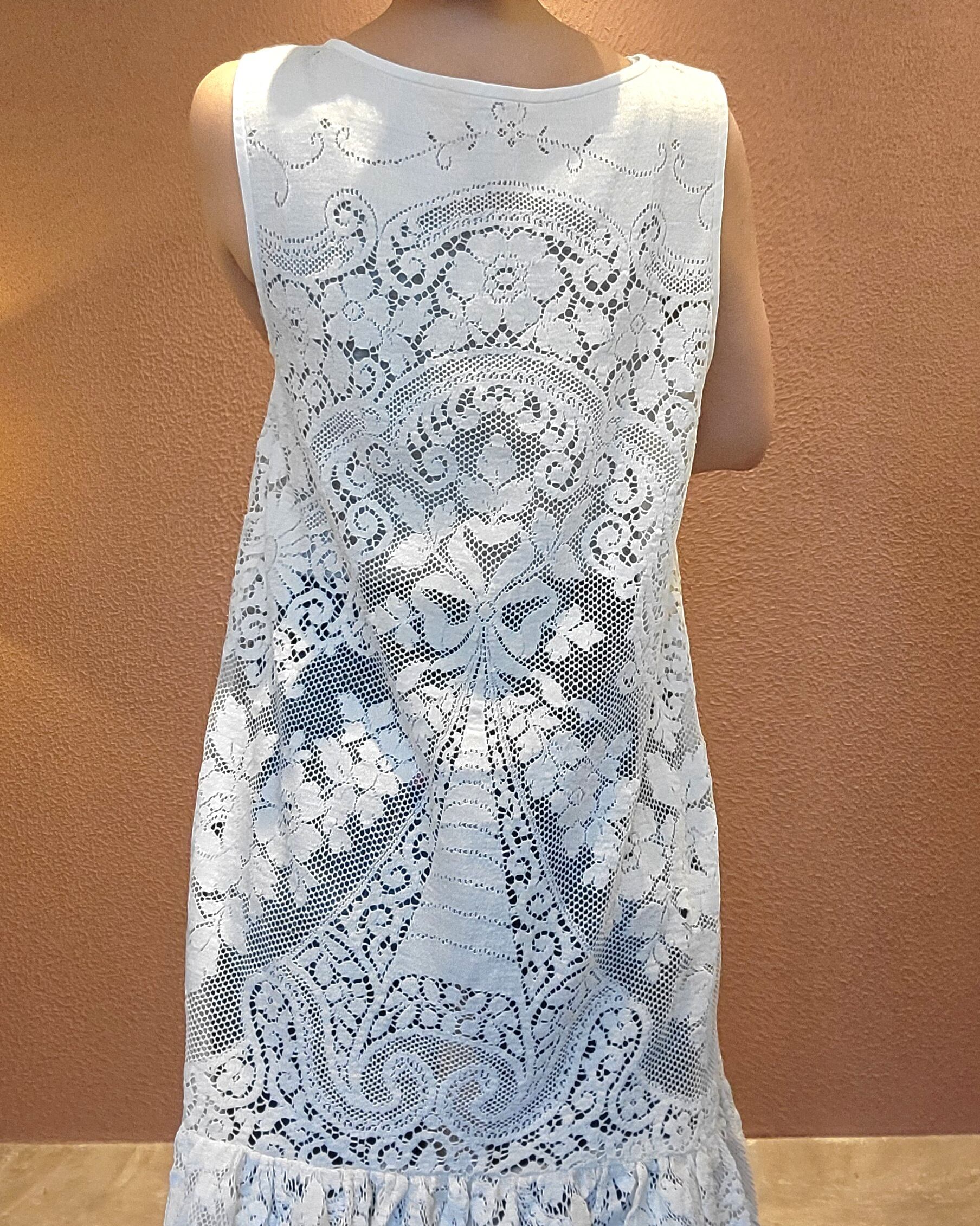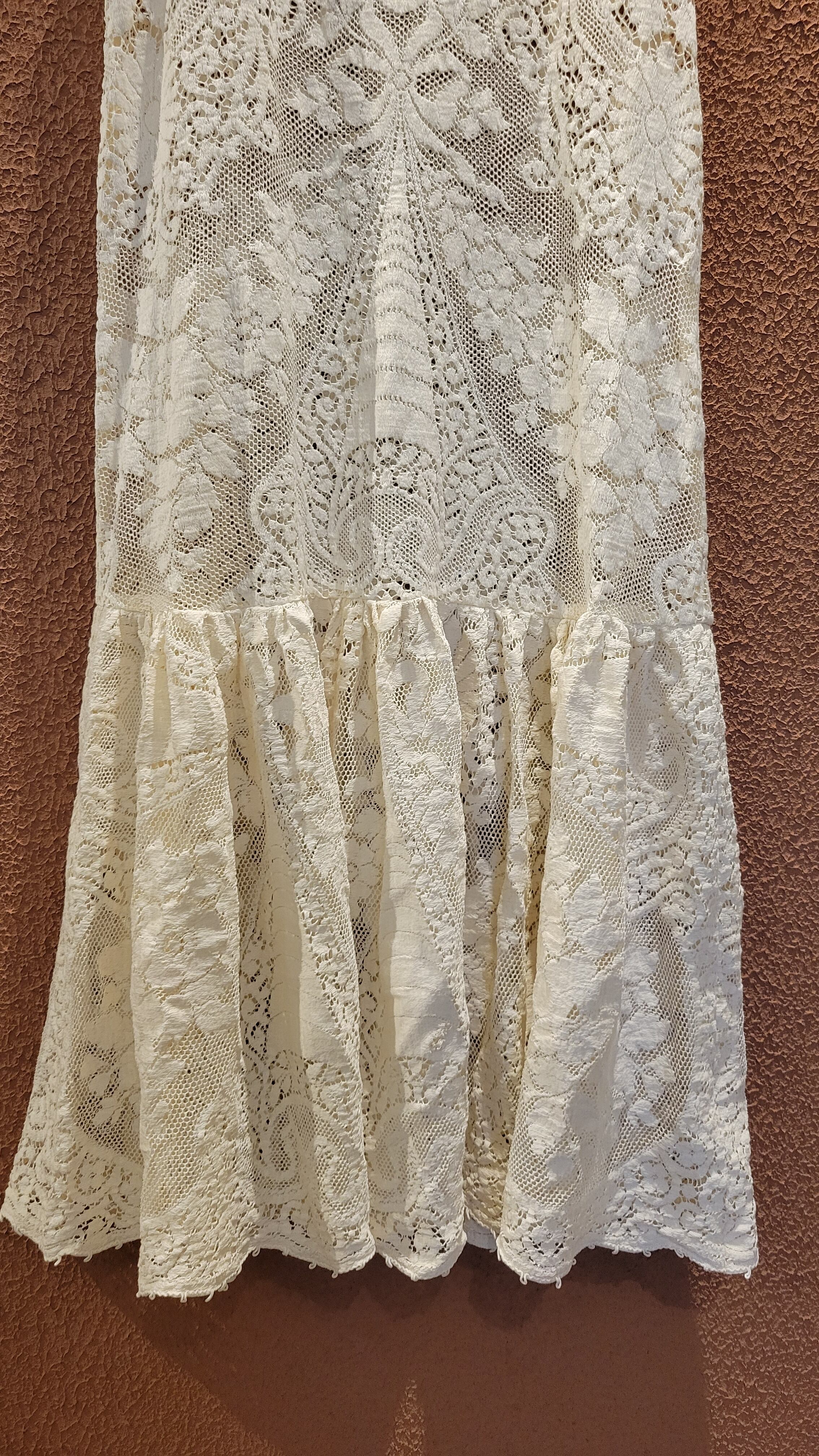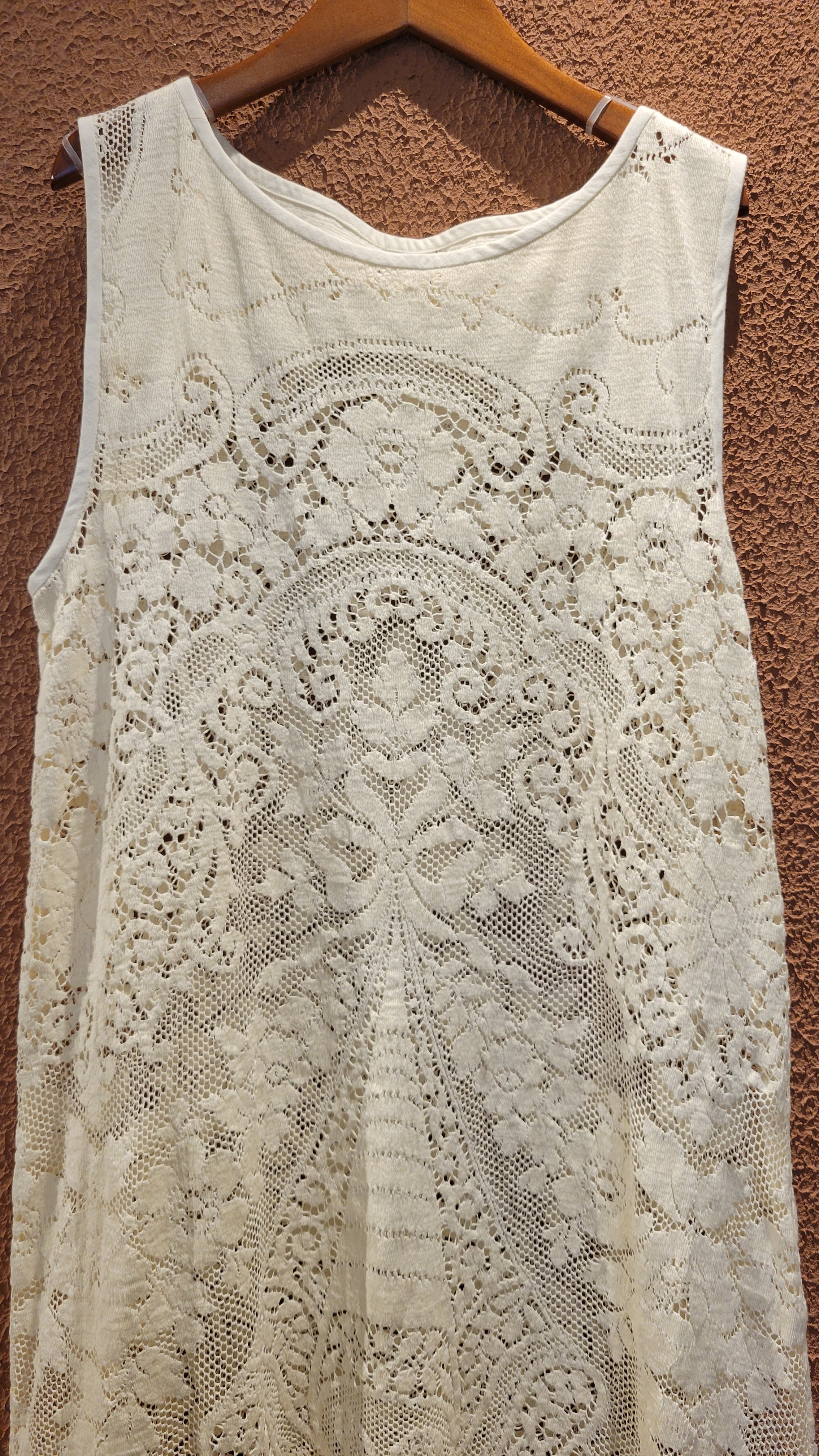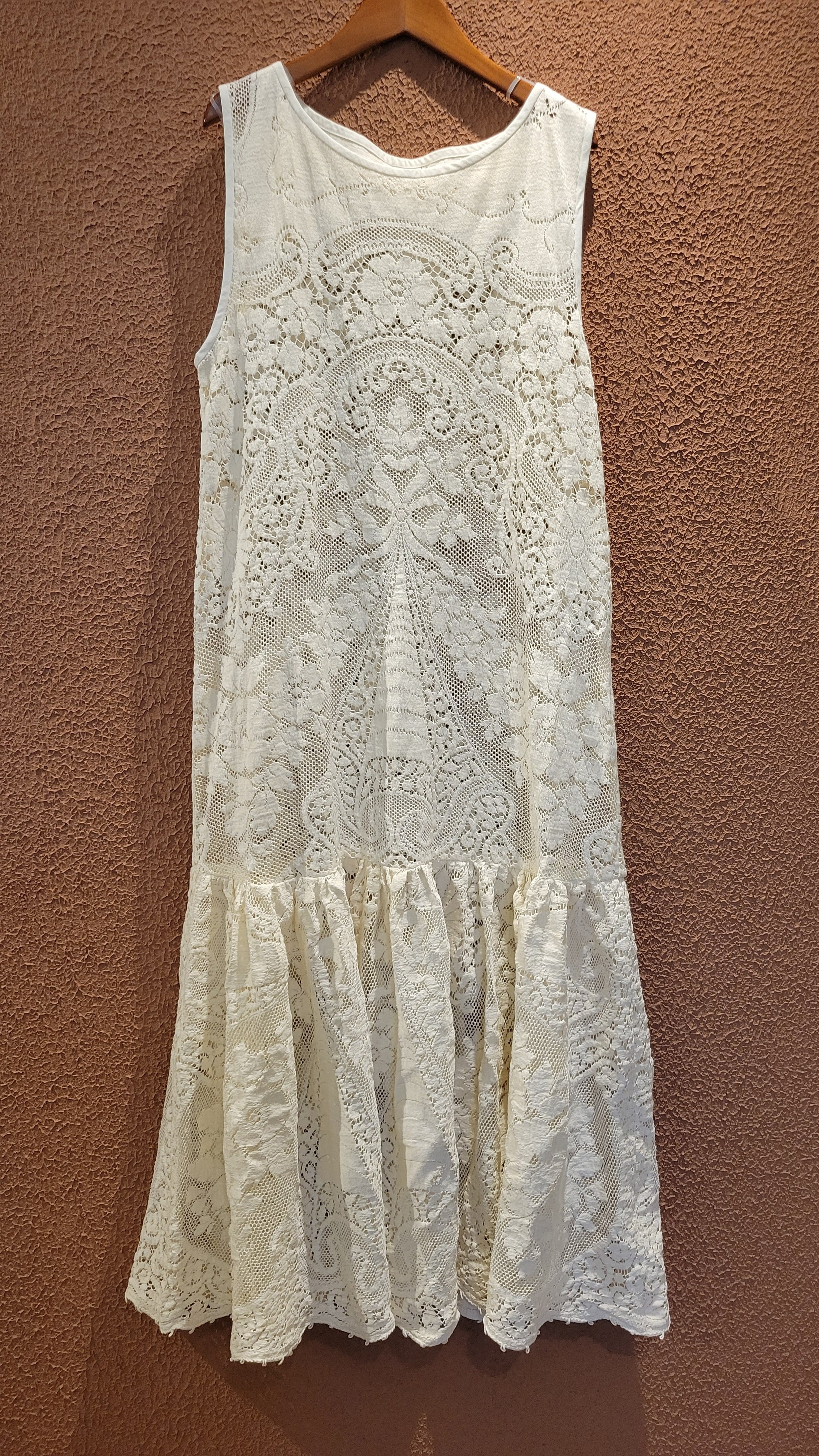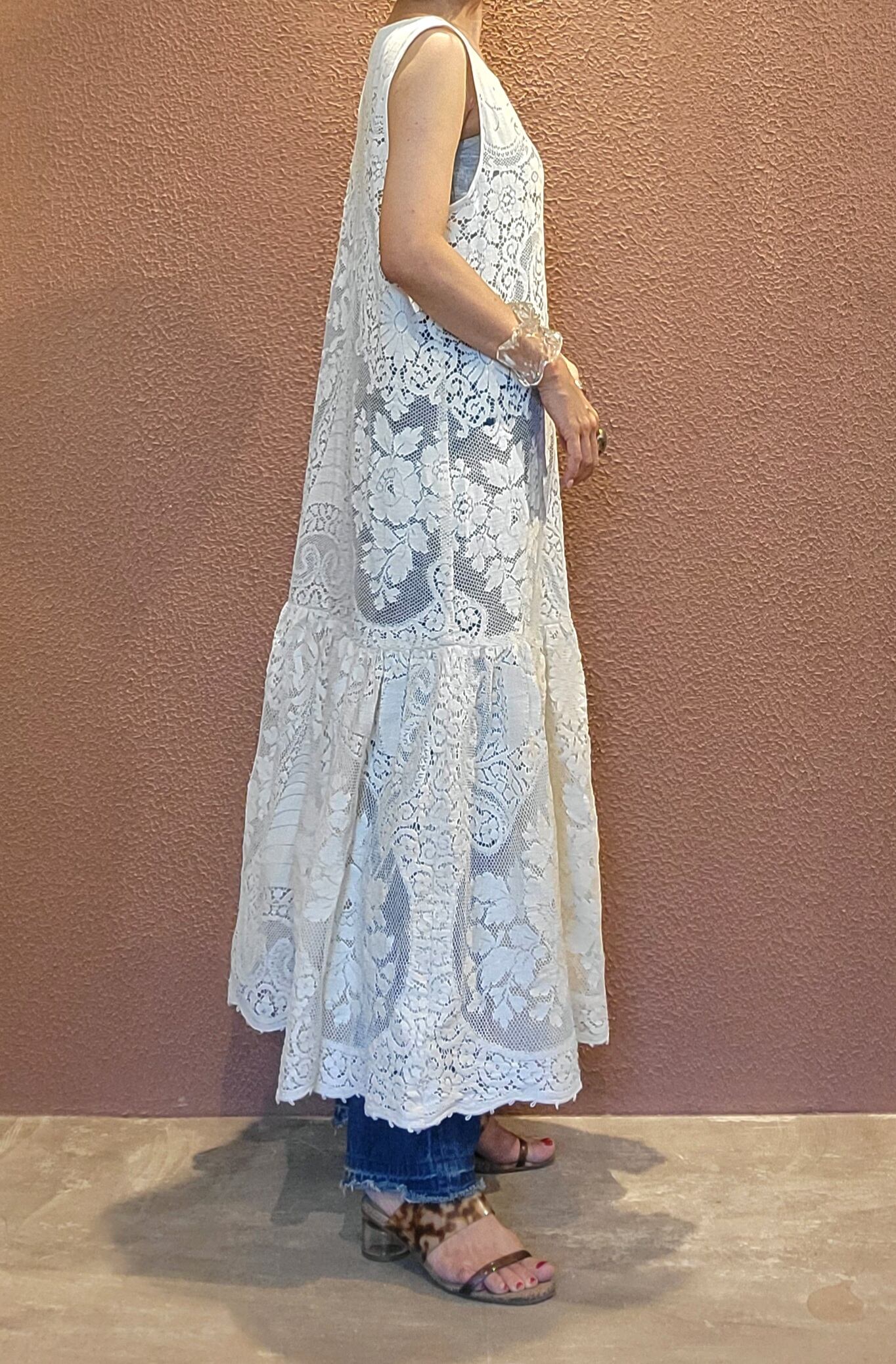 ヴィンテージレースを使用したリメイクワンピース。素材表記はありませんが薄手のコットンのようです。透け感があります。ファスナーは付いておらず頭から被って着用するプルオーバータイプ。アームホール広めなのでインナーの着用が必要です。裾のたっぷりのギャザーがふんわり可愛いらしい印象。甘めのスタイリングはもちろん、デニムに合わせてカジュアルにもスタイリングできます。