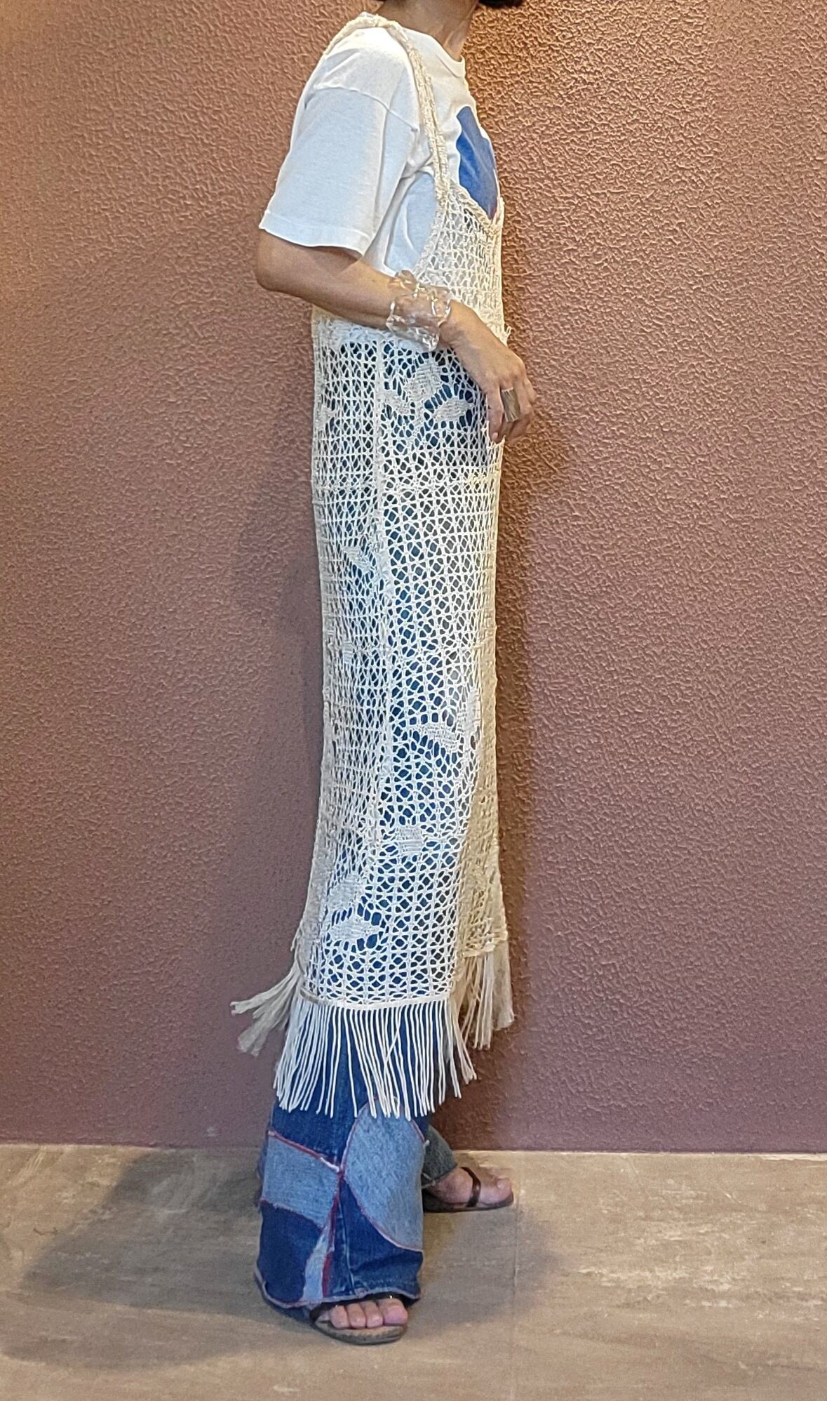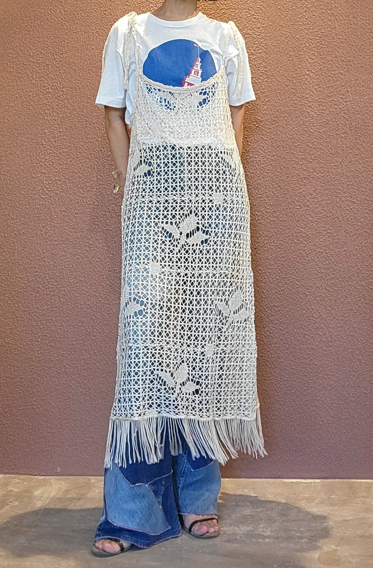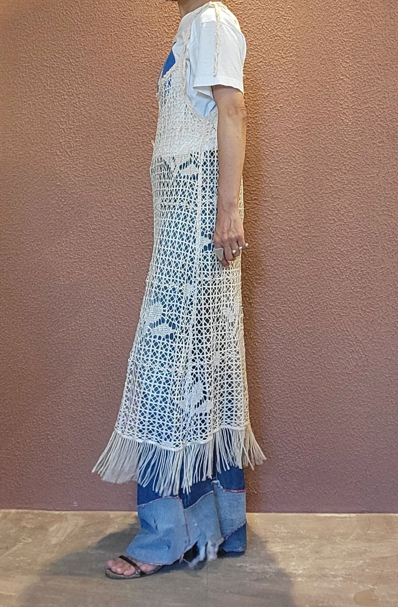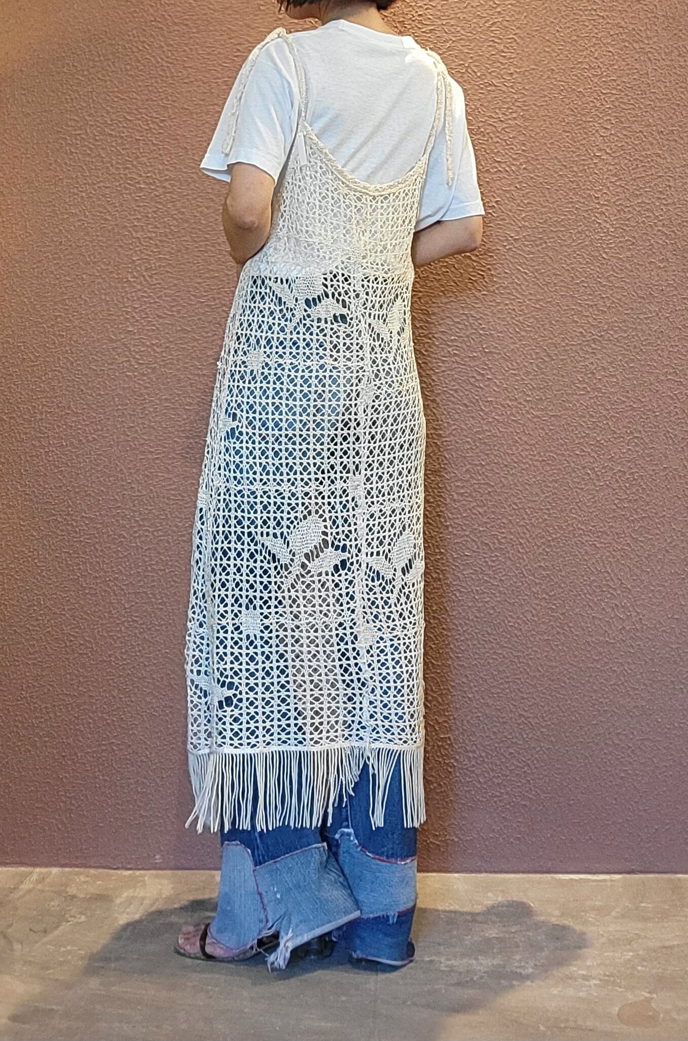 ヴィンテージレースを使用したリメイクワンピース。素材表記はありませんが落ち感があります。。落ち感のある素材です。裏地無し。肩紐を結ぶ位置で着丈を調整できます。色々なアイテムにレイヤードしてお楽しみいただけます。*後ろ裾中央のフリンジが短くなっています。画像でご確認ください。