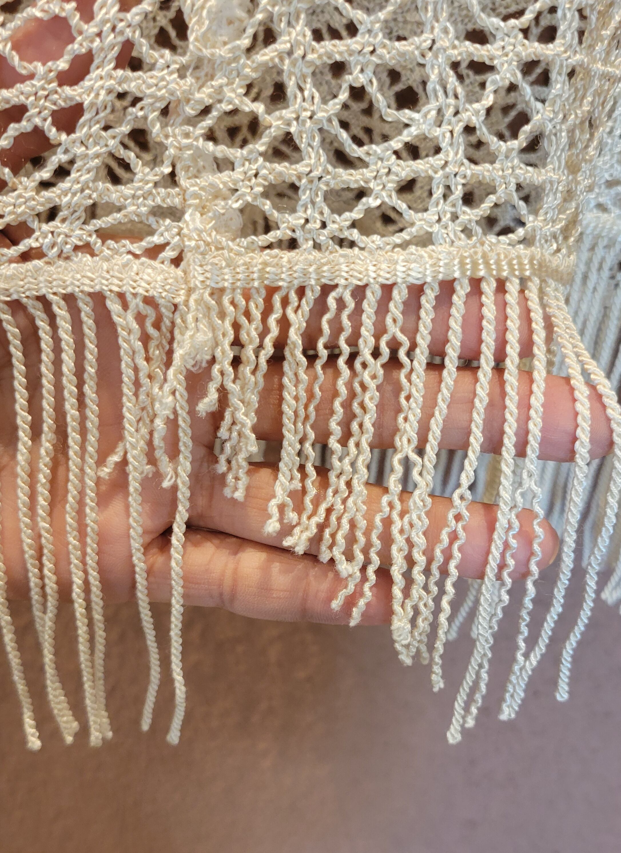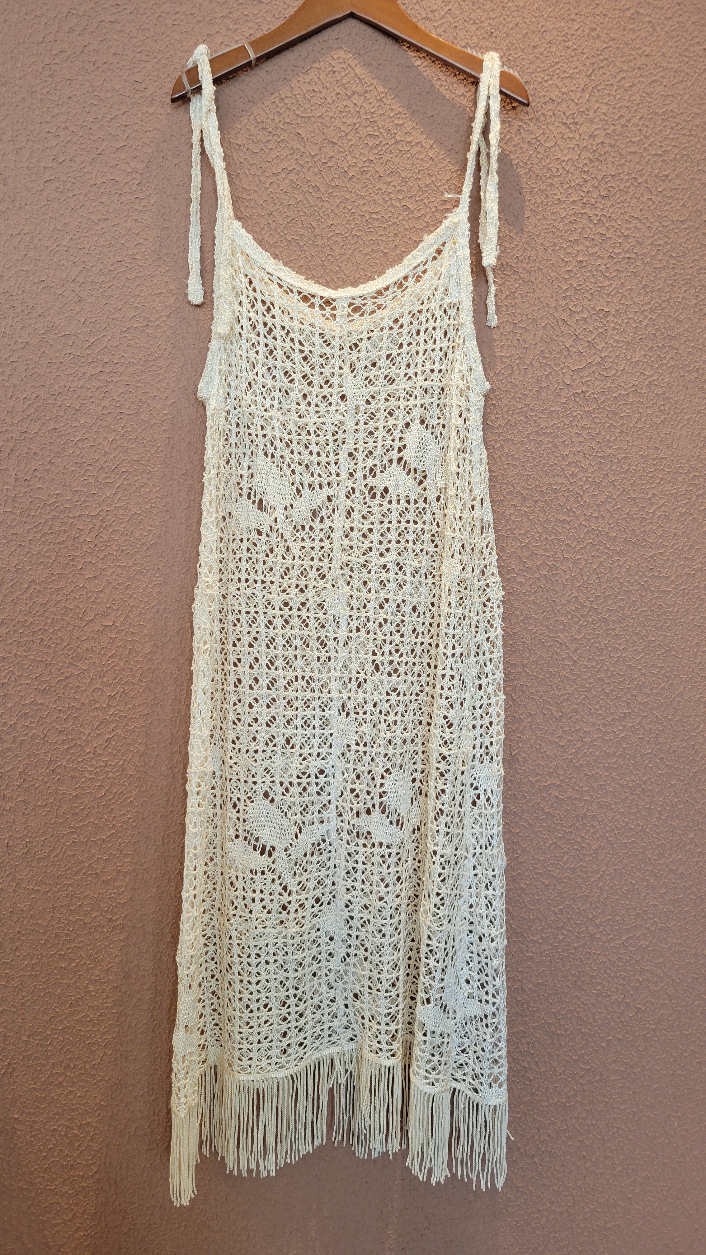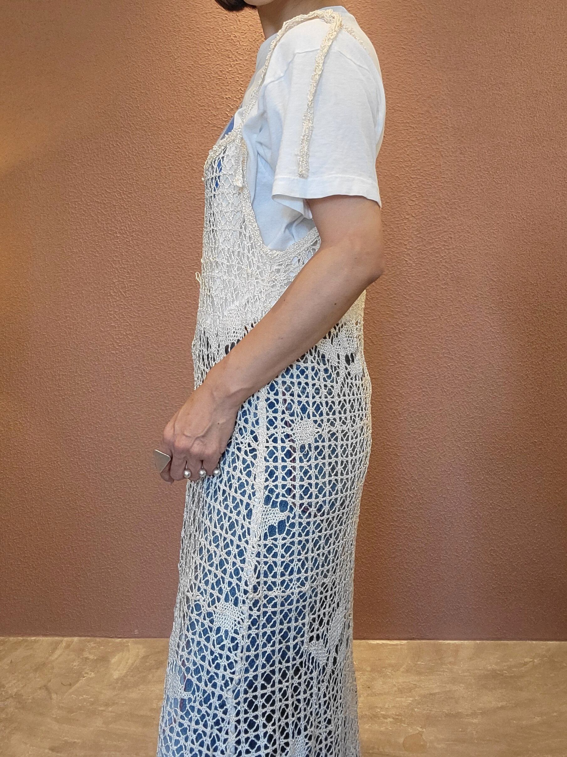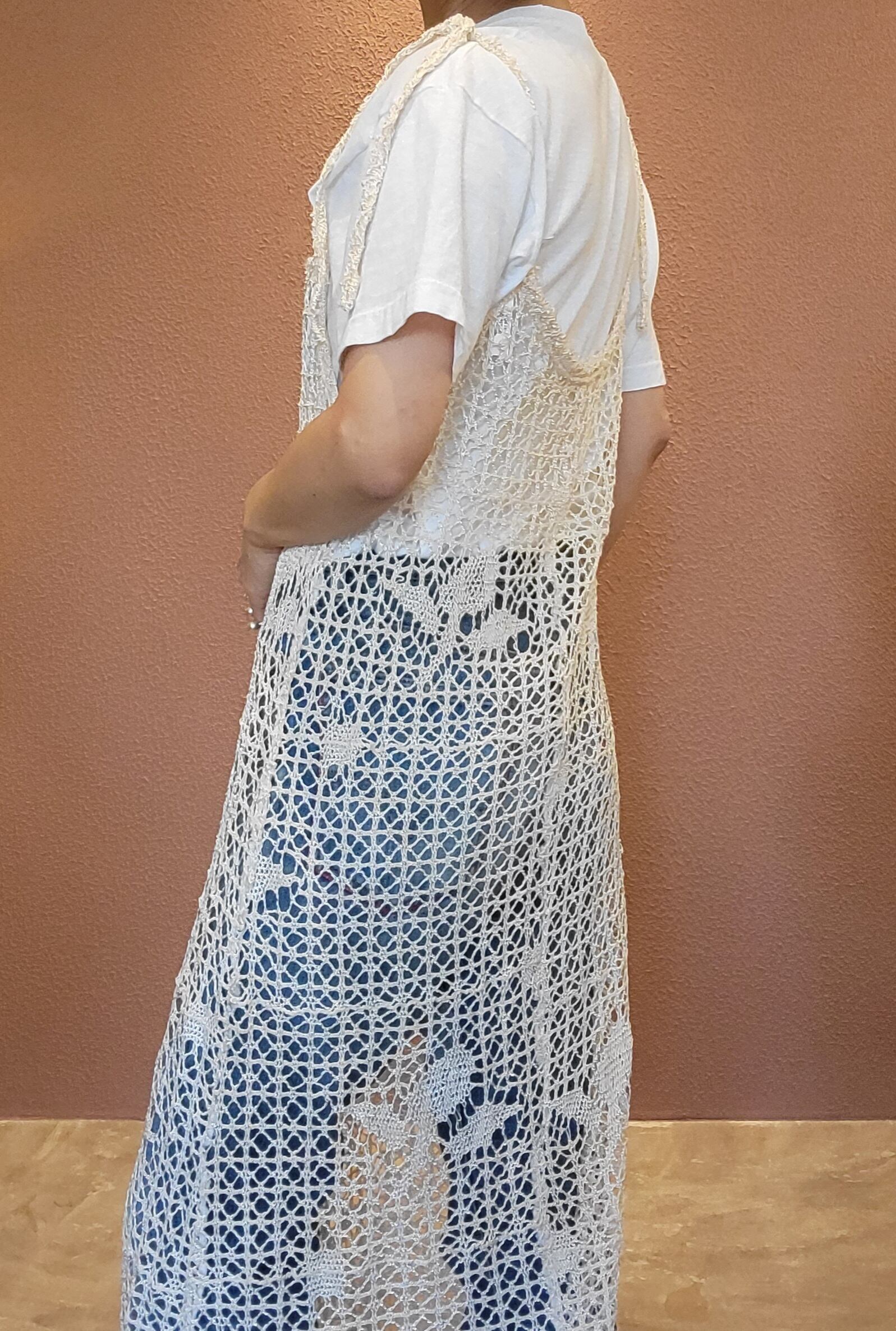 ヴィンテージレースを使用したリメイクワンピース。素材表記はありませんが落ち感があります。。落ち感のある素材です。裏地無し。肩紐を結ぶ位置で着丈を調整できます。色々なアイテムにレイヤードしてお楽しみいただけます。*後ろ裾中央のフリンジが短くなっています。画像でご確認ください。