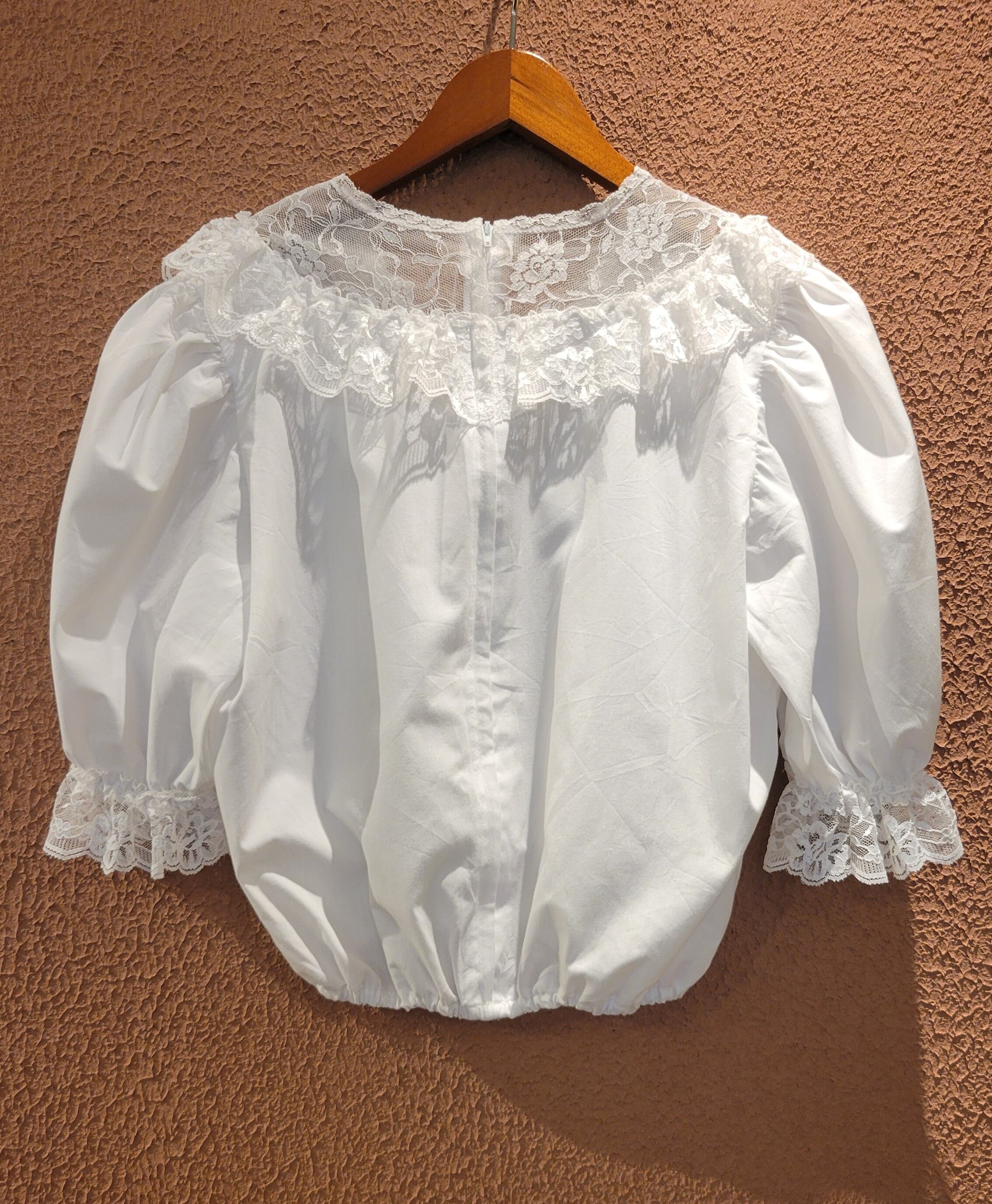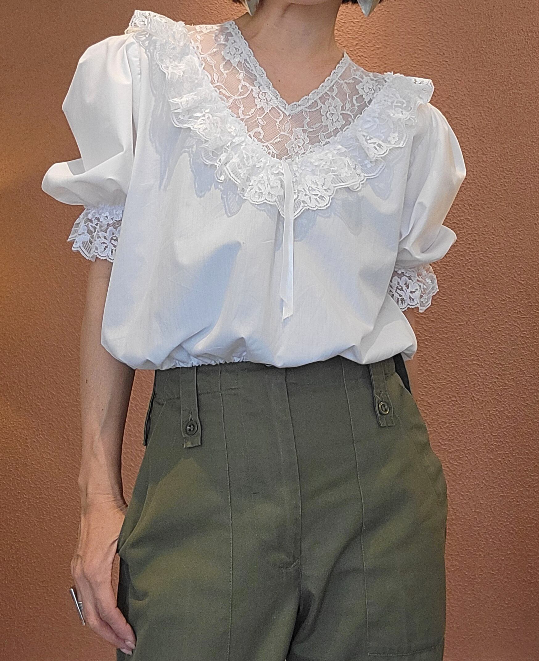Made in USA ヴィンテージブラウス。素材はポリエステル65% コットン35%です。バックファスナー付き。デニムやミリタリーパンツとの相性抜群です。短めの丈でハイウエストのボトムとバランス良く着用できます。